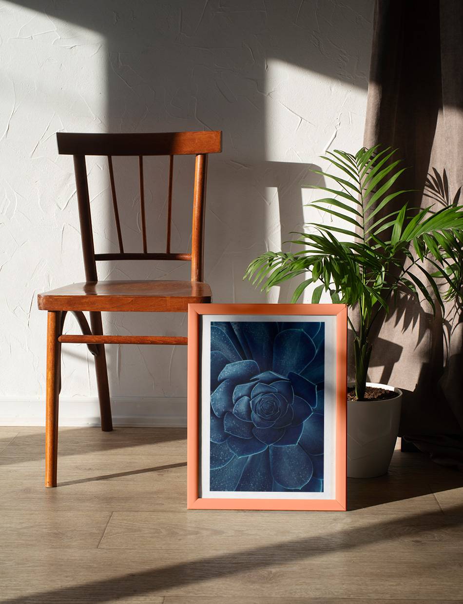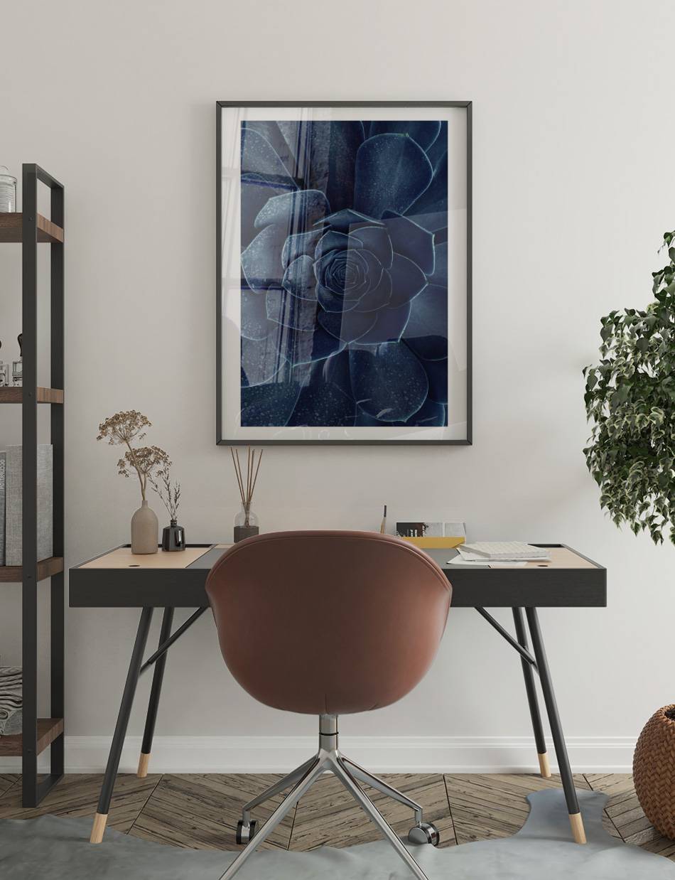 Dyk ned i indigos dybder med denne plakat, der fremviser en blomst i rige indigoblå nuancer. En kraftfuld og mystisk tilføjelse, der vil tilføre karakter og dybde til ethvert rum.