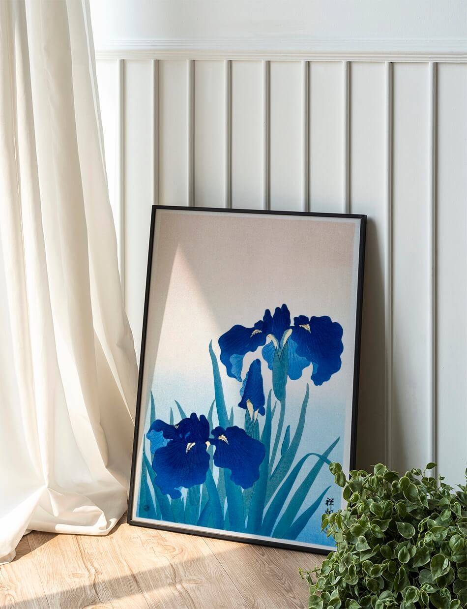 Iris Flowers, skabt af Ohara Koson, viser en gruppe af elegante blå irisblomster i fuld flor. Blomsternes dybe blå farver står i smuk kontrast til den blide gradient baggrund, hvilket fremhæver deres delikate kronblade og fine detaljer. De lange, grønne stilke og blade skaber en følelse af højden og elegance. Kosons mesterlige brug af farver og linjer fanger irisens naturlige skønhed og harmoni. Dette maleri er en hyldest til naturens kunstneriske perfektion og den stille glæde ved at betragte blomster.