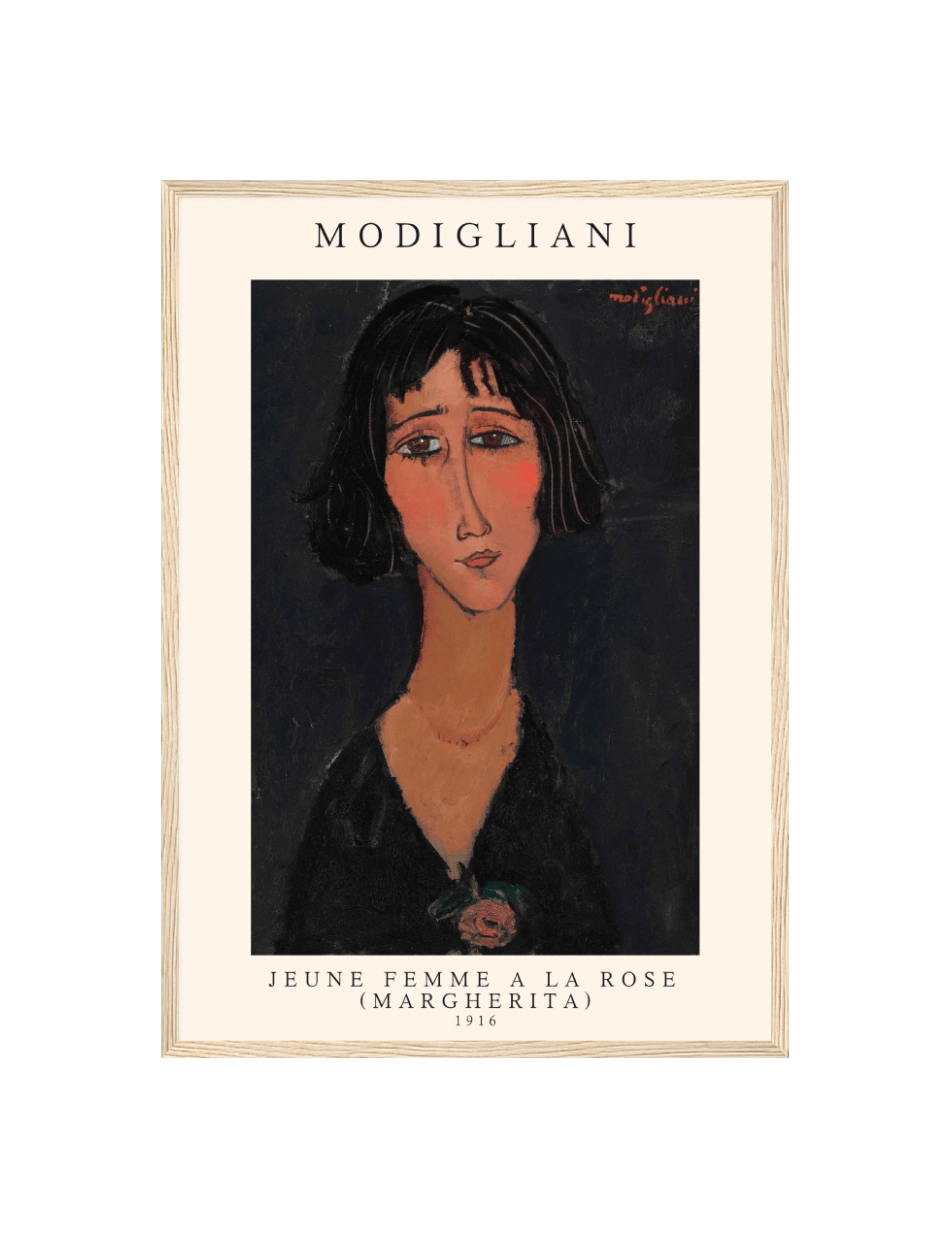 Amedeo Modiglianis “Jeune femme a la rose (Margherita)” (1916) skildrer en ung kvinde med et følsomt og tankefuldt udtryk. Hendes store, udtryksfulde øjne og lange, elegante hals er karakteristiske træk i Modiglianis portrætter. Kvindens mørke hår og sorte kjole står i kontrast til hendes lyse hud, mens den lille rose ved hendes bryst tilføjer et delikat touch af farve og symbolik. Dette værk fremhæver Modiglianis evne til at indfange den indre skønhed og kompleksitet hos sine modeller, hvilket gør det til et tidløs og fængslende portræt.
