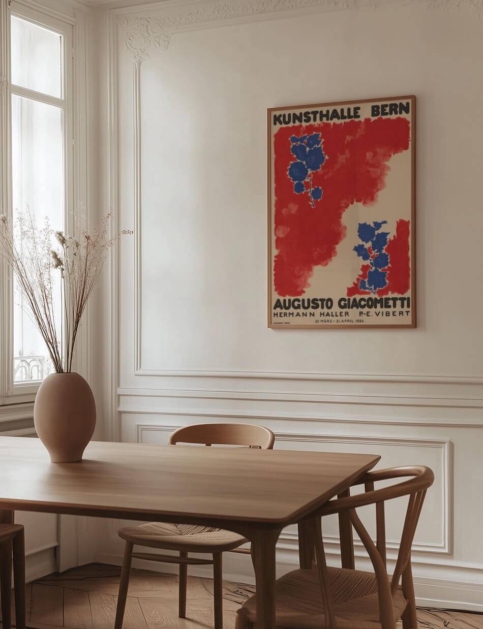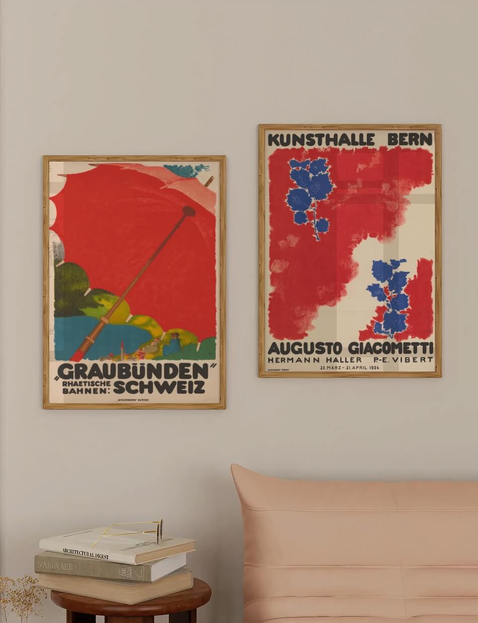 Med rødder i Art Nouveau og symbolisme formår Giacometti at bringe liv til sine motiver – fra blomstrende sommerenge til dristige grafiske former. Hans plakater fanger øjet med klare kontraster, som de varme gule, røde og blå nuancer, der skaber en følelse af glæde, elegance og tidløshed. Giacomettis arbejde er ikke blot kunst, men et visuelt festfyrværkeri, der bringer en moderne, abstrakt charme til ethvert rum.