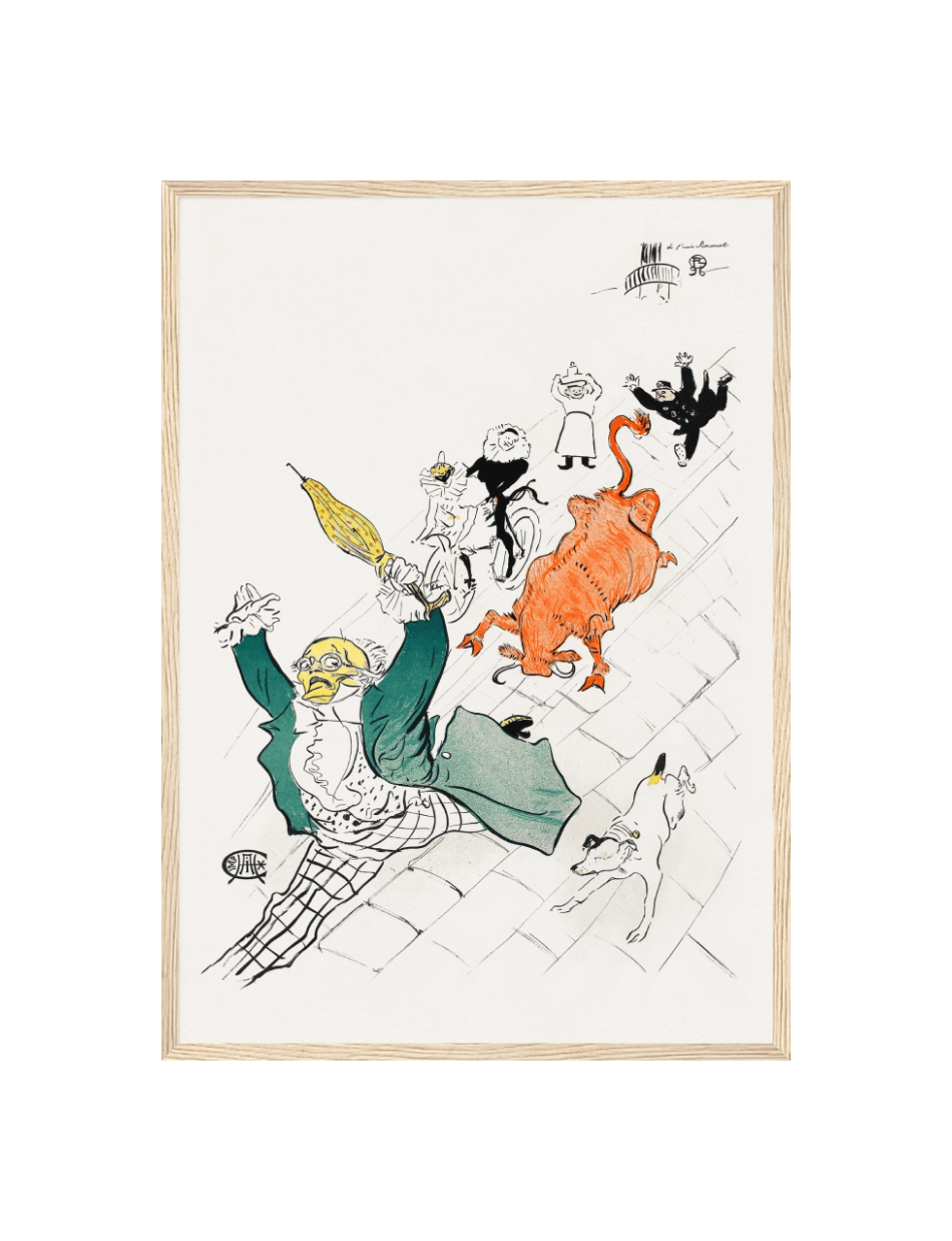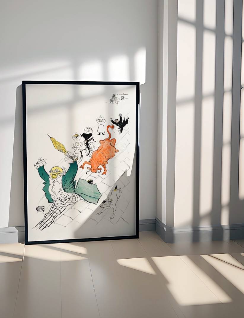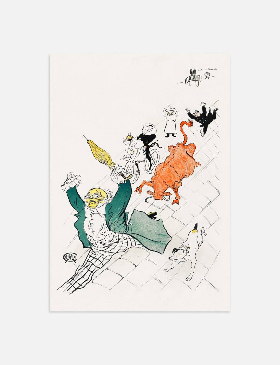 Oplev ‘La Vache Enragée’, et mesterværk af Henri de Toulouse-Lautrec, der med sin farverige og livlige illustration fanger det parisiske nattelivs dynamik og karakterer. Denne plakat, der fremstiller en grønklædt figur med et overrasket udtryk og en stor orange figur, der ligner en vred ko, er et eksempel på Toulouse-Lautrecs evne til at skildre livets teater med humor og skarphed. Perfekt for samlere og beundrere af Belle Époque-periodens kunst.