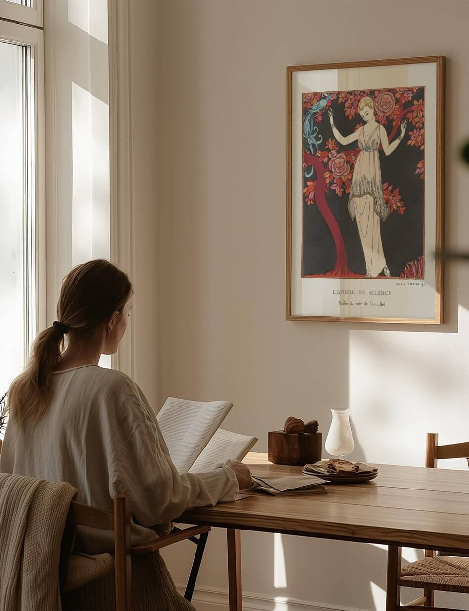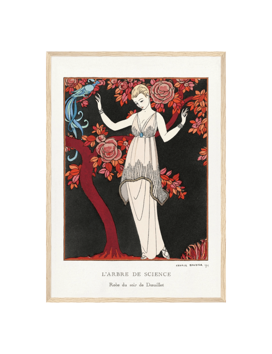 L’Arbre de Science af George Barbier viser en yndefuld kvinde iført en sofistikeret aftenkåbe. Kvinden står under et rigt dekoreret træ med frodige blomster og en farverig fugl, som symboliserer visdom og skønhed. Kjolens delikate detaljer og elegante snit fremhæver kvindens skønhed og giver et indtryk af tidens mode og stil. Dette kunstværk indfanger en magisk scene, hvor naturens skønhed og menneskets elegance smelter sammen i en harmonisk og fortryllende komposition.