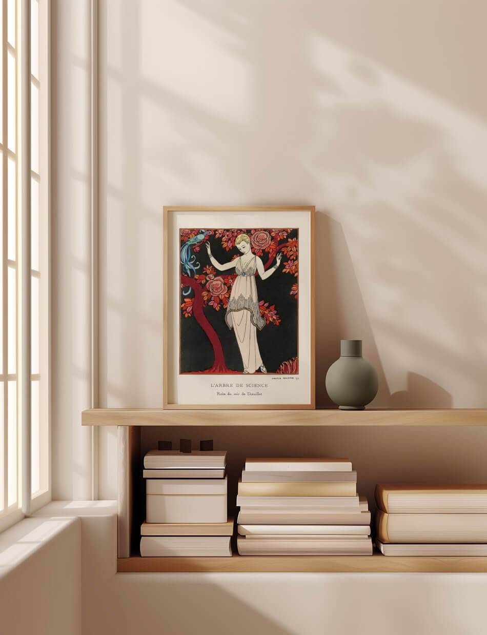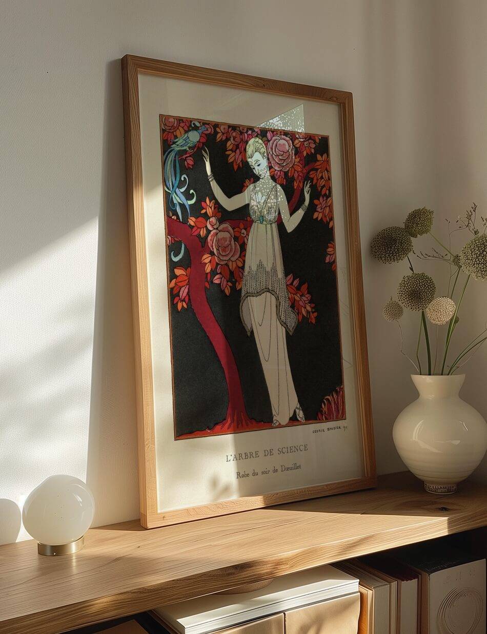 L’Arbre de Science af George Barbier viser en yndefuld kvinde iført en sofistikeret aftenkåbe. Kvinden står under et rigt dekoreret træ med frodige blomster og en farverig fugl, som symboliserer visdom og skønhed. Kjolens delikate detaljer og elegante snit fremhæver kvindens skønhed og giver et indtryk af tidens mode og stil. Dette kunstværk indfanger en magisk scene, hvor naturens skønhed og menneskets elegance smelter sammen i en harmonisk og fortryllende komposition.