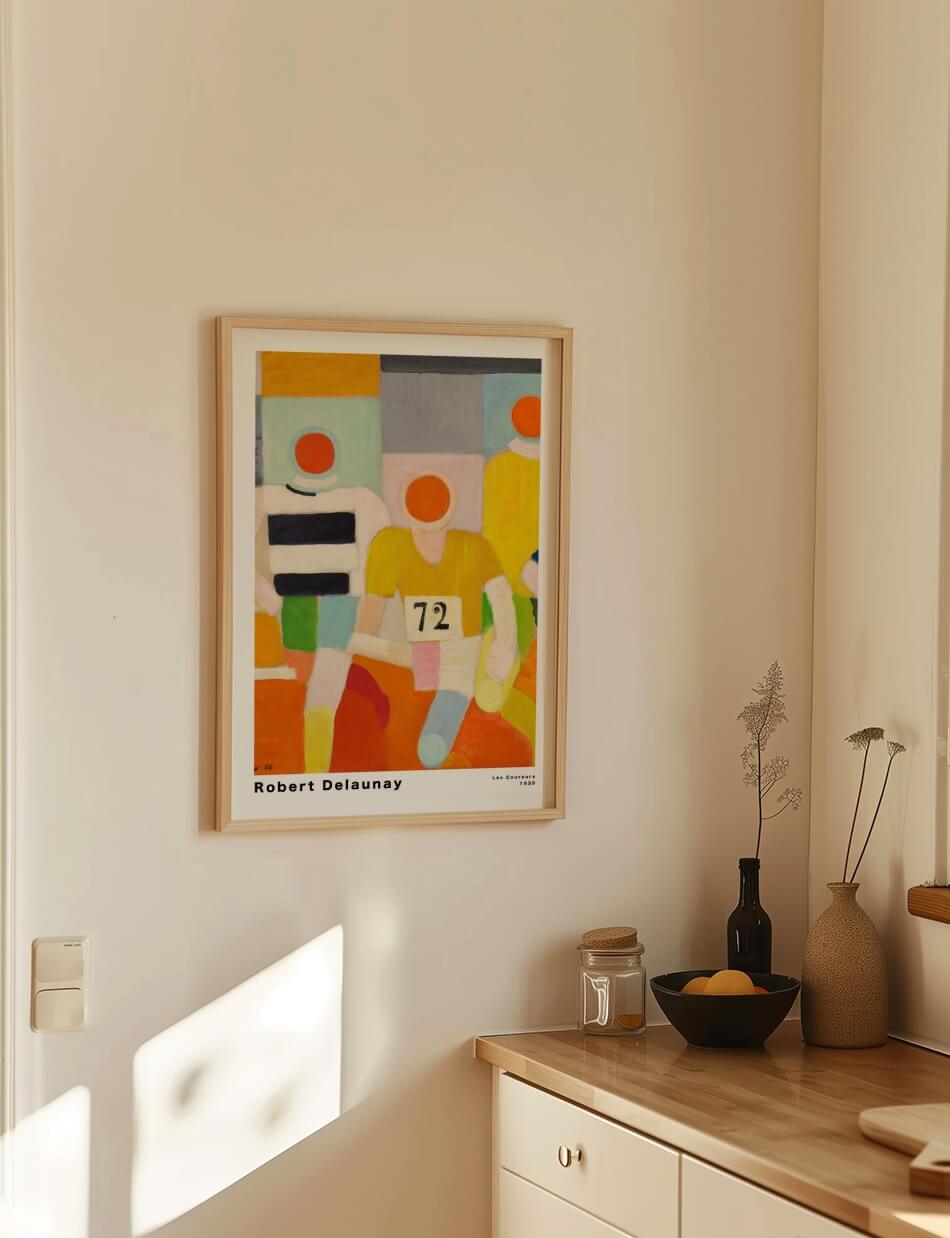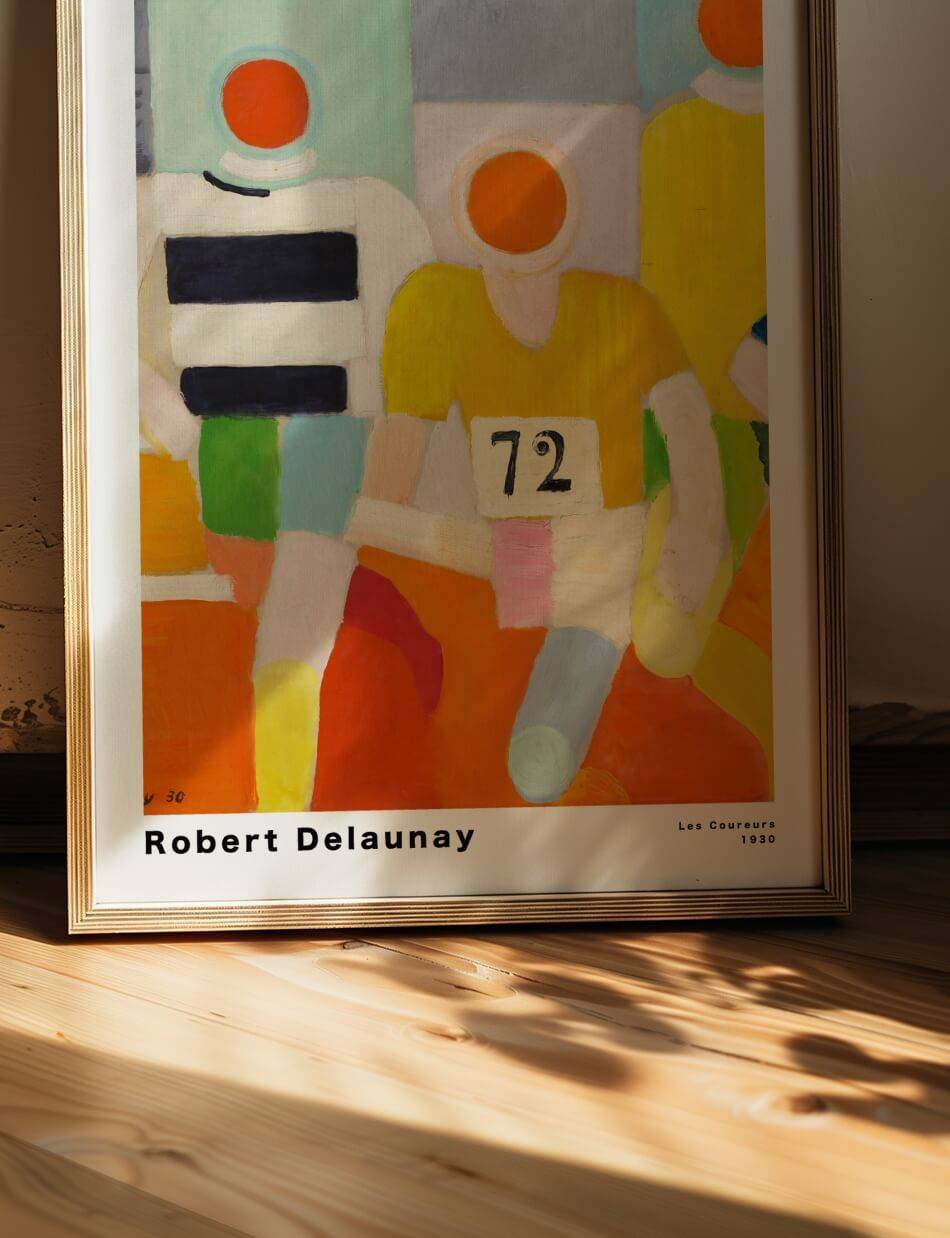 Les Coureurs’ af Robert Delaunay skildrer energien og bevægelsen i løb gennem livlige farver og geometriske former. Værket fremviser løbere i stærke, kontrasterende nuancer, hvilket skaber en følelse af dynamik og fremdrift. De abstrakte figurer og klare farvefelter fremhæver både individuelle karaktertræk og den kollektive ånd i sportsbegivenheden. Delaunay’s brug af farve og form giver værket en moderne og tidløs kvalitet, der fanger øjeblikkets intensitet og glæde ved konkurrence og motion.
