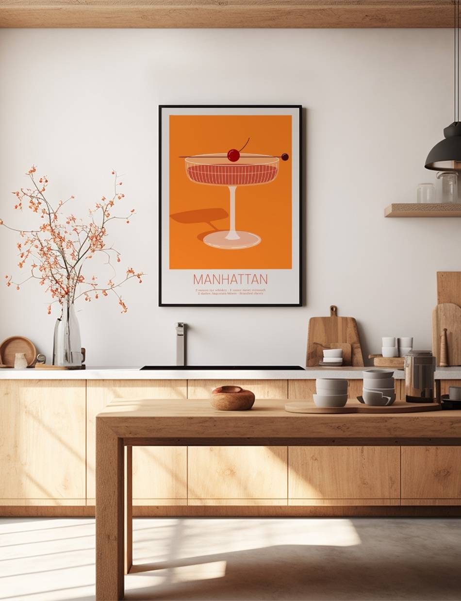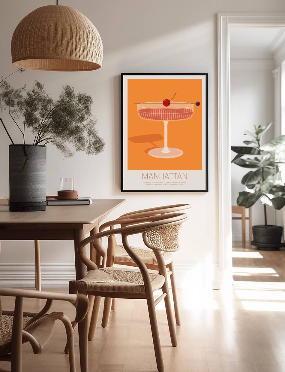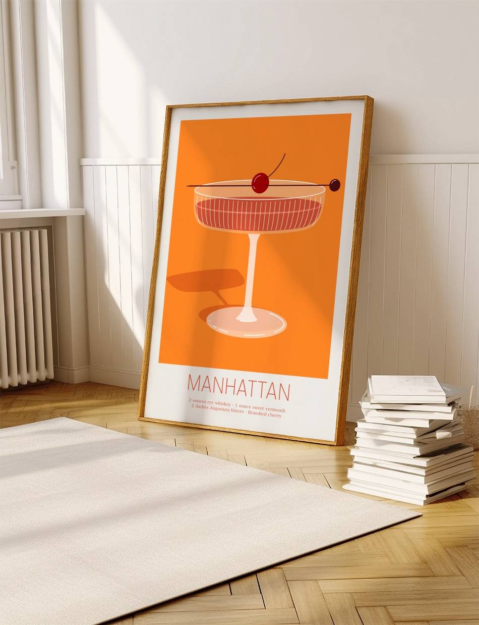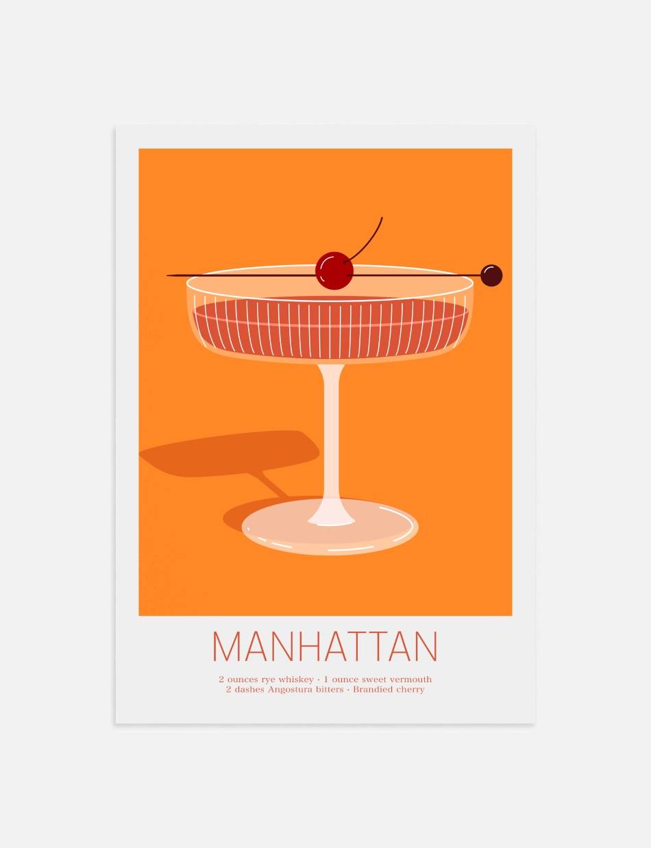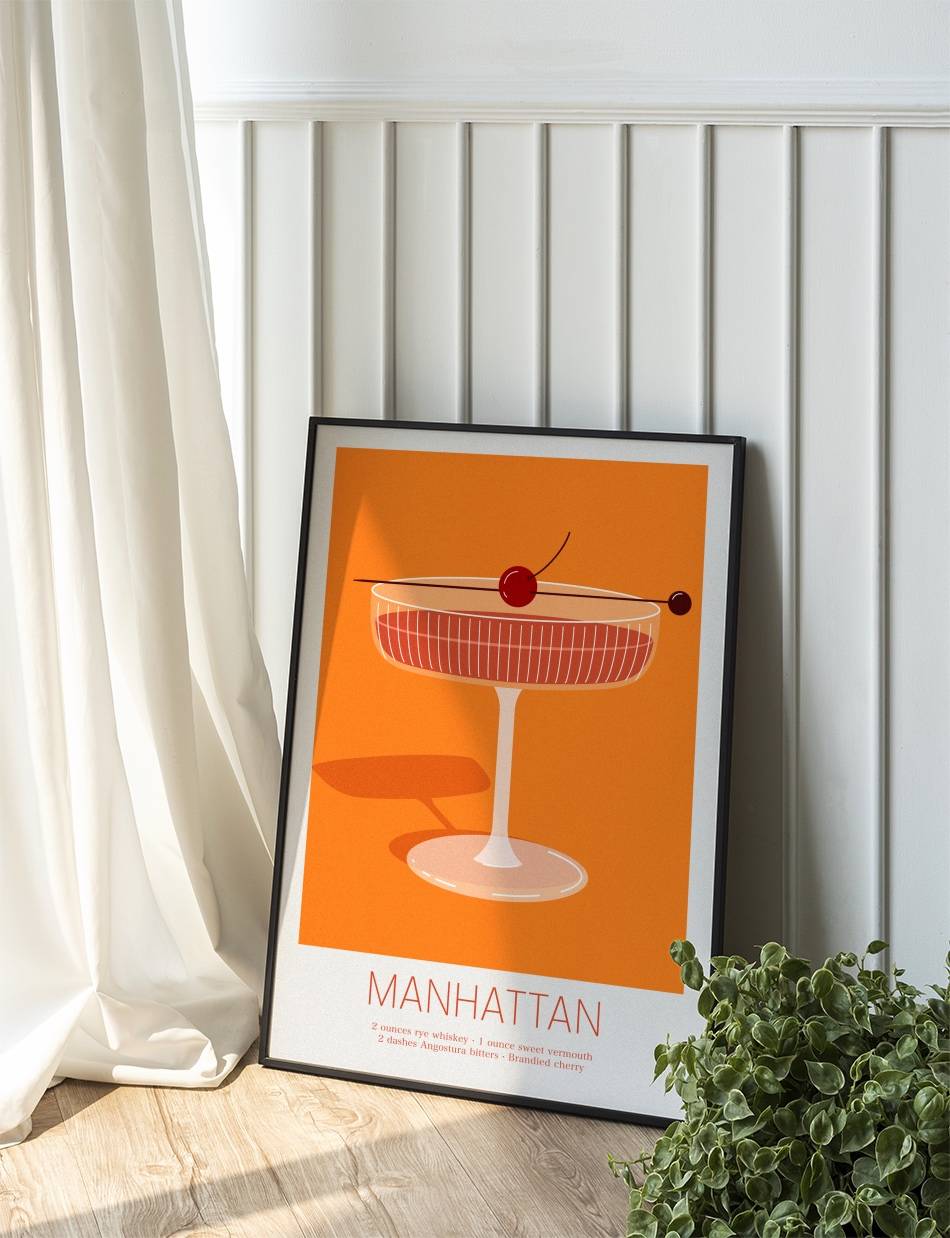 Vores ‘Manhattan’ cocktail plakat er en hyldest til den ikoniske cocktail, som har været en favorit for mange gennem tiderne. Dens rige farver og stilfulde design indfanger essensen af en aften i byen.