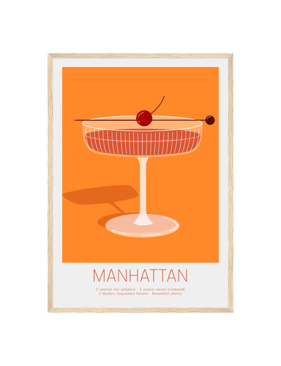 Vores ‘Manhattan’ cocktail plakat er en hyldest til den ikoniske cocktail, som har været en favorit for mange gennem tiderne. Dens rige farver og stilfulde design indfanger essensen af en aften i byen.
