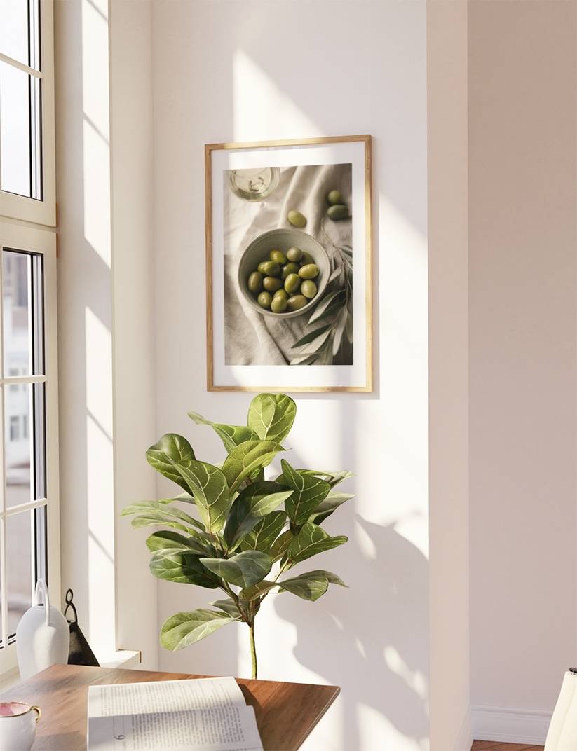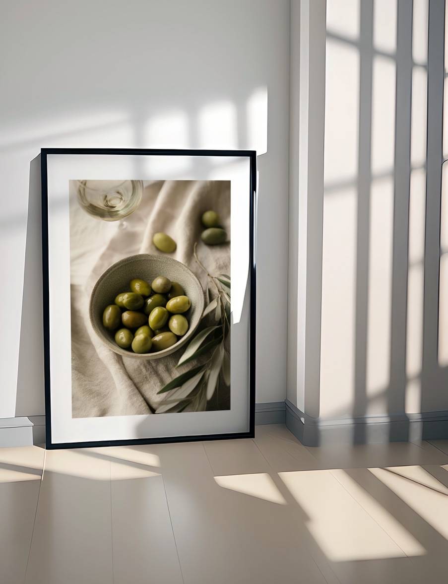 Mediterranean Serenity er en indbydende fotoplakat, der fremhæver den rolige skønhed af Middelhavsregionen. En skål med friske, grønne oliven, anrettet på et rustikt hvidt lærred, udstråler naturlighed og enkelhed. Ved siden af skålen ses et glas vin. Plakaten giver stemning af en afslappet eftermiddag ved Middelhavet og er perfekt til at tilføre et strejf af ro og elegance til ethvert hjem.