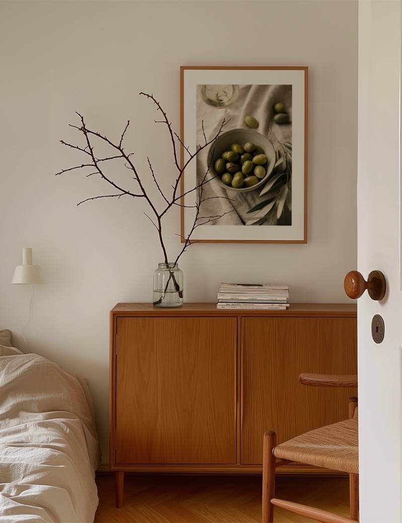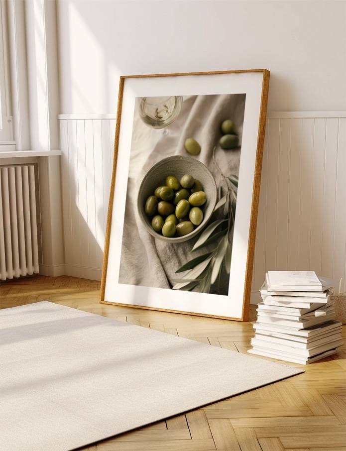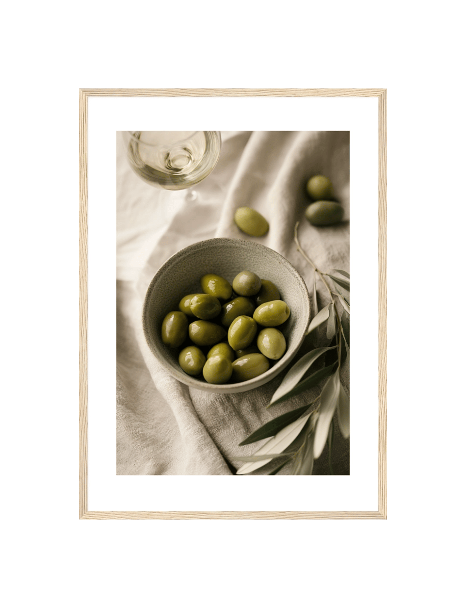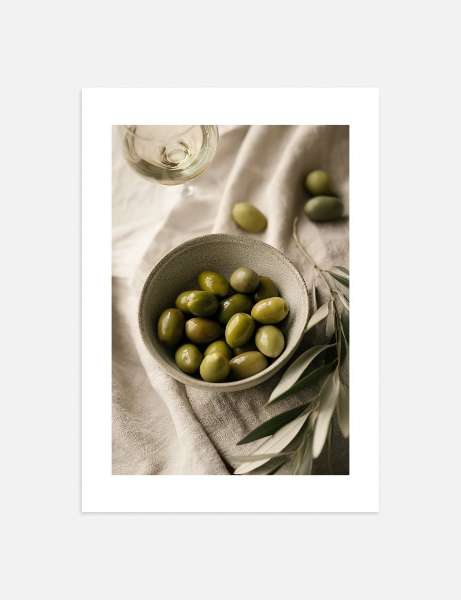 Mediterranean Serenity er en indbydende fotoplakat, der fremhæver den rolige skønhed af Middelhavsregionen. En skål med friske, grønne oliven, anrettet på et rustikt hvidt lærred, udstråler naturlighed og enkelhed. Ved siden af skålen ses et glas vin. Plakaten giver stemning af en afslappet eftermiddag ved Middelhavet og er perfekt til at tilføre et strejf af ro og elegance til ethvert hjem.