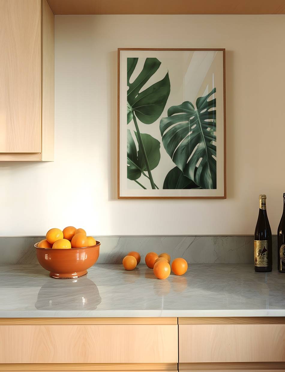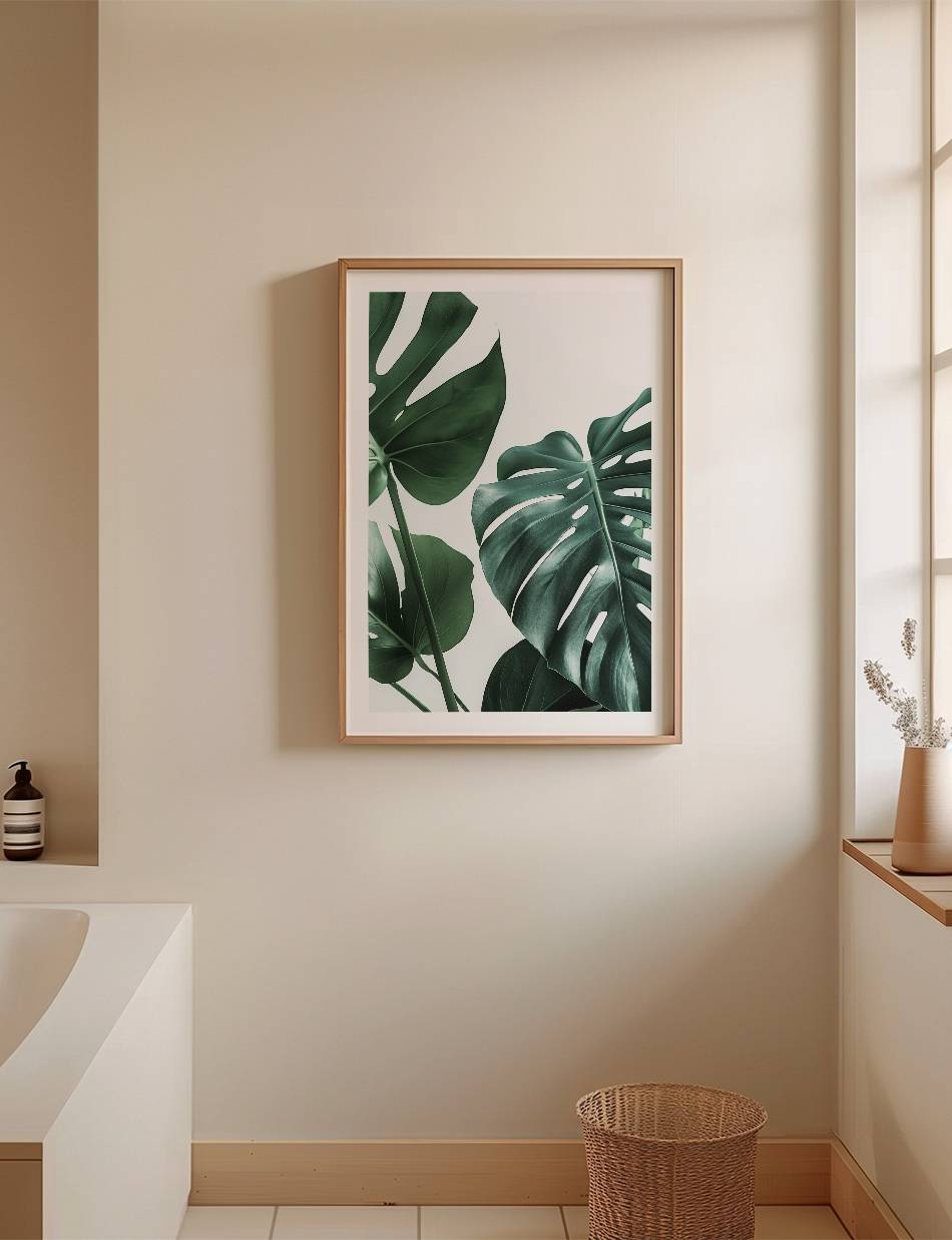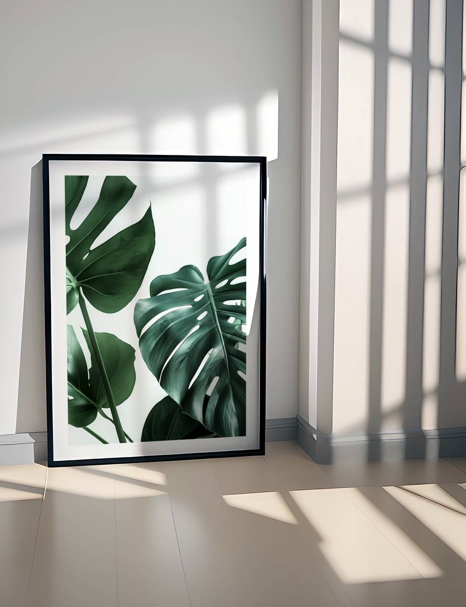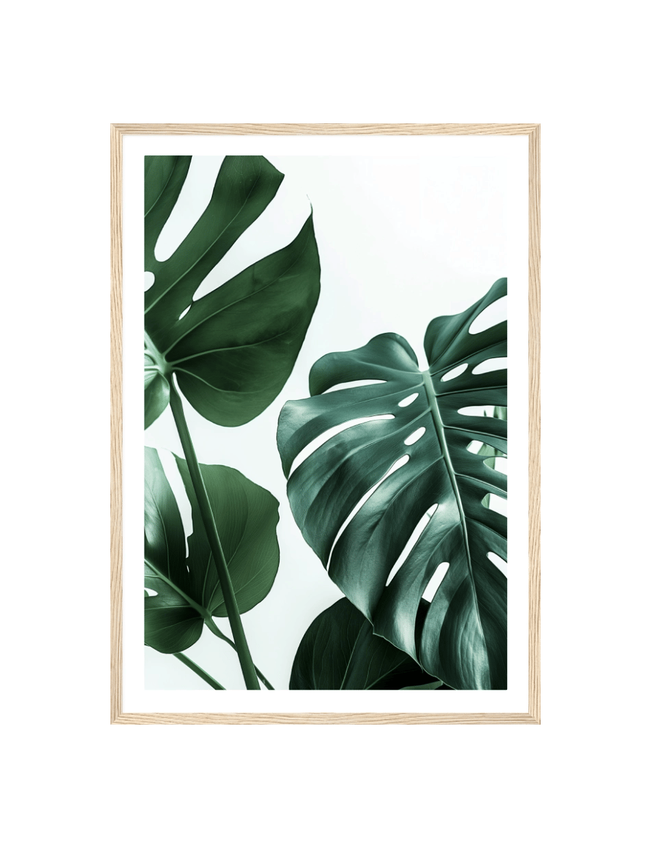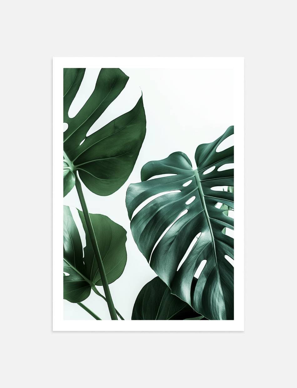 Denne fotoplakat fremhæver den naturlige skønhed og detaljer i Monstera planten. De store, grønne blade med deres karakteristiske huller og sprækker står i kontrast til den lyse baggrund, hvilket skaber en frisk og naturlig stemning.