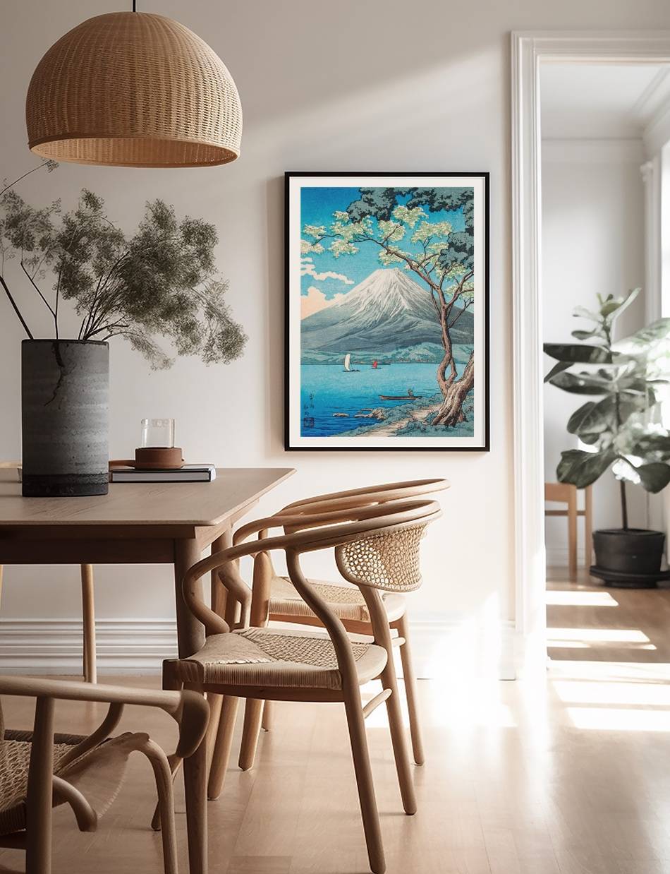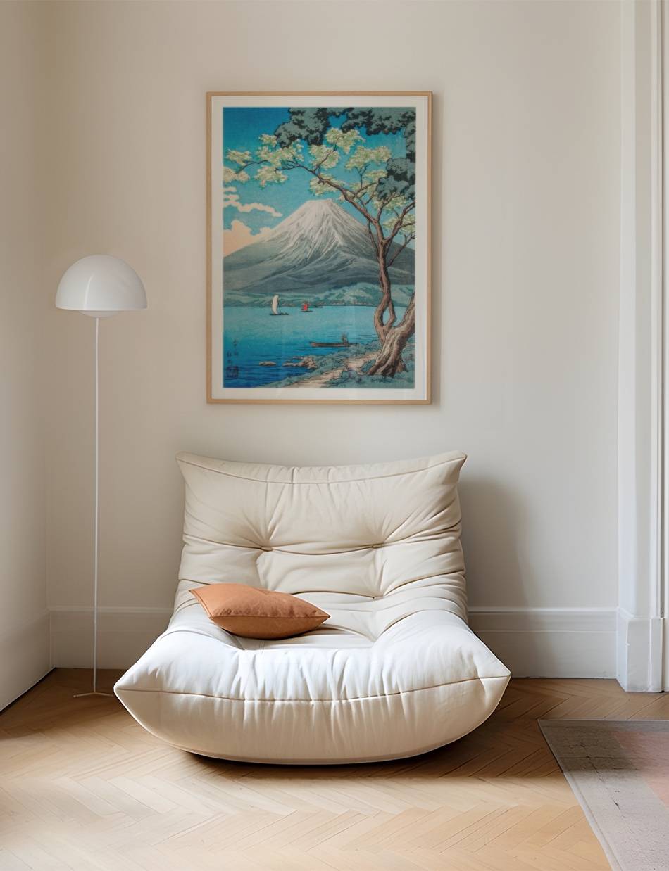Beundr Mount Fuji fra Lake Yamanaka i det bløde morgengry gennem Hiroaki Takahashis betagende perspektiv. Denne plakat indfanger den ikoniske udsigt med en nydelighed og ro, der vil berige ethvert hjem.