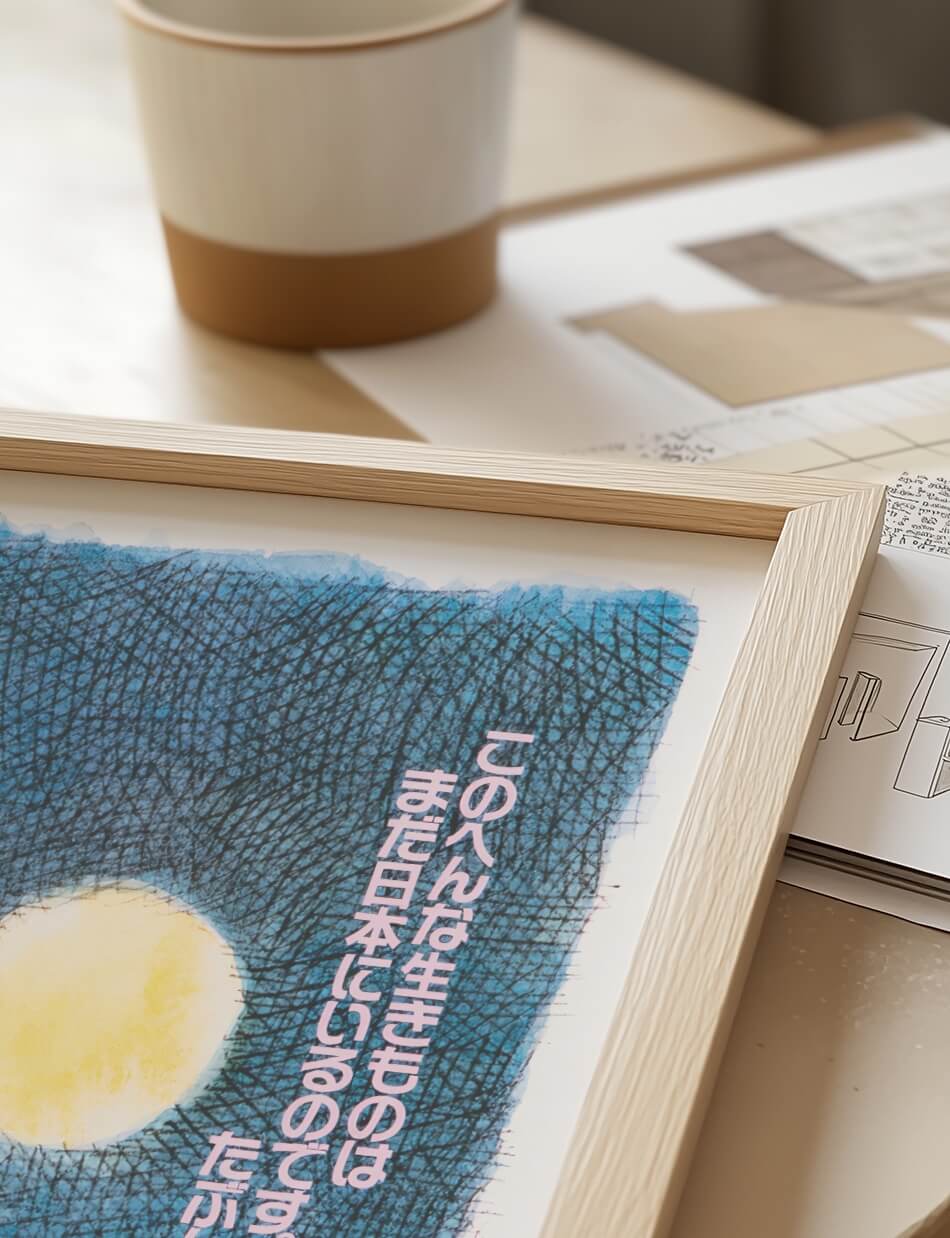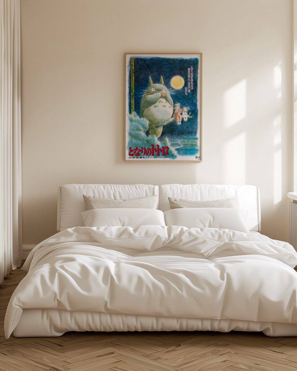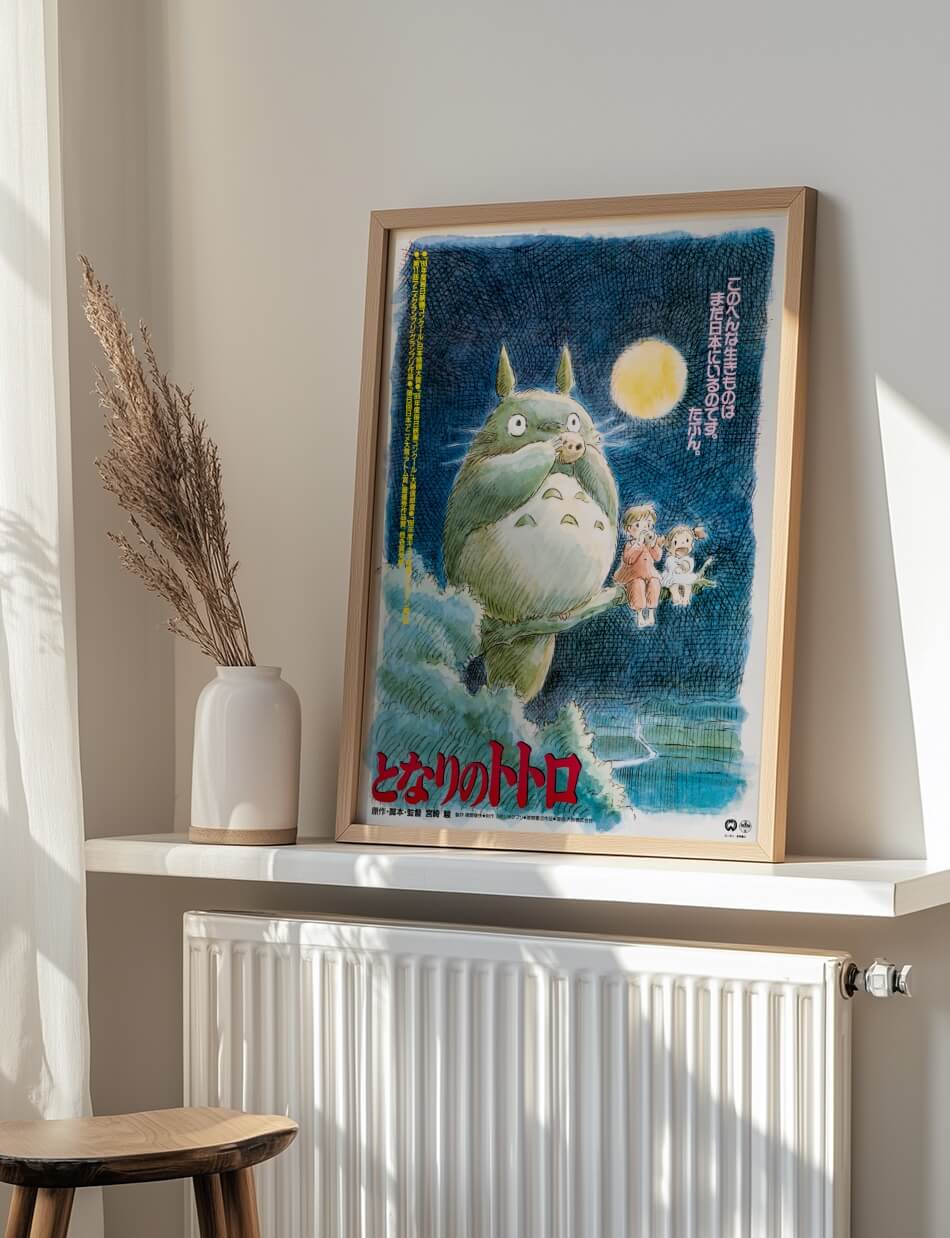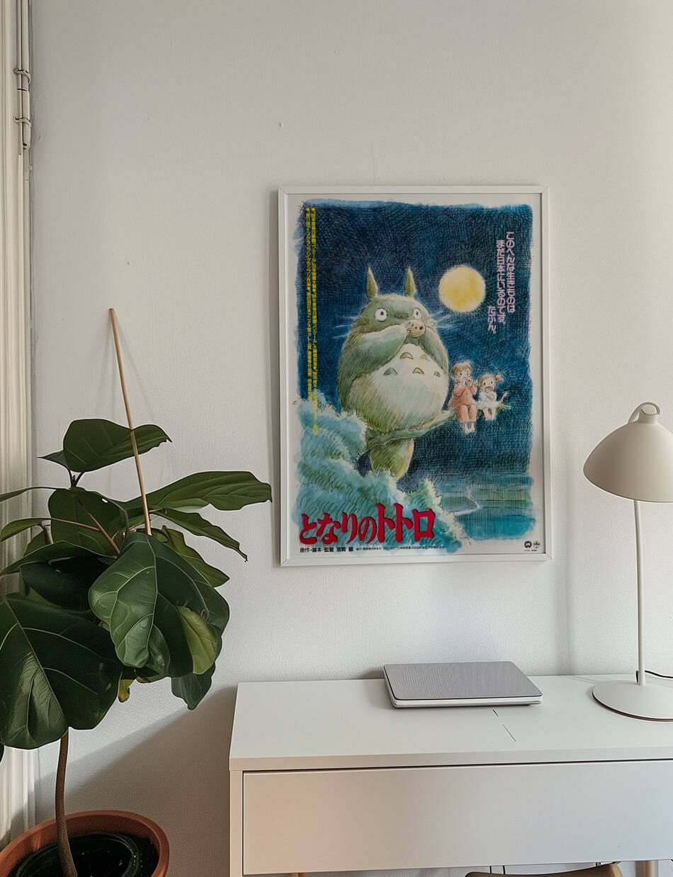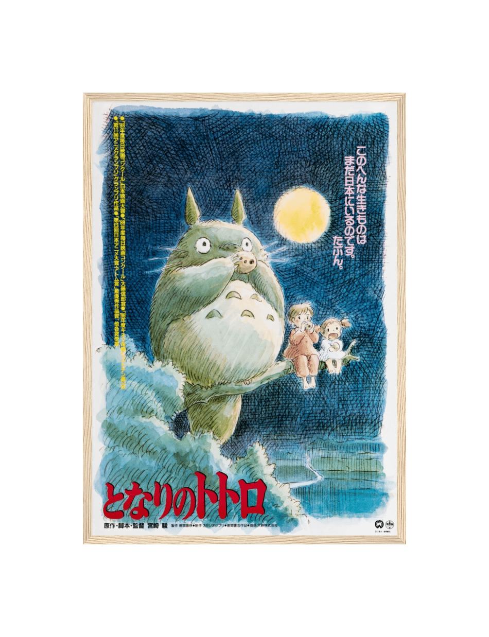 I denne smukke plakat fra Studio Ghibli møder vi Totoro, det elskede skovvæsen, som står på en gren under en lysende fuldmåne. Sammen med ham sidder to børn, som nyder roen i nattens magi. Den detaljerede illustration fanger den dybe forbindelse mellem mennesket og naturen, og Totoro står som et symbol på fantasiverdenens skønhed og mystik.