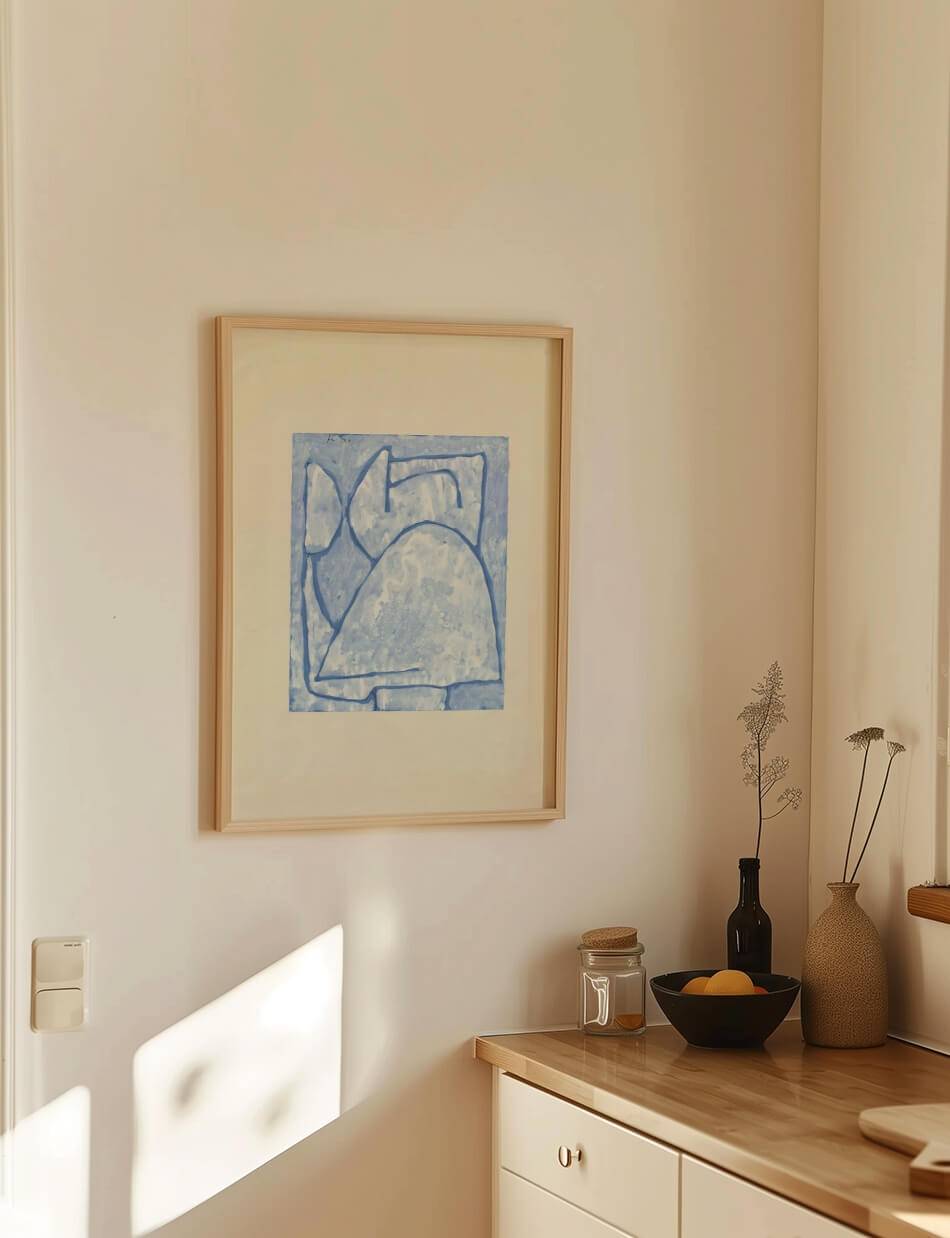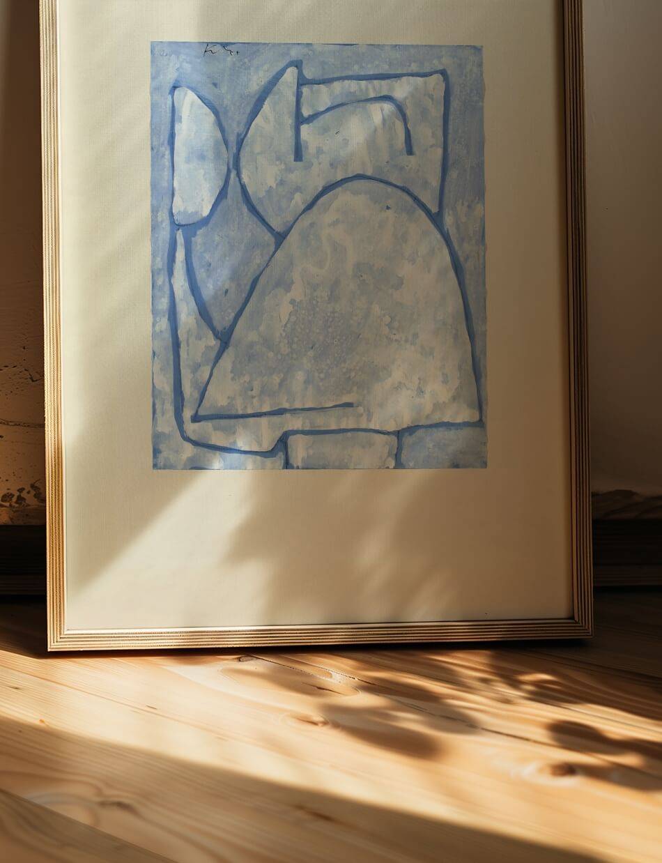 Nach Oben plakaten af Paul Klee er et fascinerende værk, der kombinerer enkle, men udtryksfulde linjer med en beroligende blå farvetone. Værket består af abstrakte former, der synes at bevæge sig opad, hvilket skaber en følelse af opstigning og vækst. Klees subtile brug af tekstur og farvevariationer giver dybde til kompositionen, mens de flydende linjer indbyder til refleksion og fortolkning. Dette maleri fremhæver Klees evne til at skabe komplekse følelser gennem minimalistisk design og farvebrug.