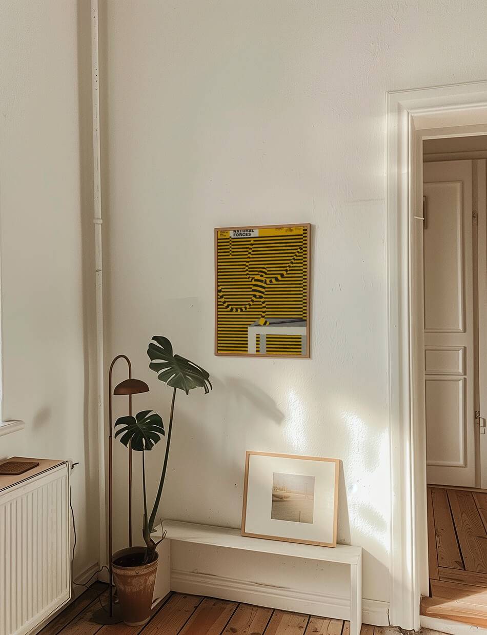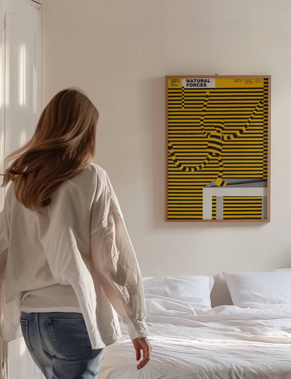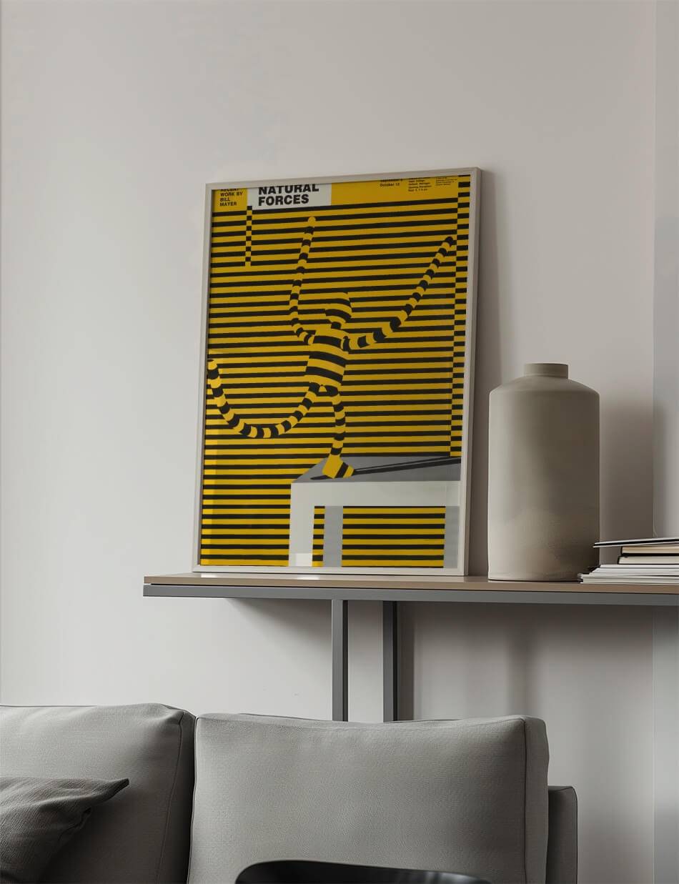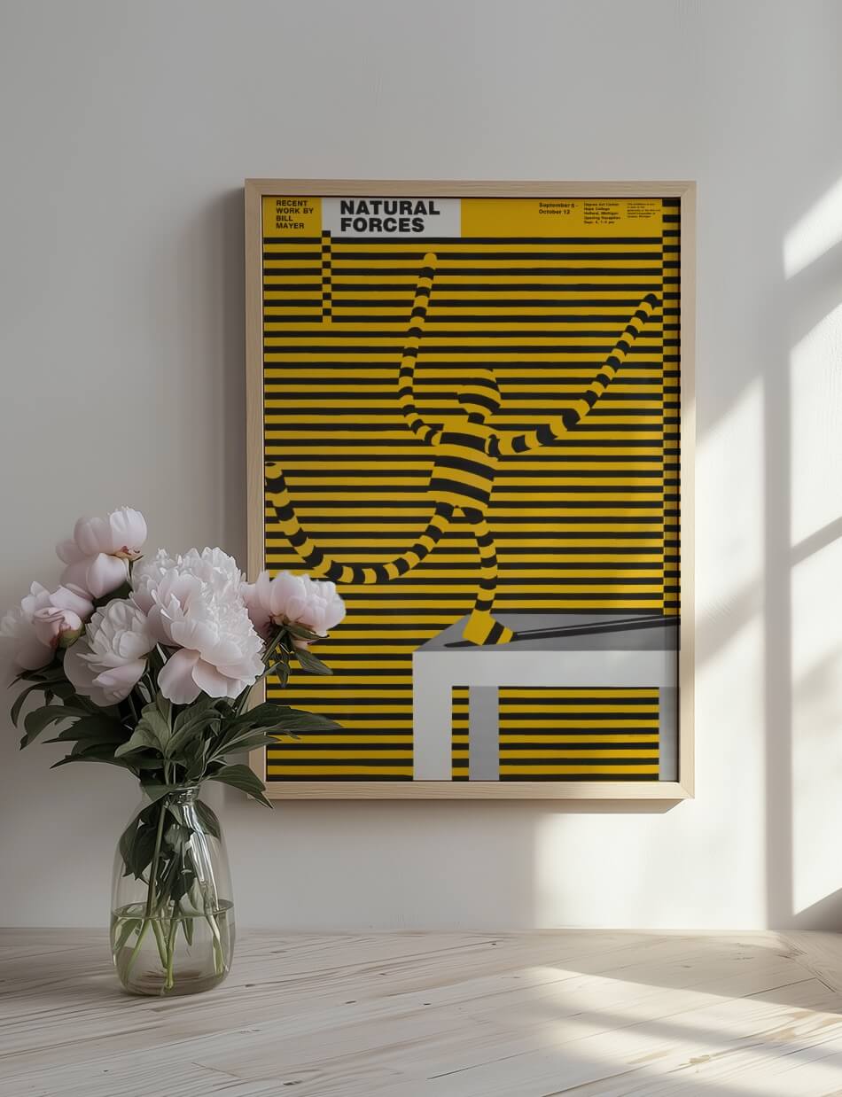 Lanny Sommeses ‘Natural Forces’ (1981) er et optisk fængende værk, hvor en abstrakt menneskelig figur er fanget i et dynamisk mønster af sorte og gule striber. Figuren synes at være underlagt naturens kræfter, dens form forvrænget og strukket i en endeløs dans. Plakaten er en visuel metafor for menneskets forhold til naturen, og hvordan vi både er en del af den og påvirket af den.