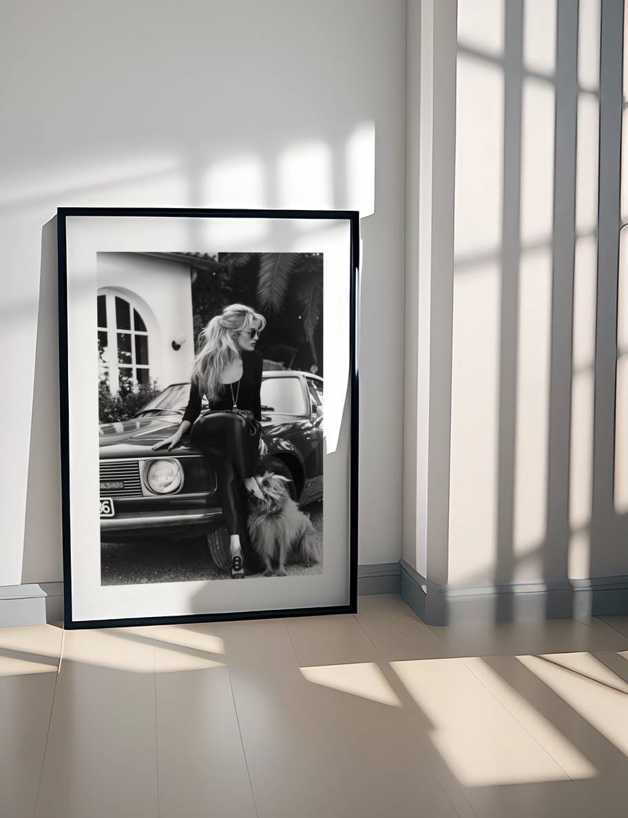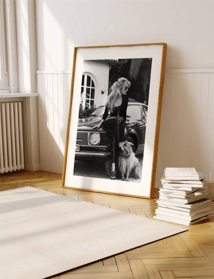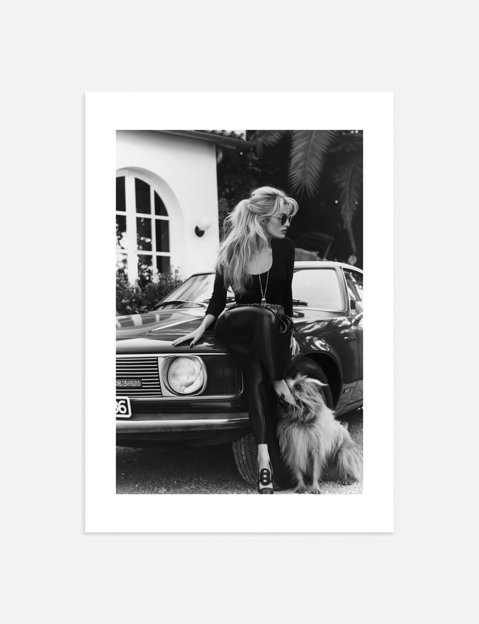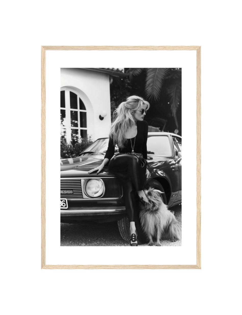 Denne fotoplakat forestiller en kvinde i 80’ernes Frankrig med en hund ved sin side, som giver en følelse af klassisk stil og vendskab.