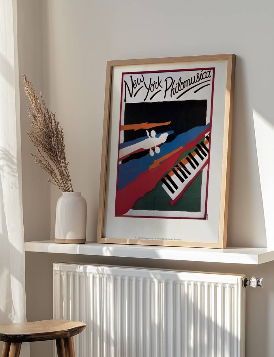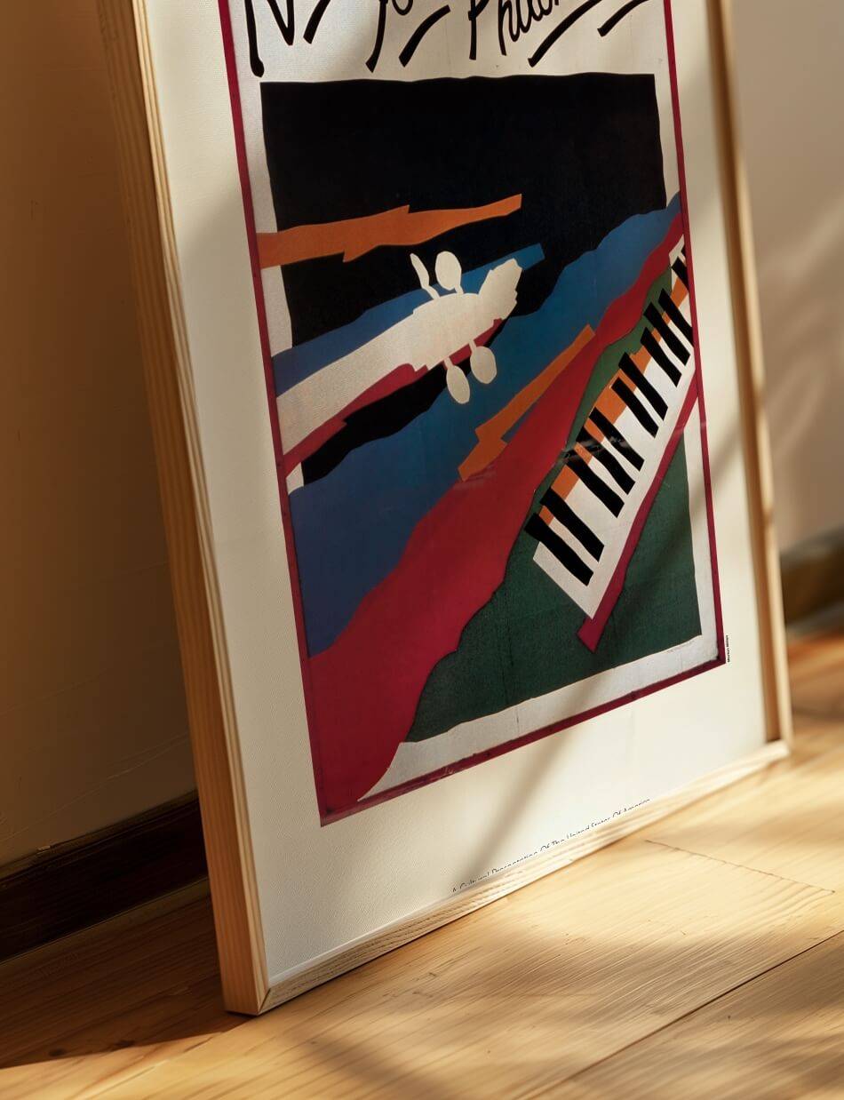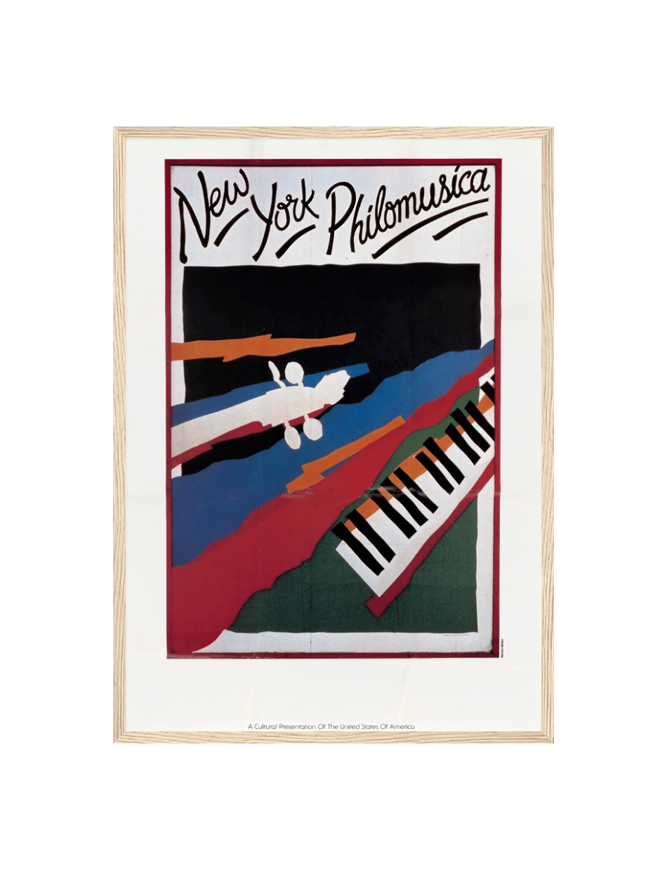 Denne plakat, skabt af U.S. Information Agency, indfanger den klassiske musiks elegance og kreativitet med et farverigt og ekspressivt design. Med dristige farver og abstrakte former præsenteres et klaver og musikere, hvilket fremhæver den livlige og harmoniske ånd i New York Philomusica. Plakaten kombinerer kunstnerisk frihed med musikalsk tradition, hvilket inviterer betragteren til at opleve skønheden i klassisk musik på en ny og inspirerende måde.