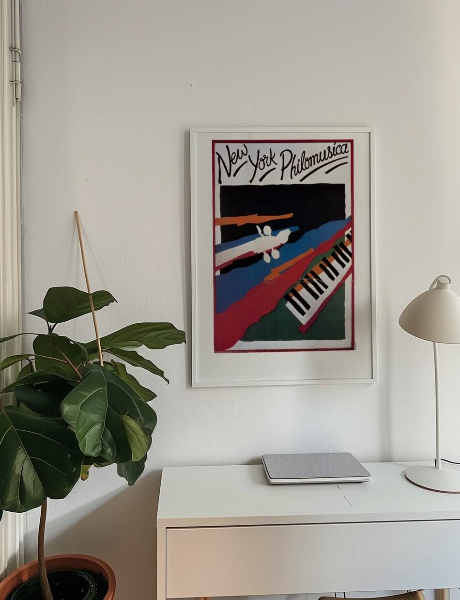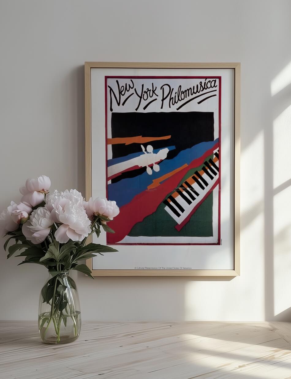Denne plakat, skabt af U.S. Information Agency, indfanger den klassiske musiks elegance og kreativitet med et farverigt og ekspressivt design. Med dristige farver og abstrakte former præsenteres et klaver og musikere, hvilket fremhæver den livlige og harmoniske ånd i New York Philomusica. Plakaten kombinerer kunstnerisk frihed med musikalsk tradition, hvilket inviterer betragteren til at opleve skønheden i klassisk musik på en ny og inspirerende måde.