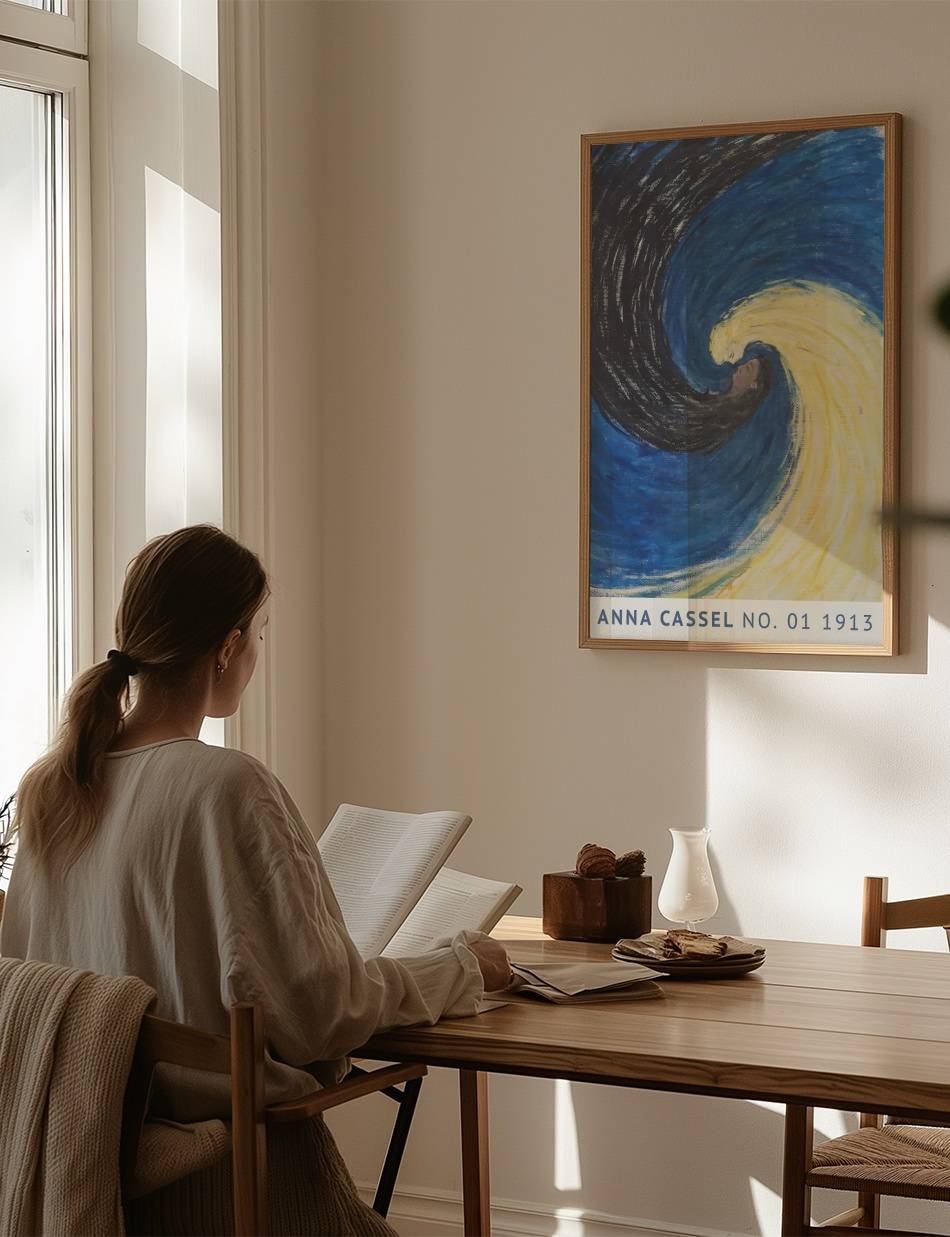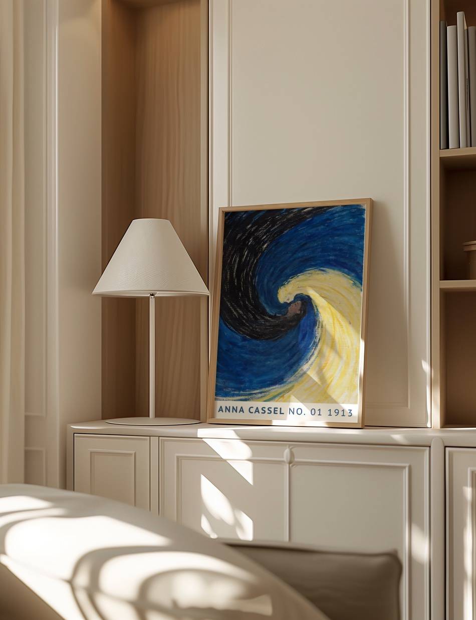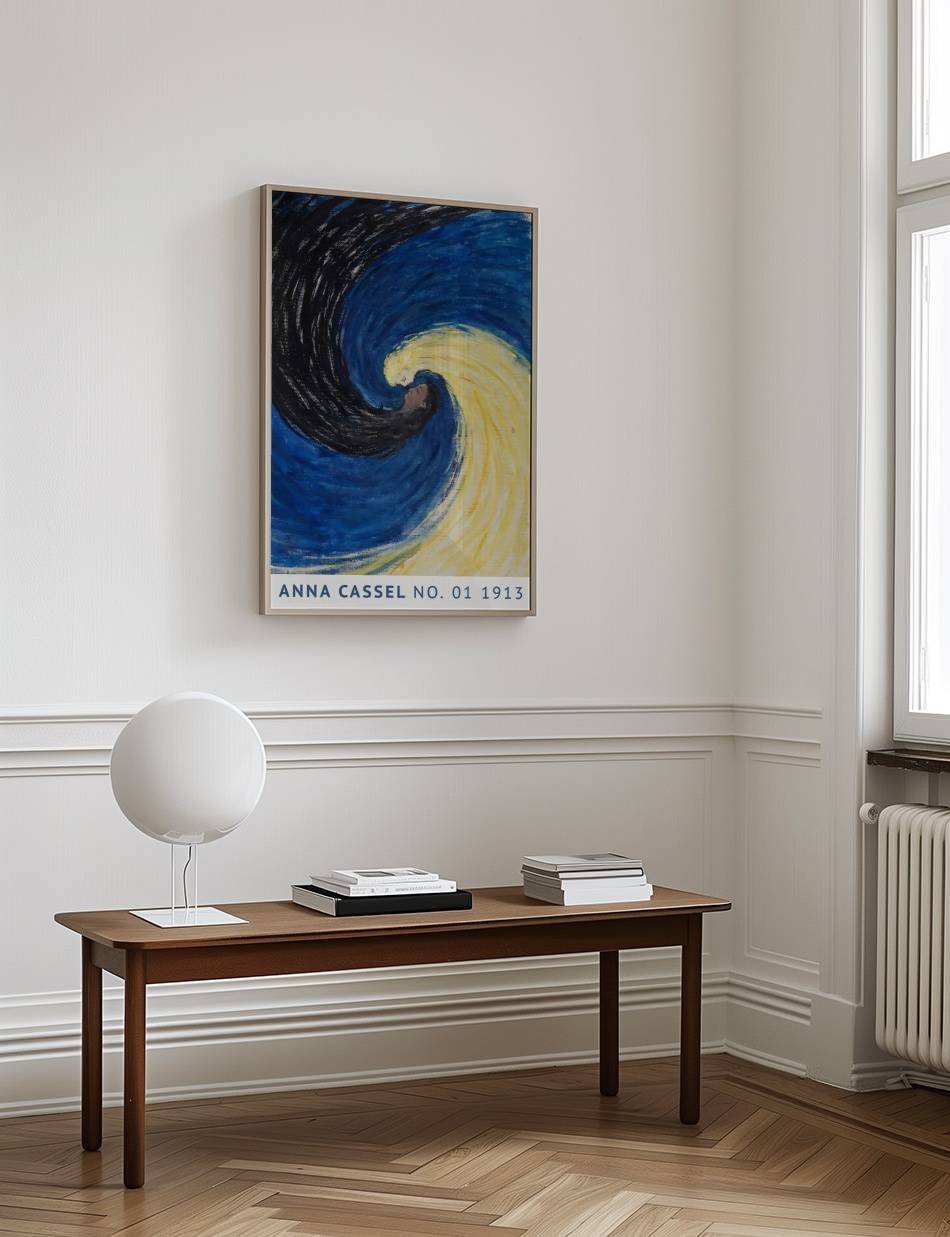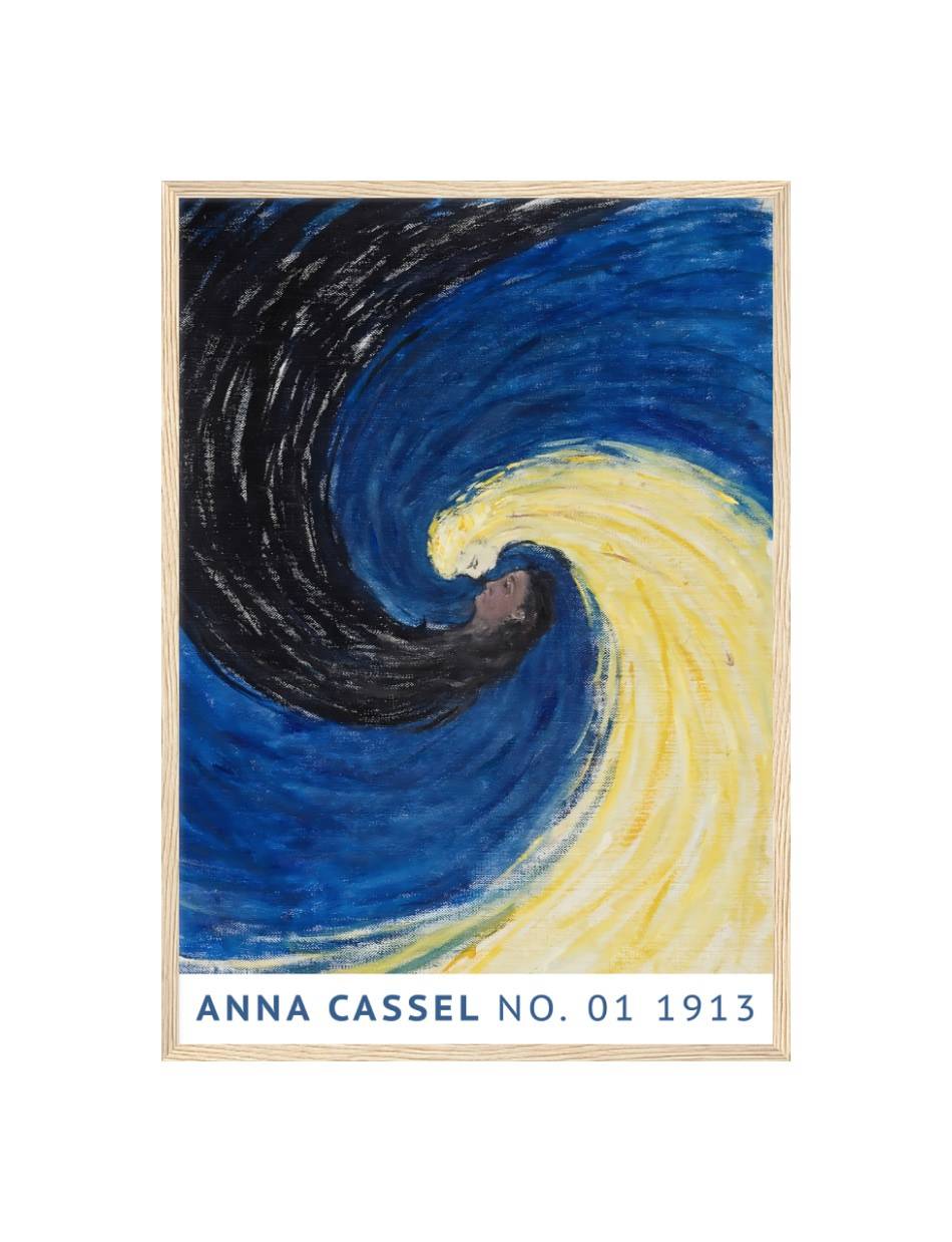 Anna Cassels dynamiske kunstværk fra 1913 viser en kraftfuld sammensmeltning af lys og mørke. Den spiralformede bevægelse af sorte og gule farver skaber en følelse af kosmisk energi og balance, mens de to ansigter, der mødes i midten, symboliserer enhed og harmoni. Den dybe blå baggrund fremhæver kontrasten mellem lys og mørke og tilføjer dybde til kompositionen. Dette værk inviterer dig til at reflektere over de modstridende kræfter i livet og den skønhed, der findes i deres samspil.