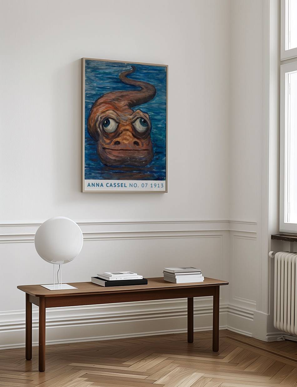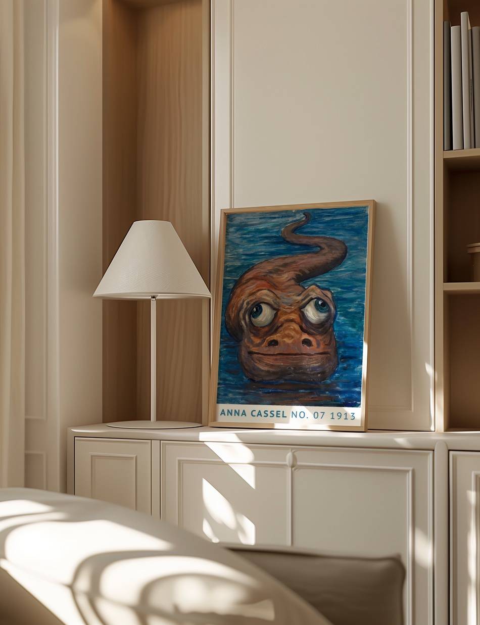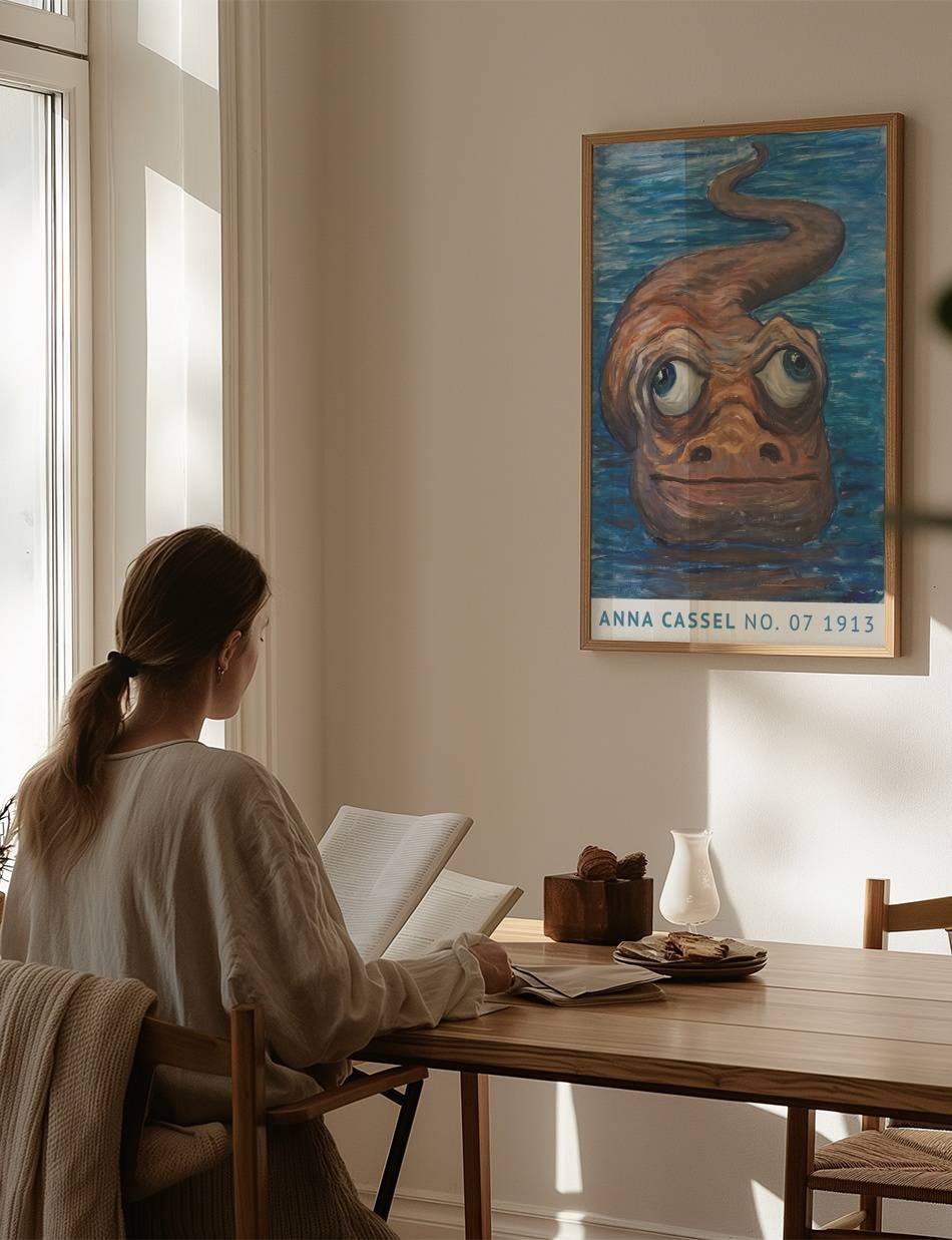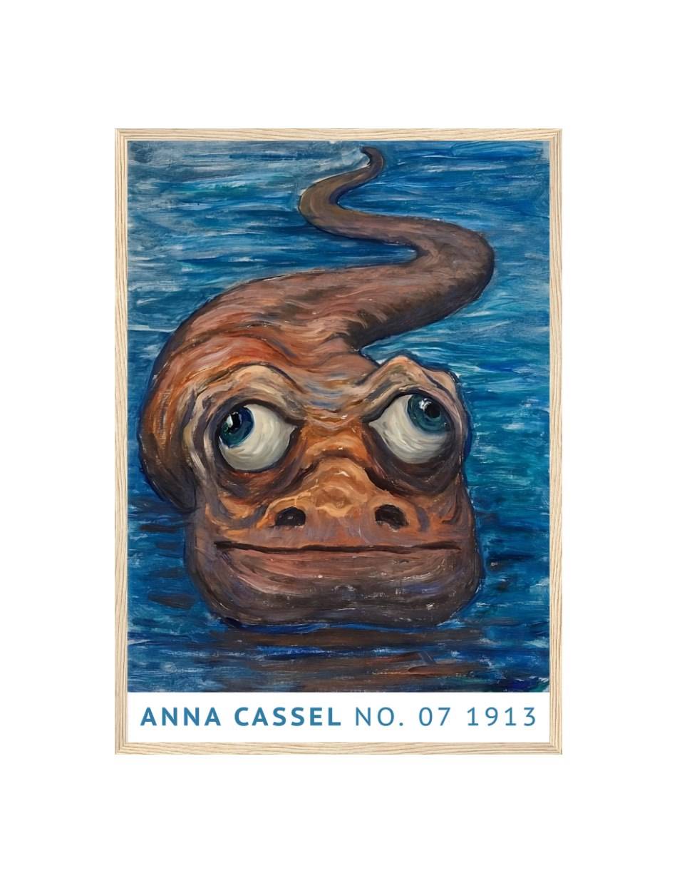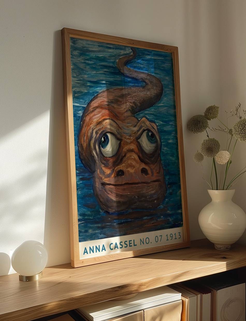 Anna Cassels kunstværk fra 1913 præsenterer en fascinerende og mystisk skabning, der ser op fra en dybblå vandmasse. Skabningens store, udtryksfulde øjne og snoede krop skaber en følelse af nysgerrighed og undren. Den detaljerede tekstur og brug af farver fremhæver det organiske og uforudsigelige ved naturen. Dette værk inviterer til at forestille sig de ukendte dybder og de fantastiske væsener, der måtte gemme sig dernede, og minder os om de mange mysterier, verden stadig holder skjult.