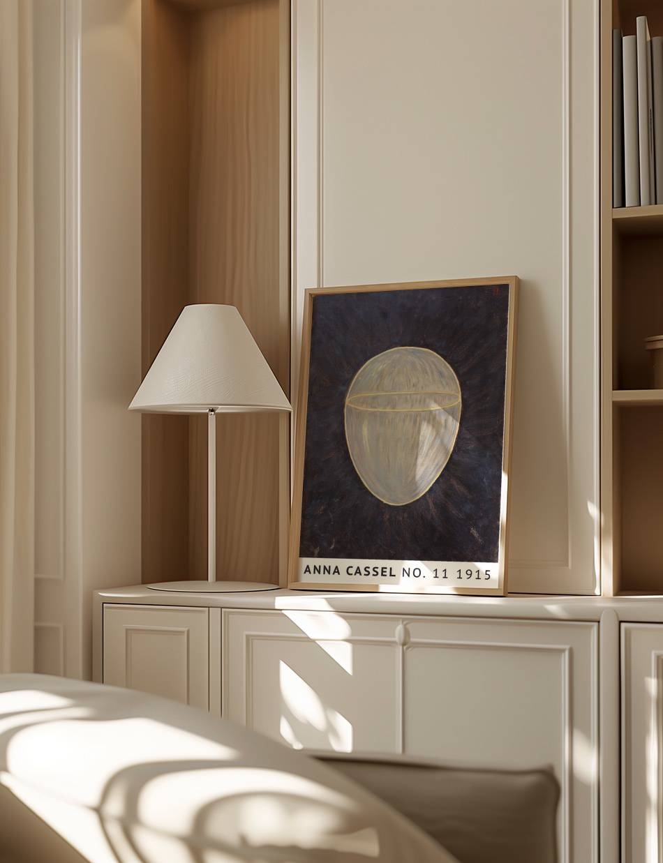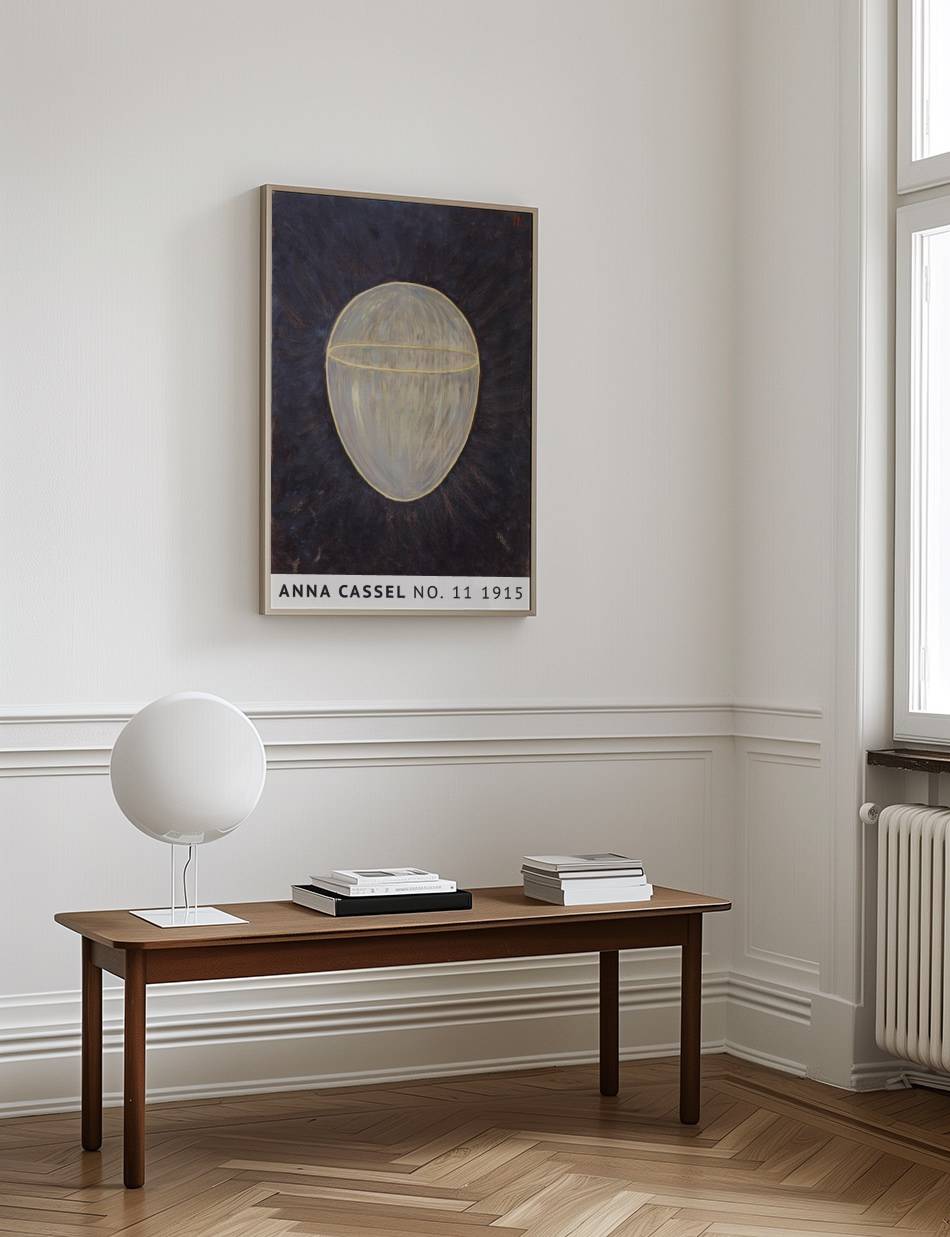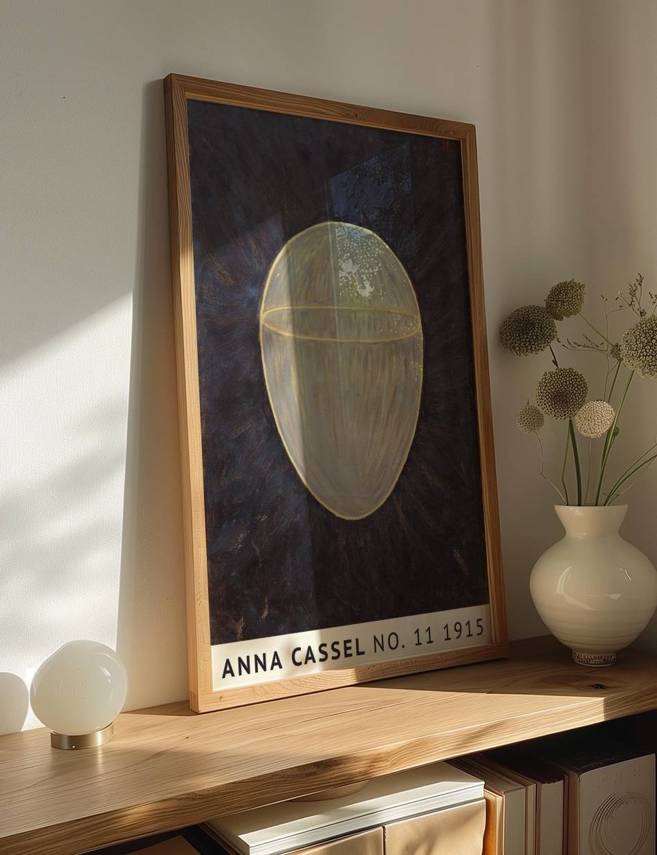 Anna Cassels værk fra 1915 fremstår som en meditative udforskning af form og lys. Centralt i kompositionen er en ovoid form, oplyst indefra og omkranset af en gylden kontur. Den mørke baggrund fremhæver det lysende objekt og skaber en følelse af mystik og dybde. Det indre lys i formen synes at stråle udad, hvilket giver værket en næsten kosmisk kvalitet. Dette kunstværk inviterer til at overveje de skjulte kræfter i universet og den indre lys, der findes i os alle.