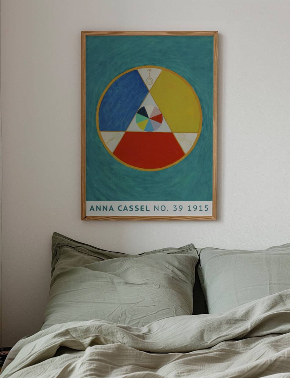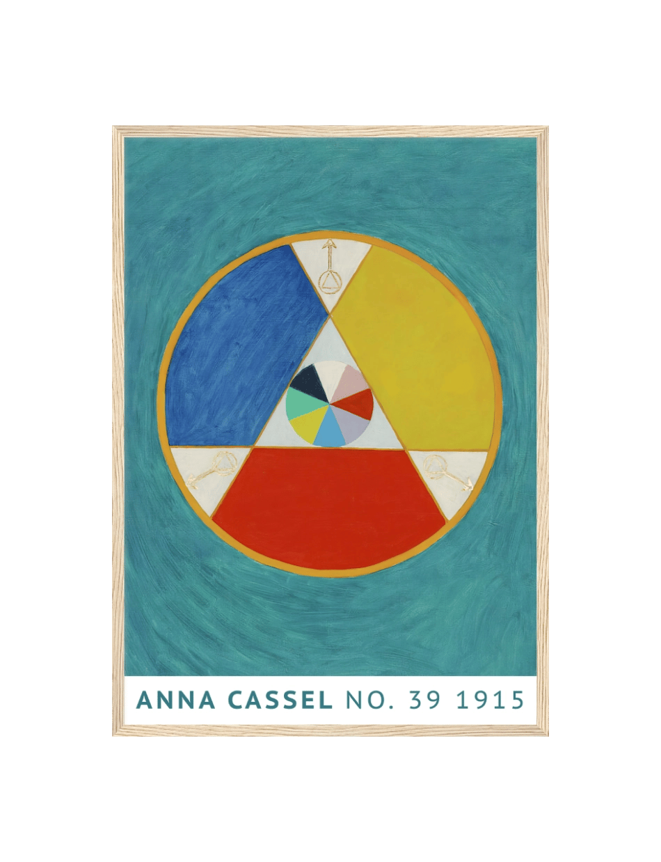 Anna Cassels No. 39, 1915 er en mesterlig sammensætning af geometri og farve, der balancerer harmoni og symbolik i en cirkulær form. Værket er delt op i sektioner med primære farver som blå, rød og gul, hver med sin egen kraftfulde tilstedeværelse. En trekant i midten skaber et centralt fokus med et mønstret farvehjul, der binder de omkringliggende dele sammen. De gyldne linjer og små detaljer tilfører et spirituelt og matematisk præg, der skaber en visuel rejse gennem værket.