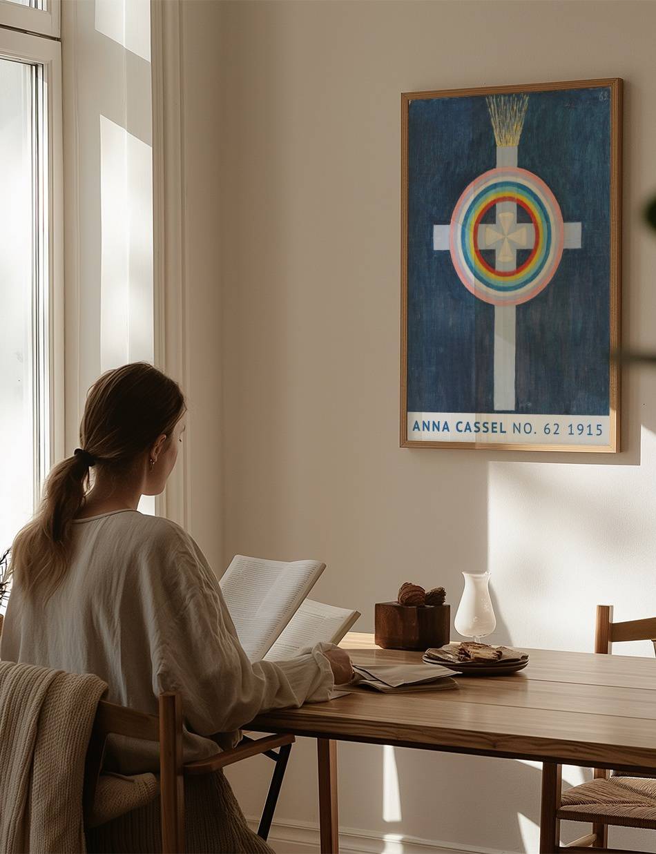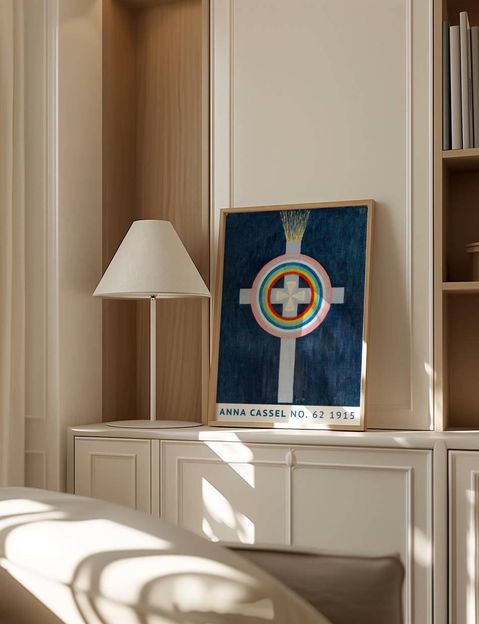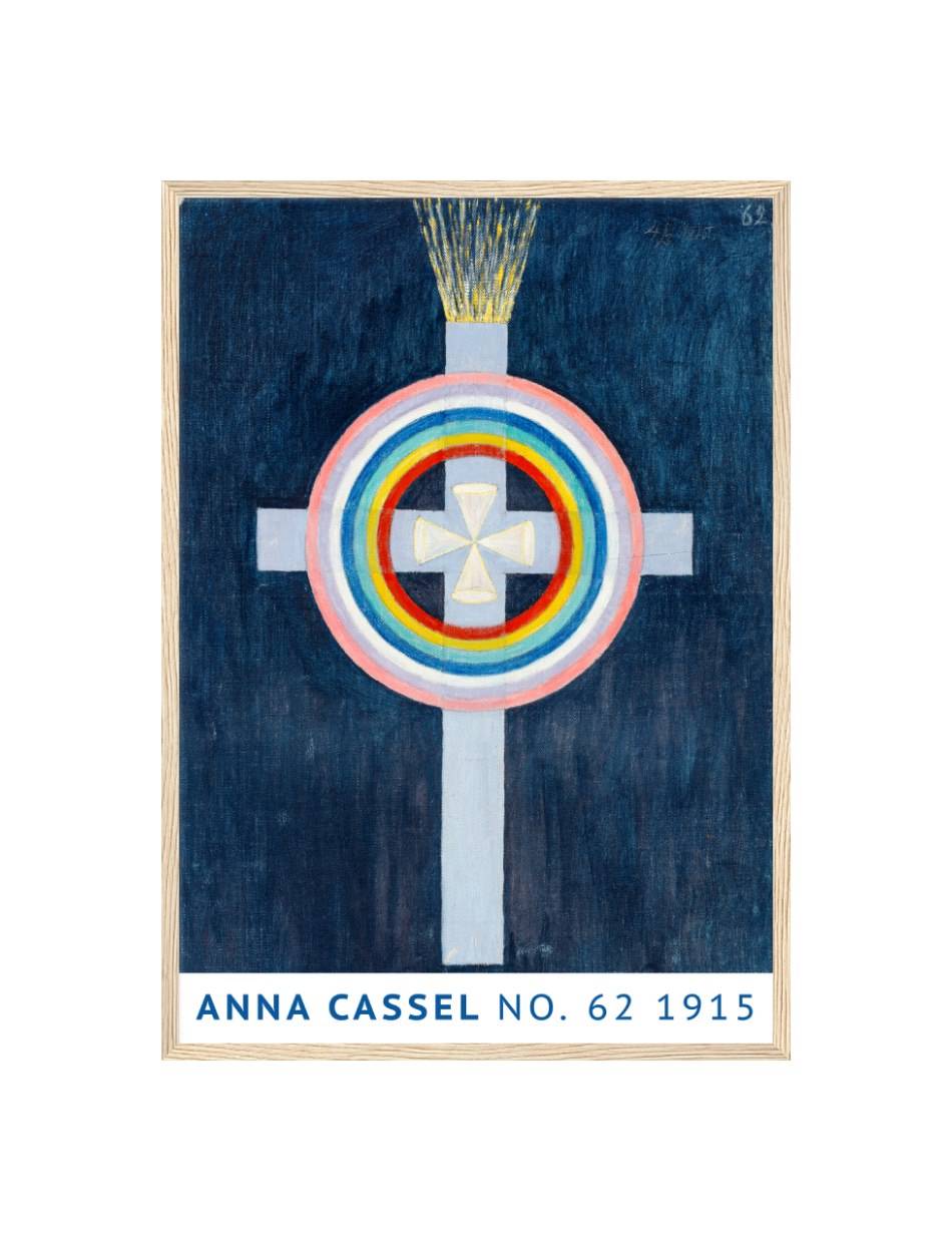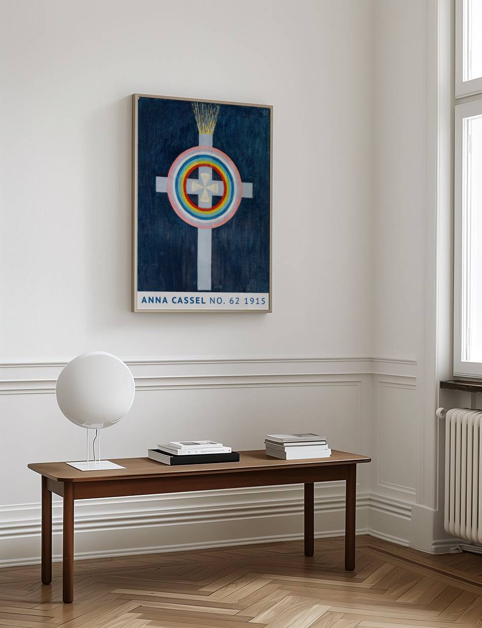 Anna Cassels værk fra 1915 udtrykker en dyb symbolik gennem brug af farver og geometriske former. En central hvid korsfigur er omgivet af koncentriske cirkler i regnbuens farver, der skaber en følelse af harmoni og balance. Over korsets top stråler gyldne lysstråler ud og tilføjer en dimension af åndelig oplysning til kompositionen. Den mørkeblå baggrund fremhæver de livlige farver og gør det samlede billede mere intenst og fokuseret. Dette kunstværk inviterer beskueren til at fordybe sig i dets symbolik og finde personlig mening i farvernes og formens harmoniske samspil.