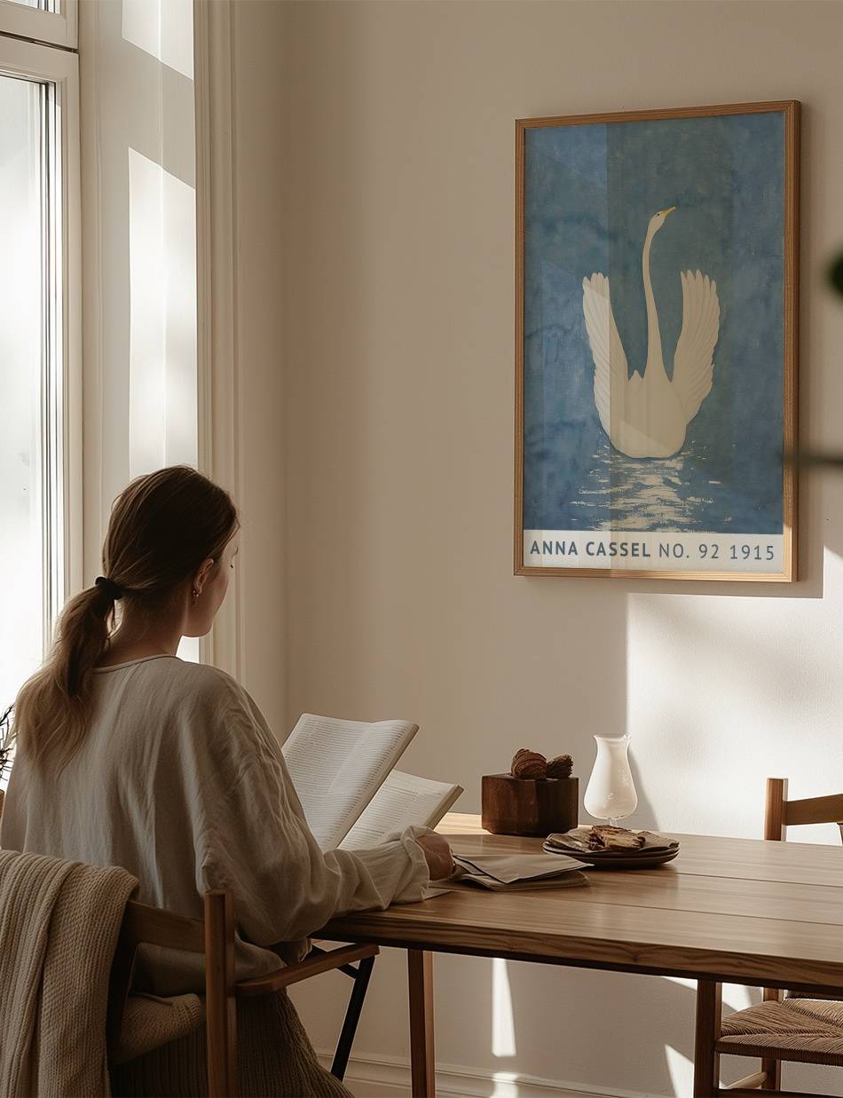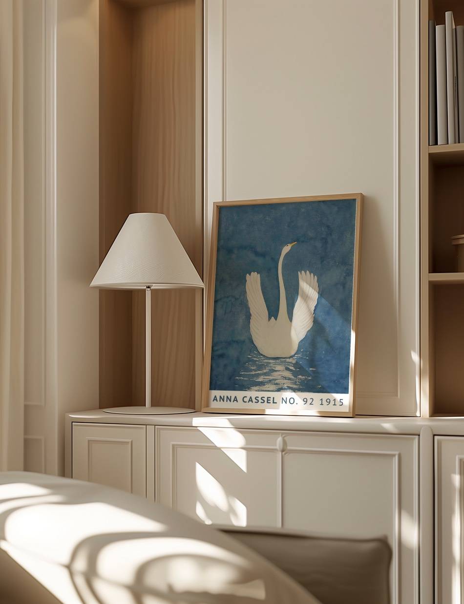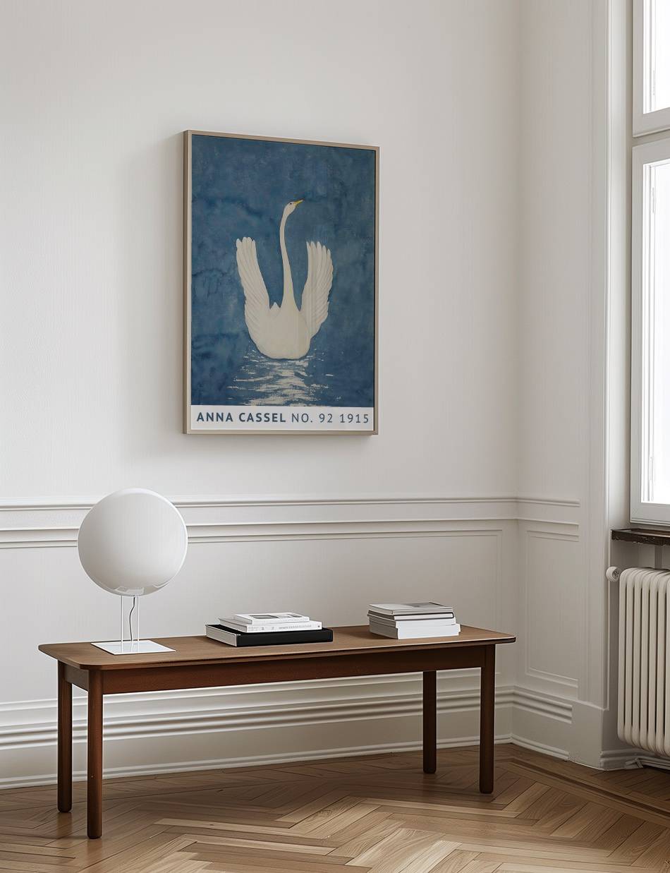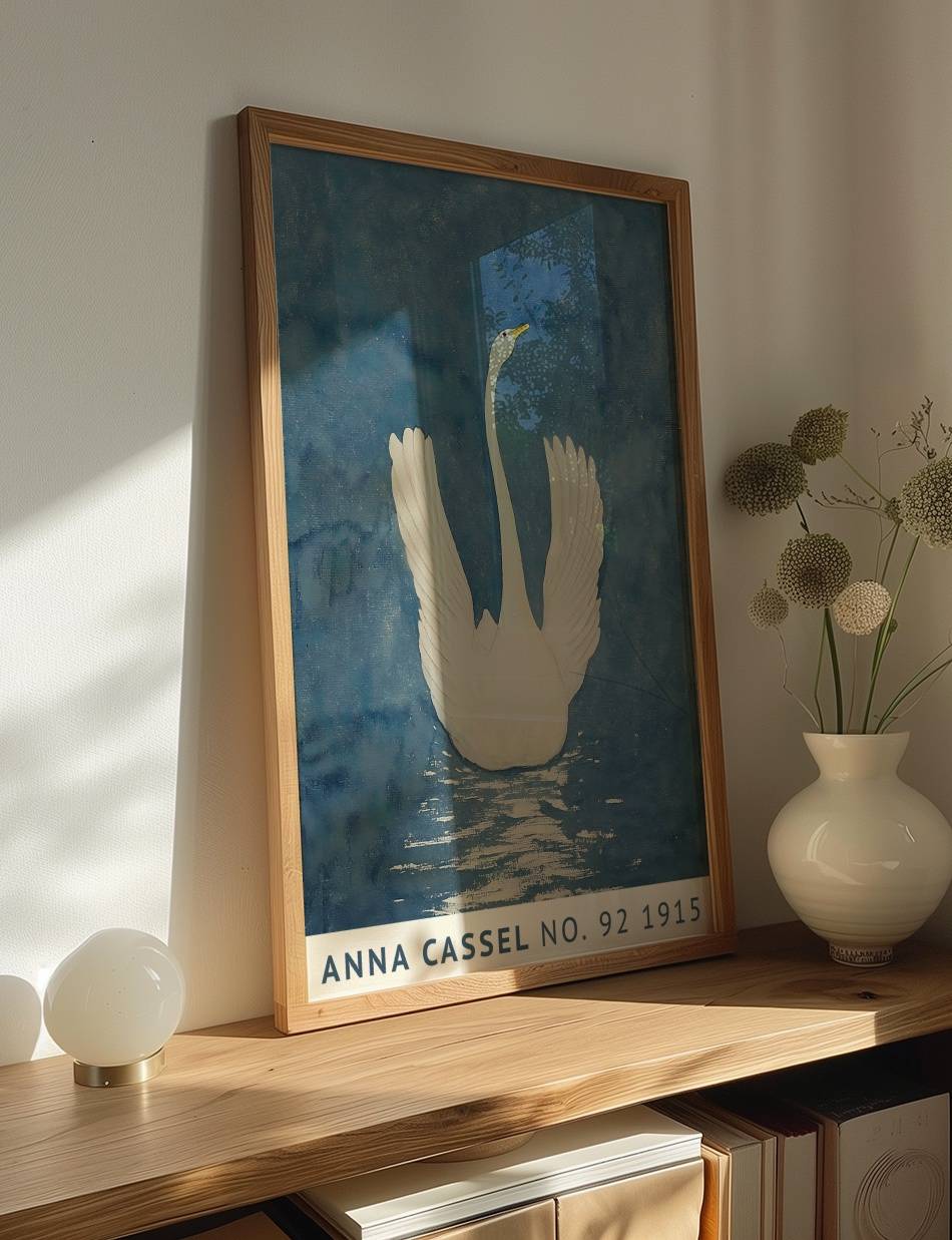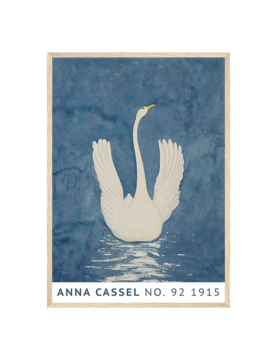 Oplev Anna Cassels betagende kunstværk fra 1915, der fanger essensen af elegance og ro. Værket viser en majestætisk svane med udspredte vinger, flydende på en spejlblank sø. Den dybblå baggrund fremhæver svanens rene hvide farver, mens refleksionen i vandet tilføjer en følelse af dybde og realisme. Dette kunstværk formidler naturens skønhed og graciøsitet på en enkel, men alligevel kraftfuld måde, og inviterer dig til at nyde øjeblikkets fredfyldte atmosfære.