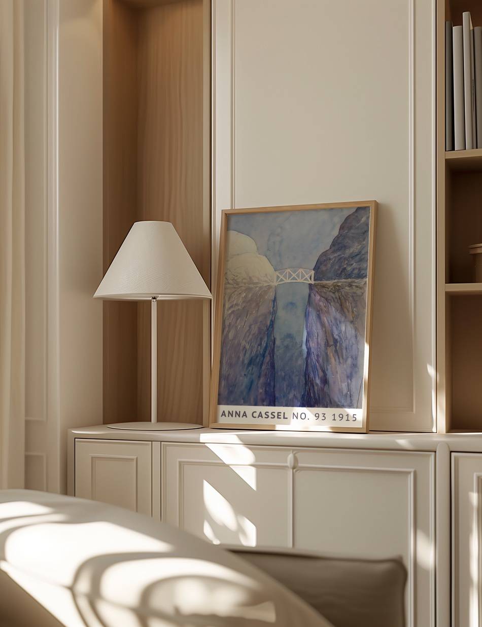 Oplev Anna Cassels inspirerende kunstværk fra 1915, der skildrer en dramatisk kløft med en smuk bro, der forbinder to klippeformationer. Den klare blå himmel og de omgivende bjerge skaber en følelse af storhed og ro. Broens enkle design fremhæves af den detaljerede struktur af klipperne på begge sider, og giver en symbolsk følelse af forbindelse og overgang. Dette kunstværk inviterer dig til at reflektere over de broer, vi bygger i vores egne liv og den skønhed, der findes i at forbinde forskellige verdener.