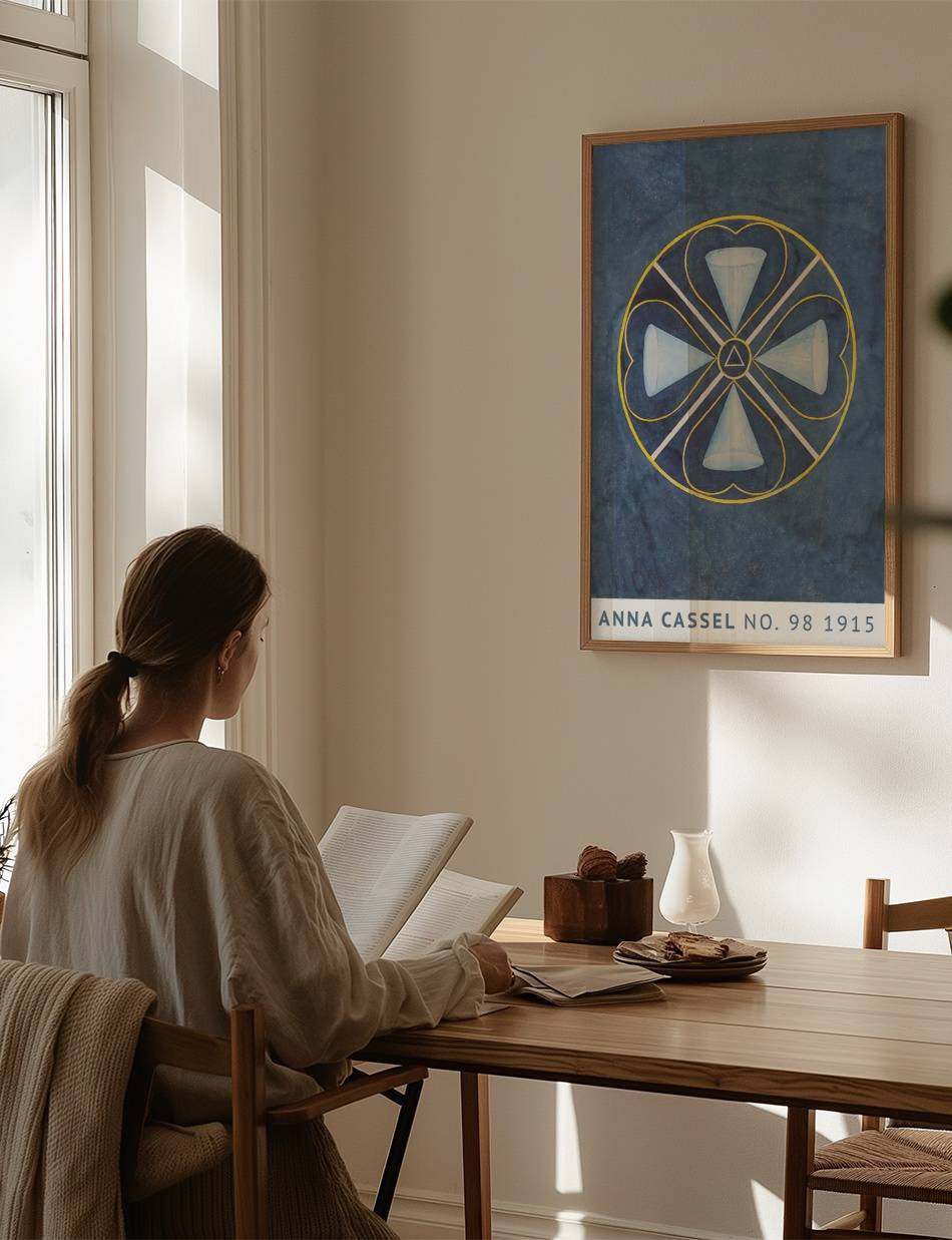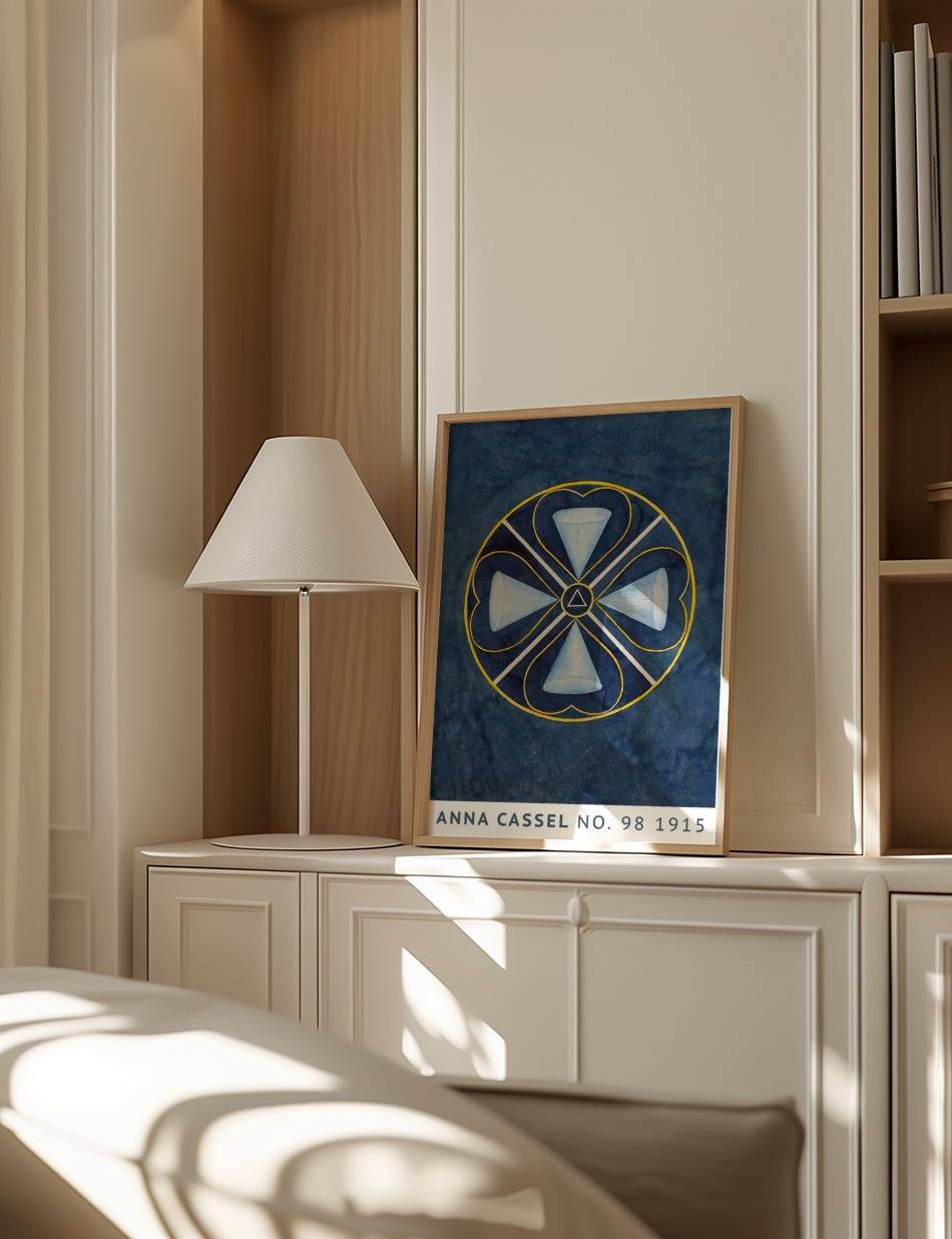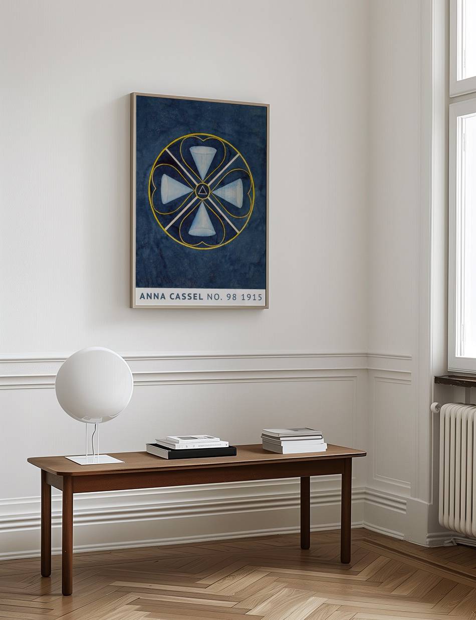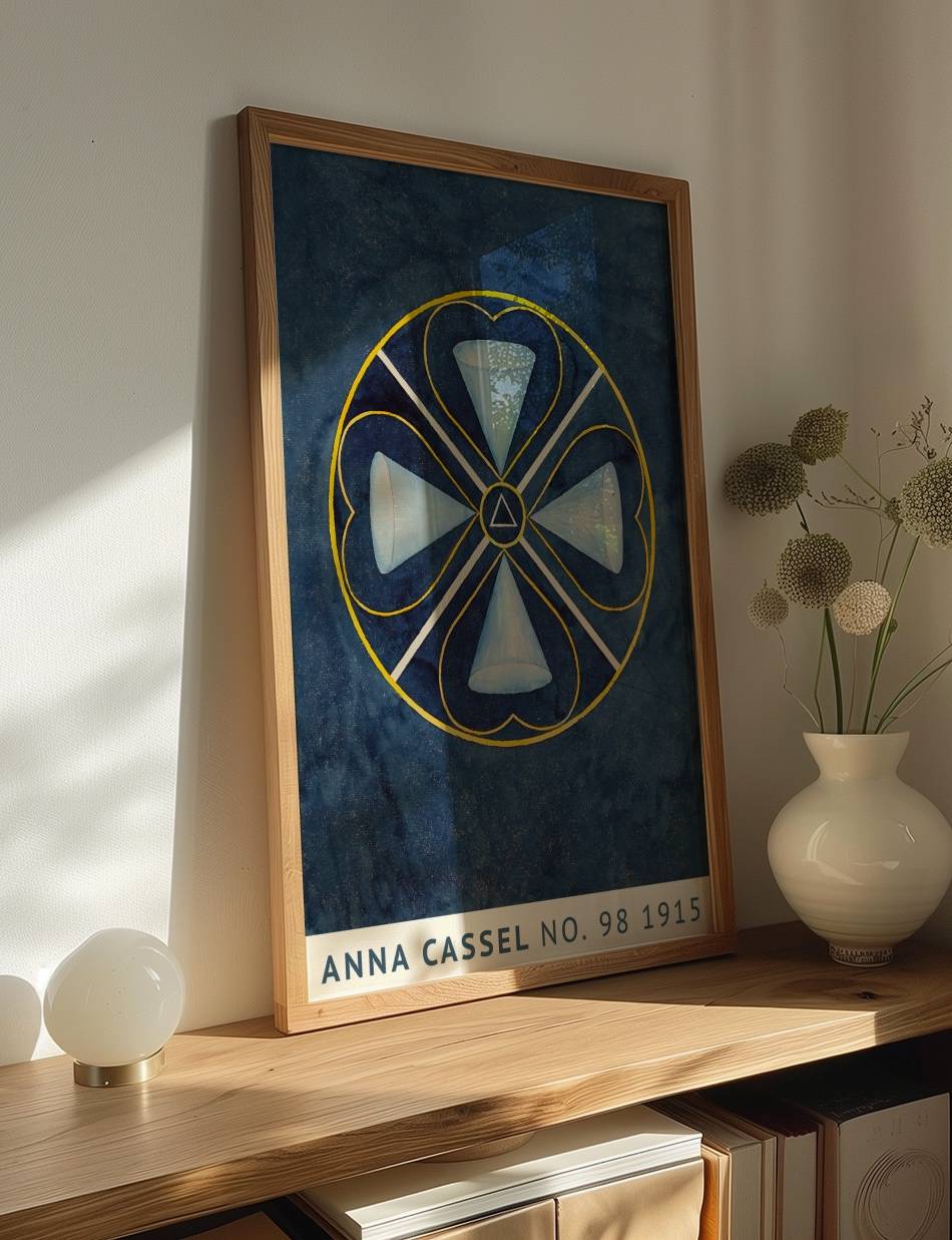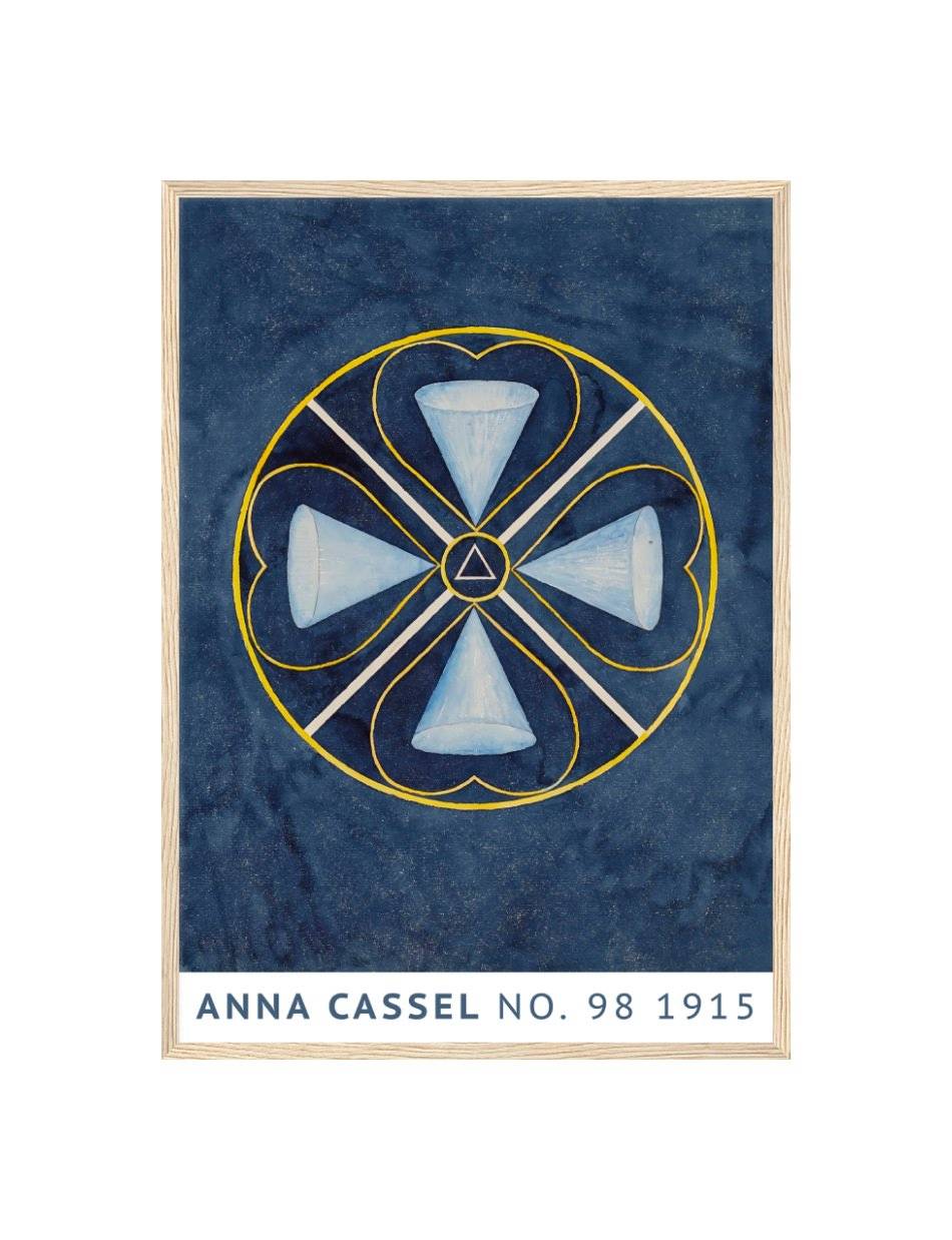 Oplev Anna Cassels fascinerende kunstværk fra 1915, der kombinerer geometriske former og symbolik i en dybblå baggrund. Værket består af en cirkel, der indeholder fire kegleformede elementer, som er arrangeret symmetrisk omkring et centralt trekantet symbol. De sarte nuancer af blå og hvide farver skaber en rolig og harmonisk følelse, mens de gule linjer tilføjer en subtil kontrast. Dette kunstværk inviterer beskueren til at fordybe sig i dets komplekse mønstre og finde deres egen fortolkning af symbolikken.