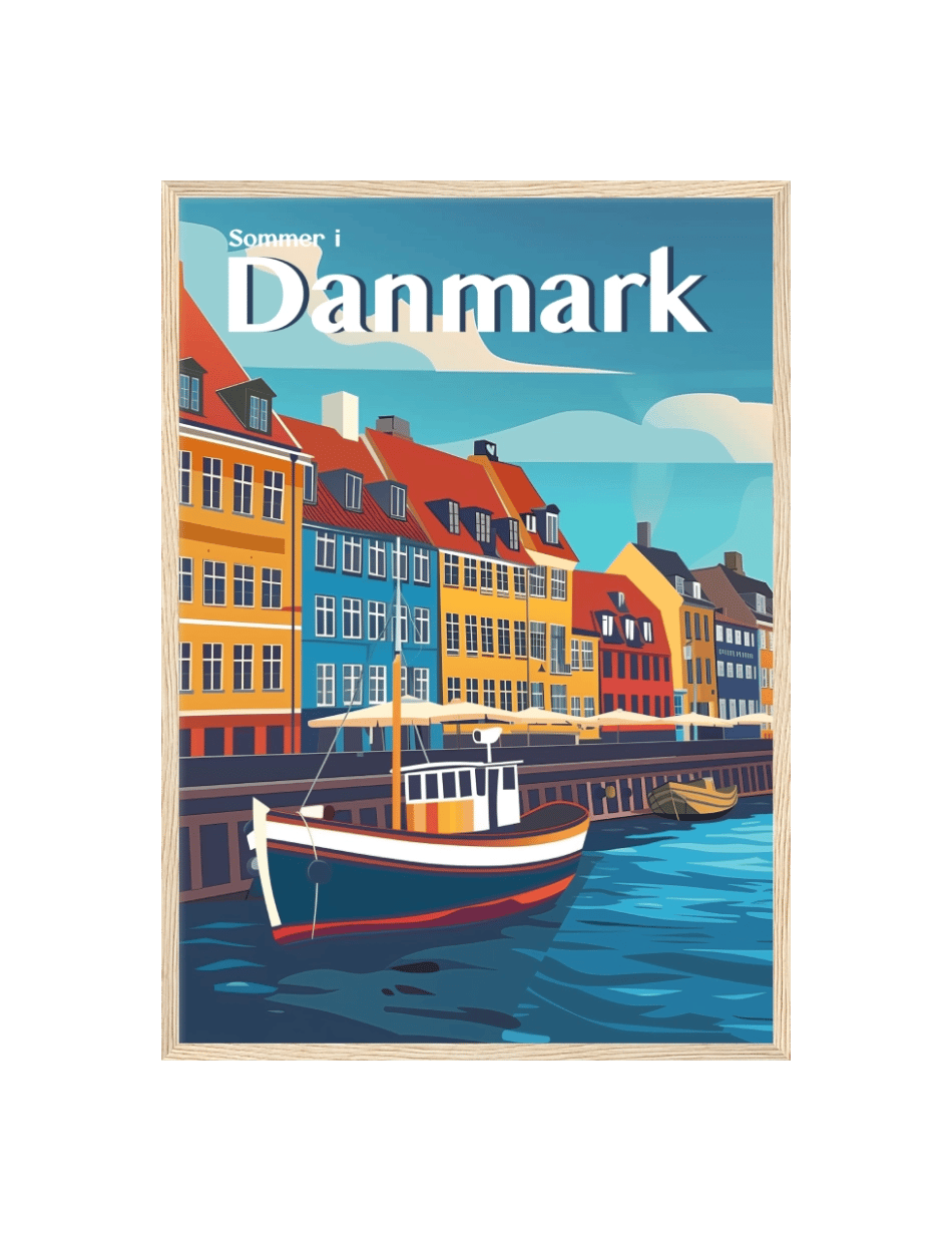 Dyk ned i den pulserende atmosfære af Nyhavn med denne livlige plakat. De farverige bygninger langs kanalen skaber en indbydende og festlig stemning, mens både vugger roligt i vandet. Restauranter og caféer langs kajen summer af liv og glæde, og den klare blå himmel fuldender billedet af en perfekt sommerdag i København. Lad denne plakat fra kollektionen Summer In Denmark bringe et strejf af hovedstadens charme og energi ind i dit hjem, og mind dig om de uforglemmelige øjeblikke ved vandkanten.