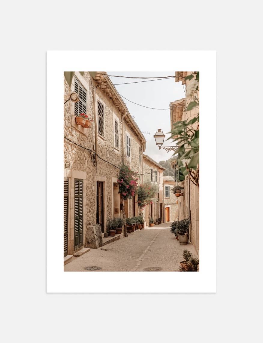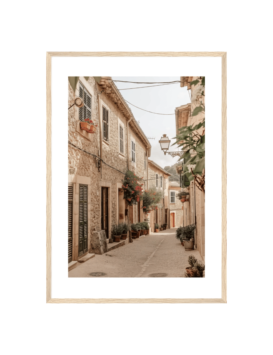 Tag et skridt ind i Val Coffe, Mallorca med denne idylliske fotoplakat. Plakaten fremviser en fredfyldt gade i Val Coffe, hvor tiden synes at stå stille. De rustikke stenbygninger, komplet med grønne skodder og blomstrende altankasser, udstråler en nostalgisk og varm følelse. Denne smukke foto plakat ulmer liv fyldt med simpel skønhed og tradition.