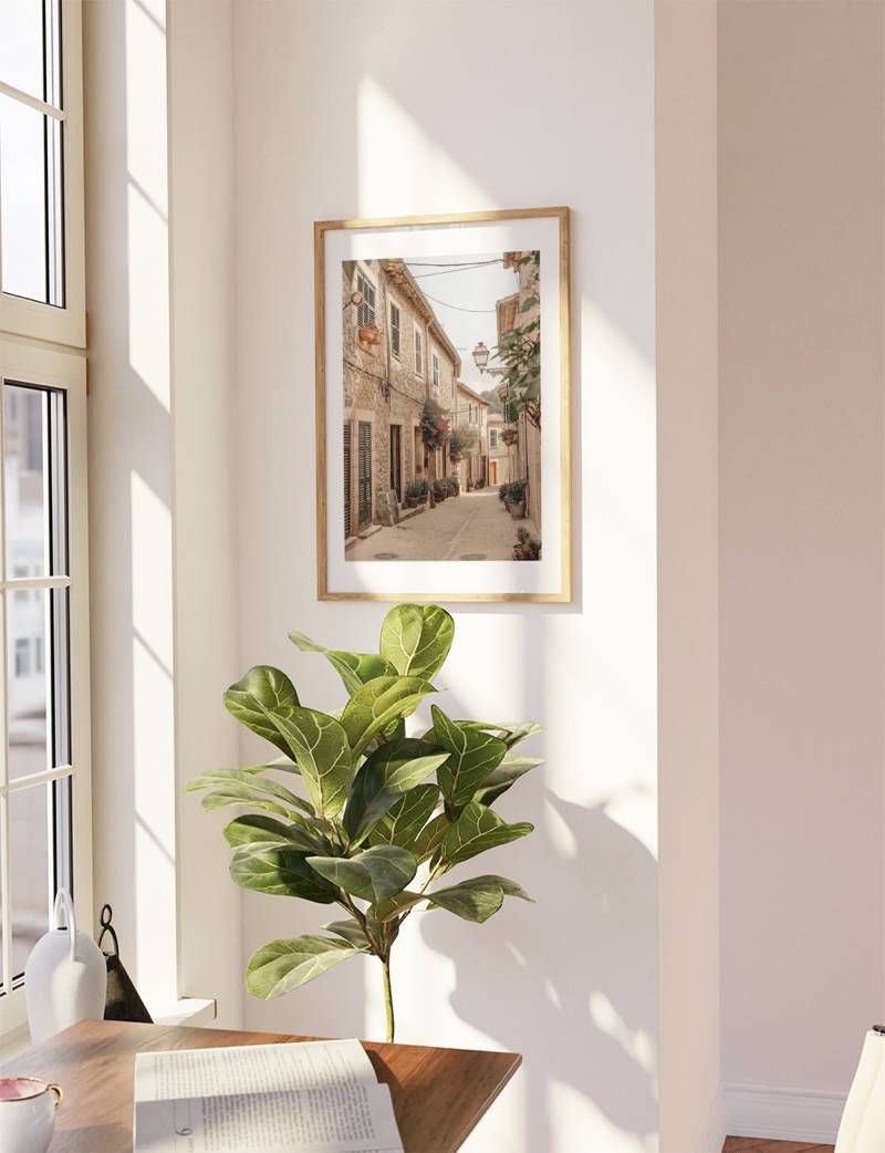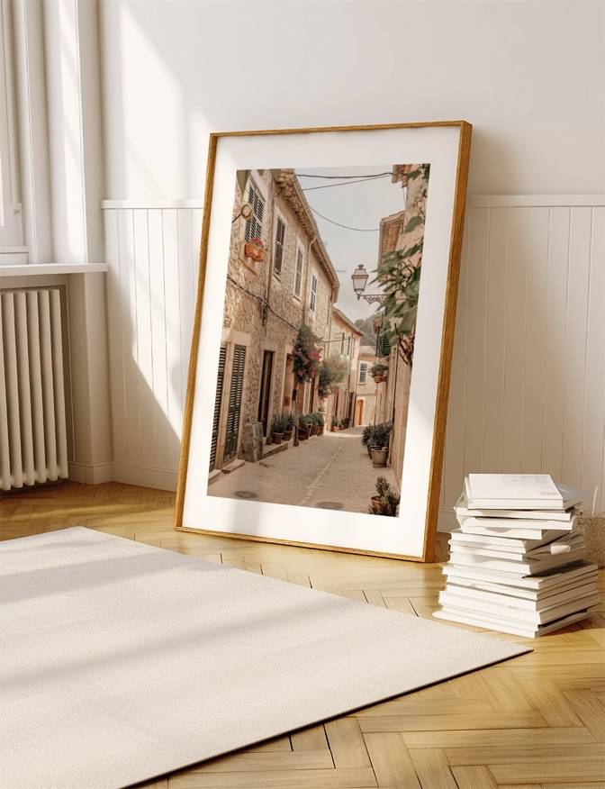 Tag et skridt ind i Val Coffe, Mallorca med denne idylliske fotoplakat. Plakaten fremviser en fredfyldt gade i Val Coffe, hvor tiden synes at stå stille. De rustikke stenbygninger, komplet med grønne skodder og blomstrende altankasser, udstråler en nostalgisk og varm følelse. Denne smukke foto plakat ulmer liv fyldt med simpel skønhed og tradition.