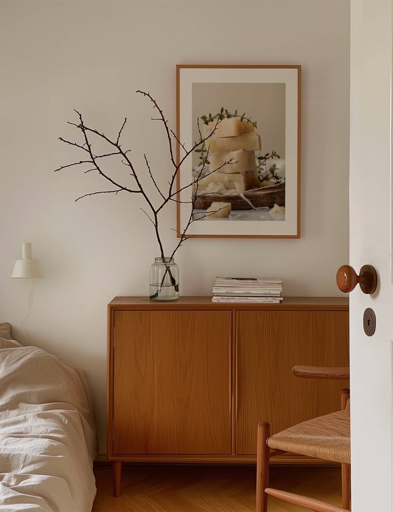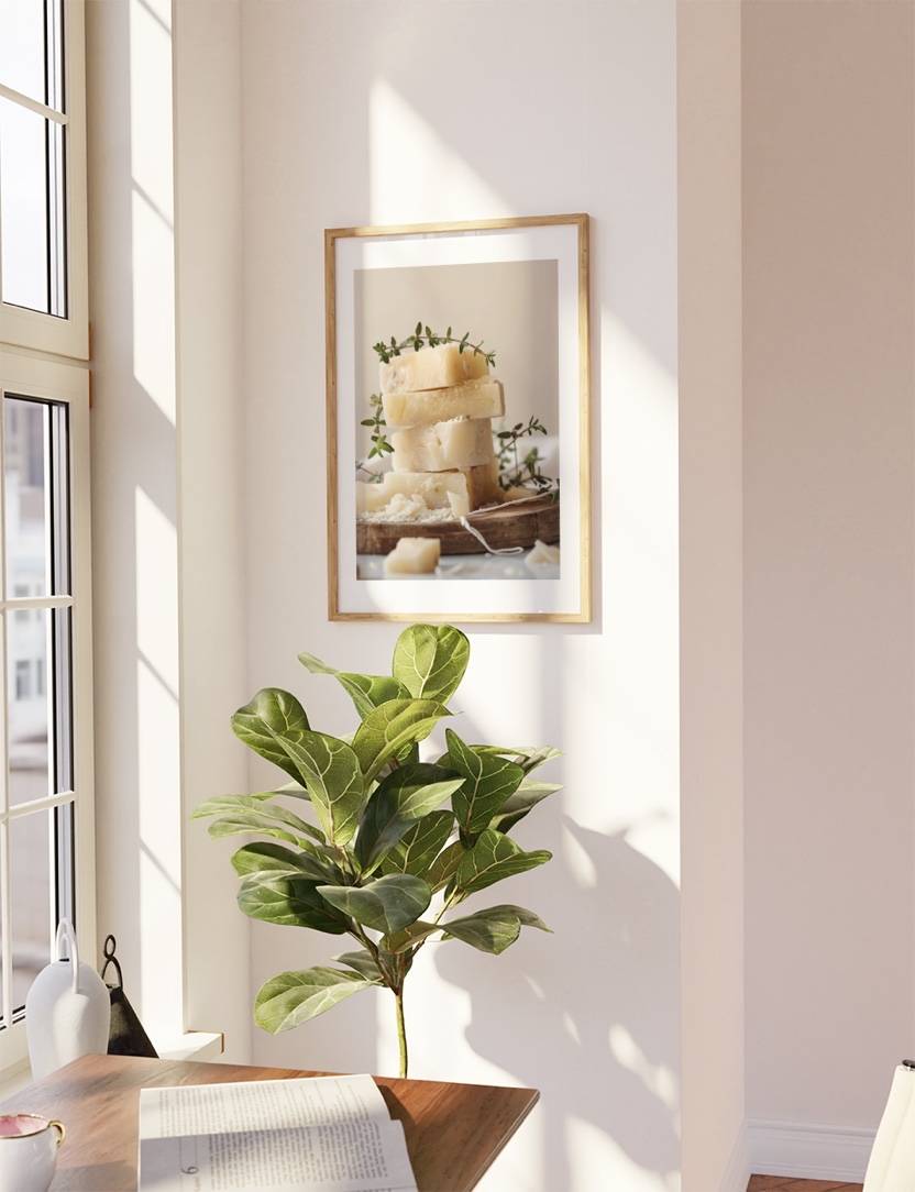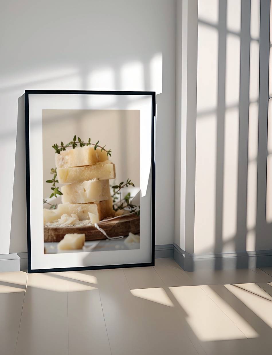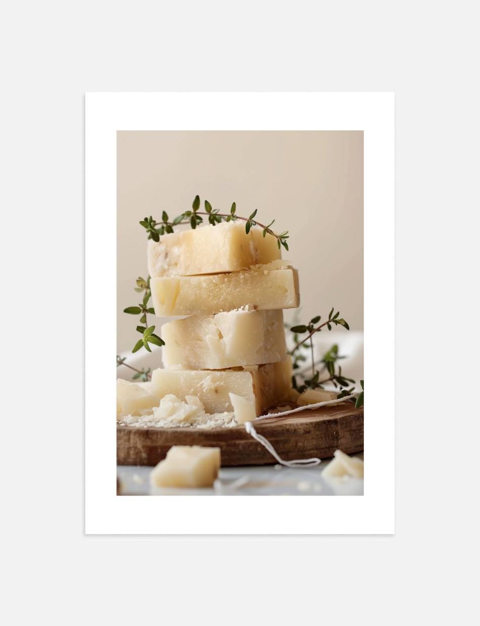 Denne fotoplakat af Parmesanost, præsenteret i en minimalistisk og elegant komposition, er en sand visuel nydelse. De fint stablede ostestykker kombineret med diskrete timiankviste, skaber en atmosfære af sofistikeret ro. En uundværlig tilføjelse for enhver, der værdsætter kunst og mad i en harmonisk enhed.