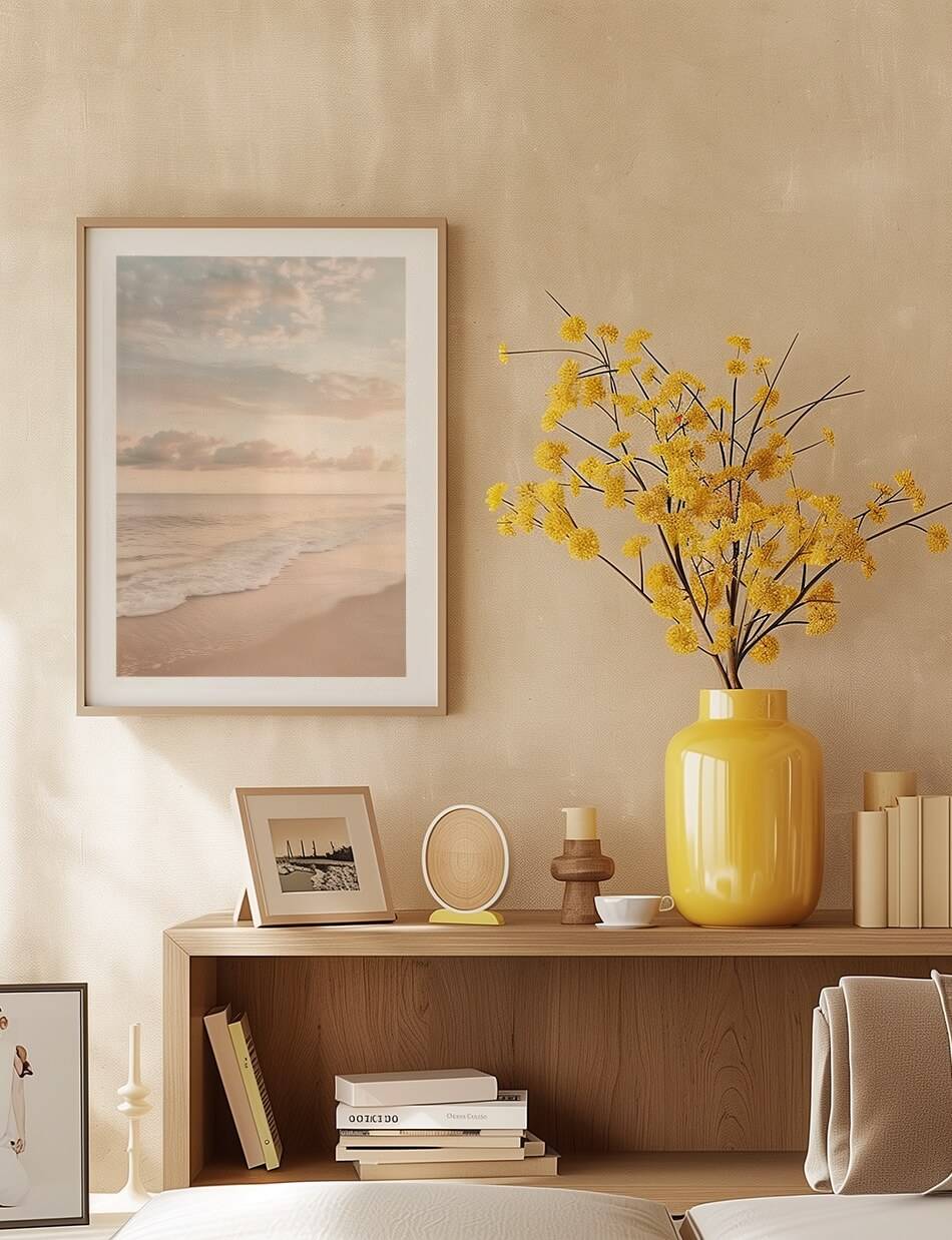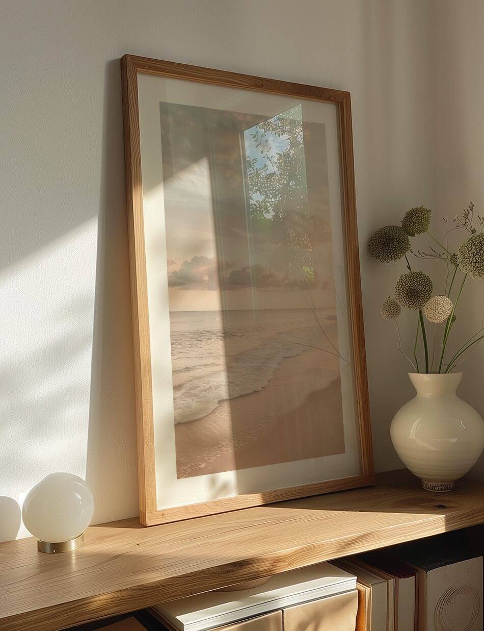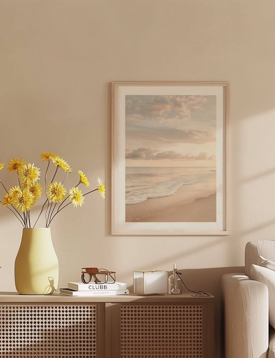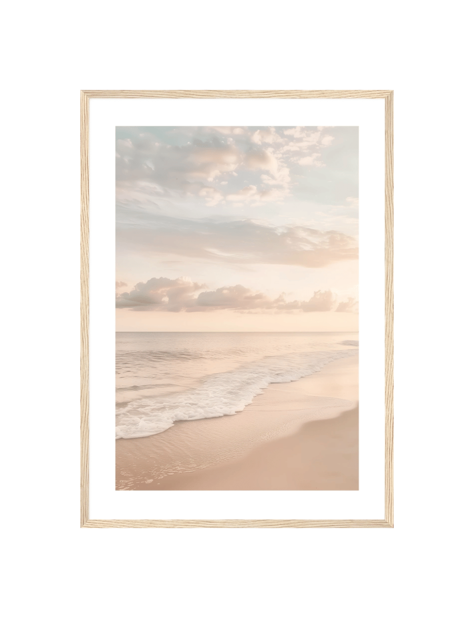 Oplev den rolige skønhed af en fredelig kyststrækning i dette betagende billede. Det blide skum fra bølgerne kærtegner sandet under en blød, pastelfarvet himmel, der fremkalder en følelse af ro og afslapning. Perfekt til at bringe en følelse af fred og naturskønhed ind i ethvert rum.