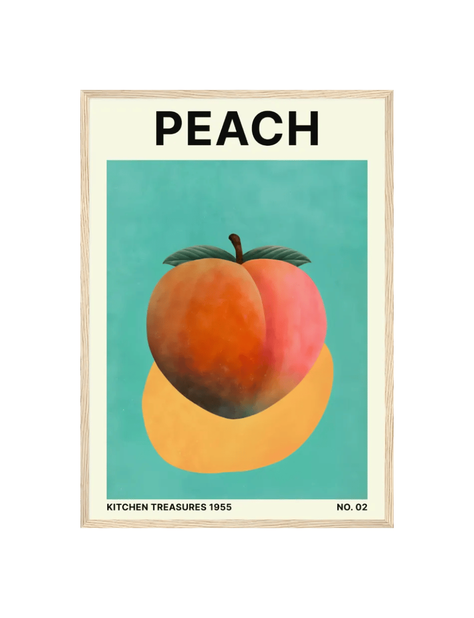 Oplev den friske følelse af en moden fersken med denne smukke illustration fra vores kollektion ‘Kitchen Treasures 1955’. Ferskenens varme farvetoner balanceret mod en beroligende baggrund bringer minder om solrige dage og sommerens sødme. Denne kunstplakat er en hyldest til enkelhed og naturens skønhed, perfekt til at give et friskt pust i ethvert rum.