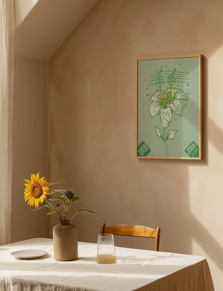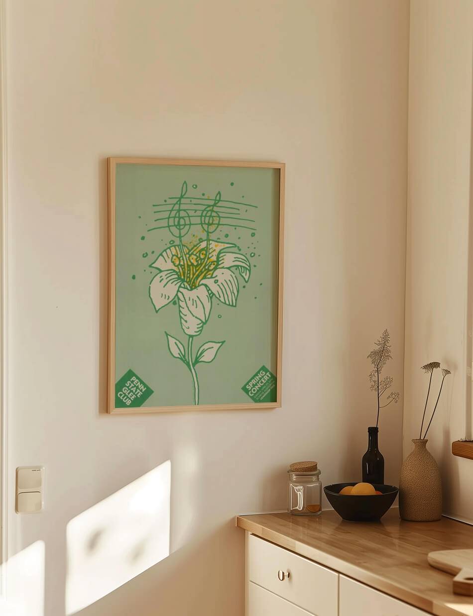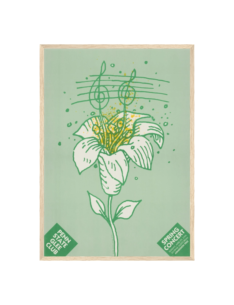 Lanny Sommeses plakat til Penn State Glee Clubs forårskoncert (1984) er en visuel repræsentation af musikkens skønhed og fornyelse. En stiliseret blomst, der springer ud, symboliserer forårets ankomst og den musikalske opblomstring, som koret vil byde velkommen. Plakaten er et kunstværk i sig selv, der inviterer til en fortryllende aften med sang og musik