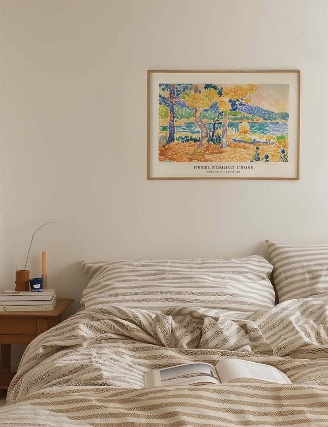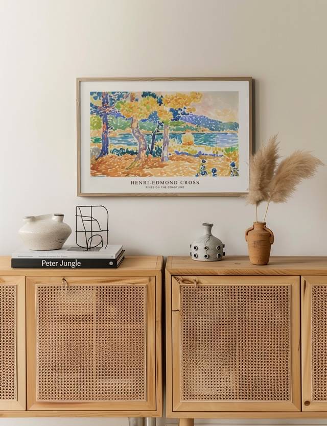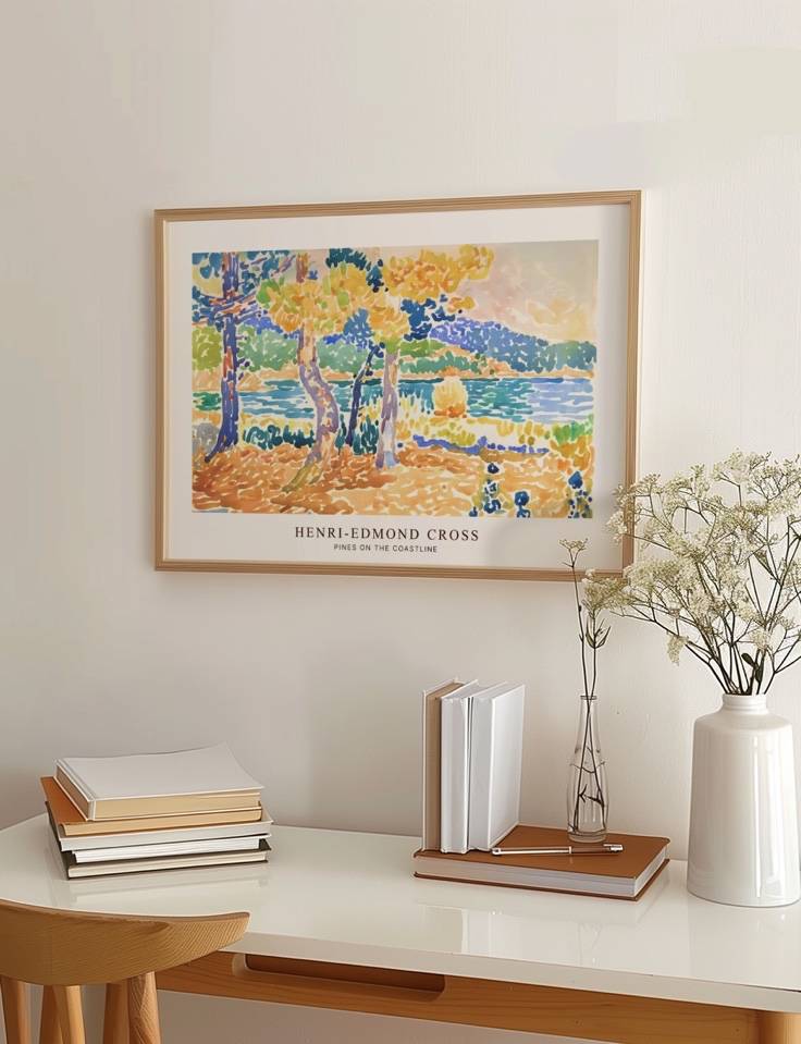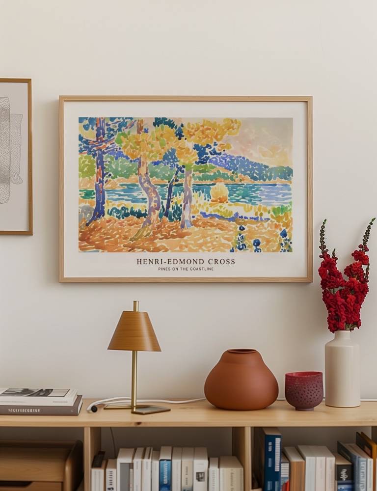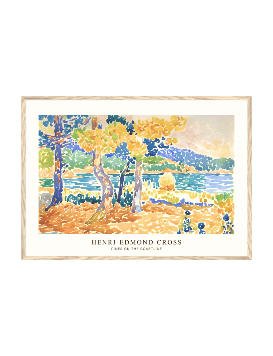 Dyk ned i den rolige skønhed af Henri-Edmond Cross’ maleri Pines on the Coastline. Dette mesterværk bringer den franske kyst til live med levende nuancer af blå, grøn og gul. De slanke fyrtræer står elegant ved vandkanten, hvor deres blade skinner i sollyset. Med sin karakteristiske punktteknik formår Cross at indfange havets ro og naturens harmoni på en måde, der trækker dig dybt ind i billedets landskab. Ideel til dem, der ønsker at indfange naturens skønhed og fred i deres hjem.
