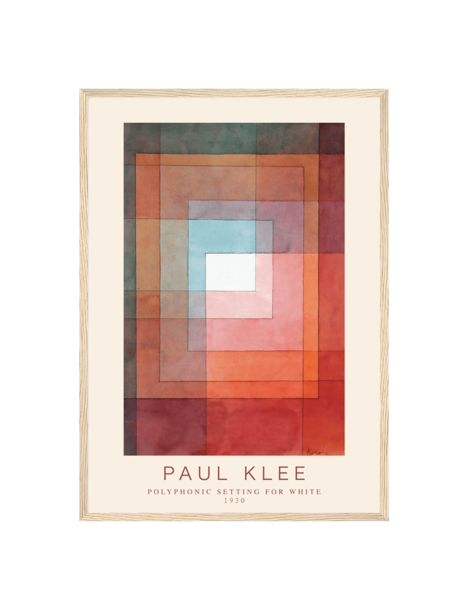 Polyphonic Setting for White’ af Paul Klee fra 1930 er et fortryllende kunstværk, der leger med geometriske former og en rig farvepalet. Værket består af overlappende rektangler i forskellige nuancer, der alle centrerer sig om en hvid firkant i midten. De varme og kolde farvetoner skaber en dybde og rytme, der fremkalder en følelse af harmoni og balance. Klee’s mesterlige brug af farver og former inviterer til at dykke ned i en kompleks visuel oplevelse, hvor hver del af maleriet bidrager til en samlet polyfonisk helhed.