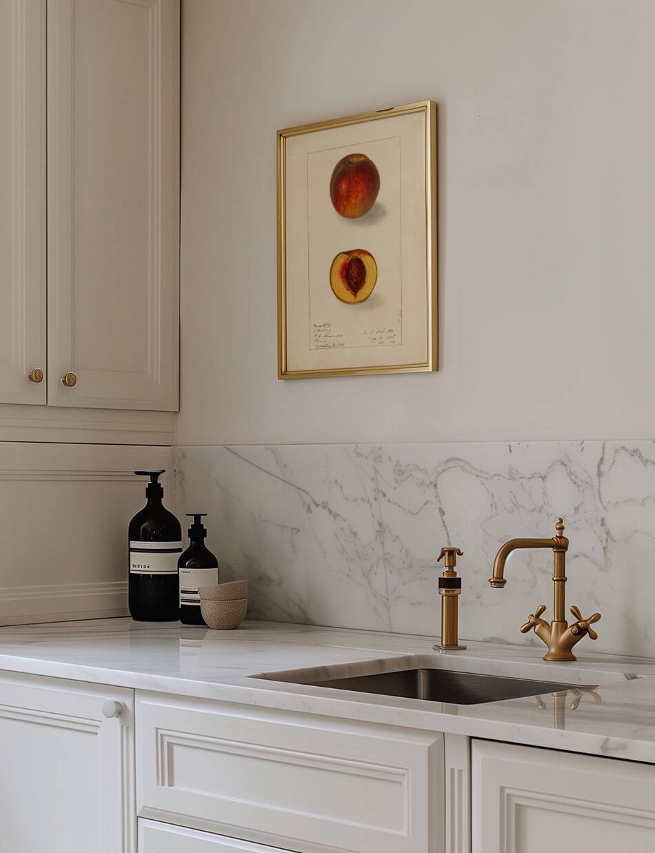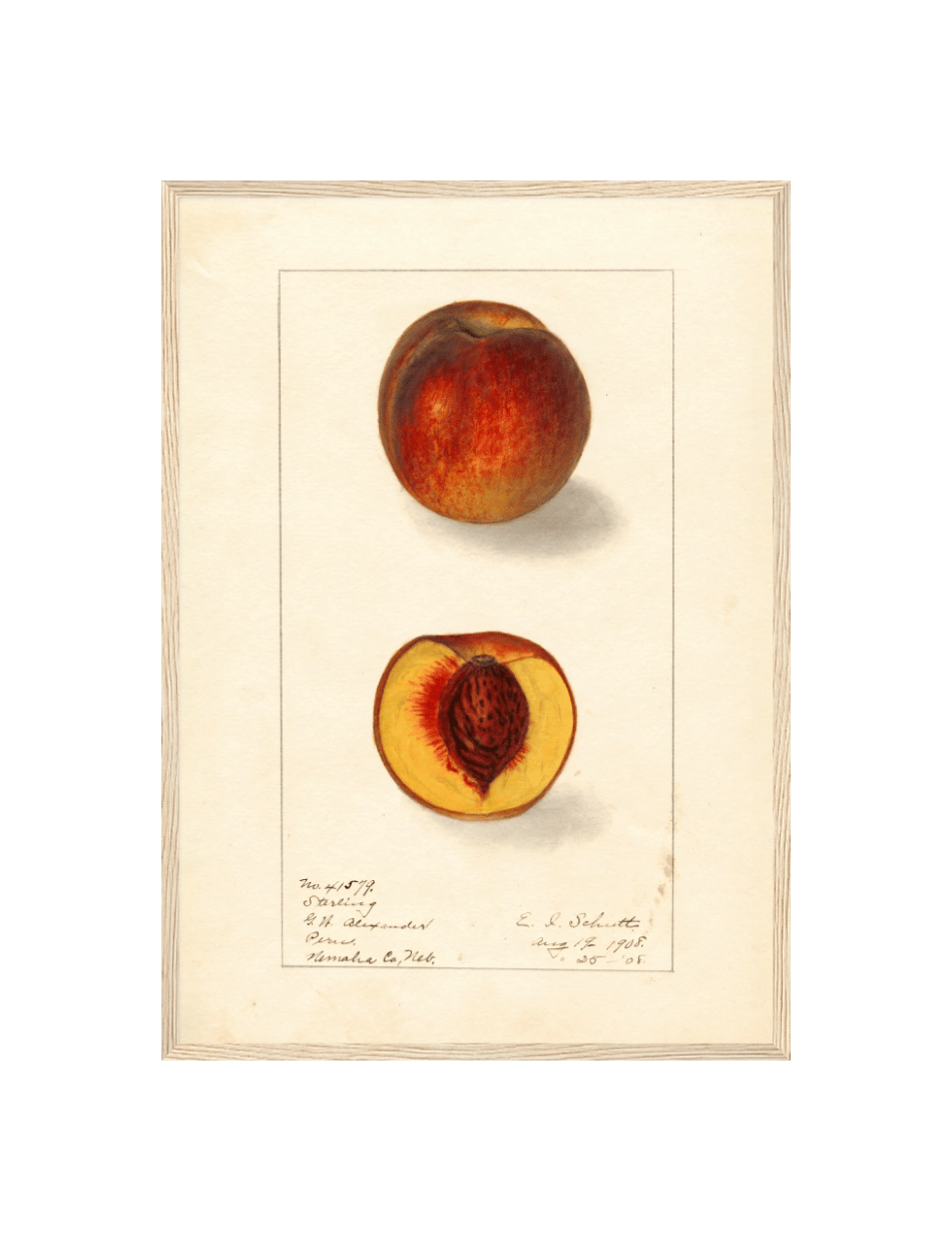 Denne omhyggeligt detaljerede illustration viser en ‘Sterling’ fersken både i hel og halveret form. Den fyldige, rød-gule ydre og den saftige, kerneholdige indre er gengivet med stor præcision, hvilket fremhæver frugtens naturlige skønhed. Ellen Isham Schutt har mesterligt fanget ferskenens tekstur og farve, hvilket gør dette kunstværk til en vidunderlig hyldest til ferskenens delikate elegance.