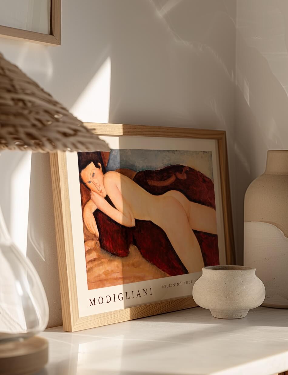 Amedeo Modiglianis “Reclining Nude from the Back” (1917) er et forførende og elegant maleri, der fremviser en nøgen kvinde liggende på maven. Hendes krop er smukt buet, og hendes ansigt vender mod beskueren med et roligt, men intenst blik. Modigliani’s karakteristiske stil er tydelig i de lange, flydende linjer og de bløde farveovergange, som skaber en følelse af harmoni og ro. Værket er et fremragende eksempel på kunstnerens evne til at kombinere sensualitet med en raffineret æstetik.