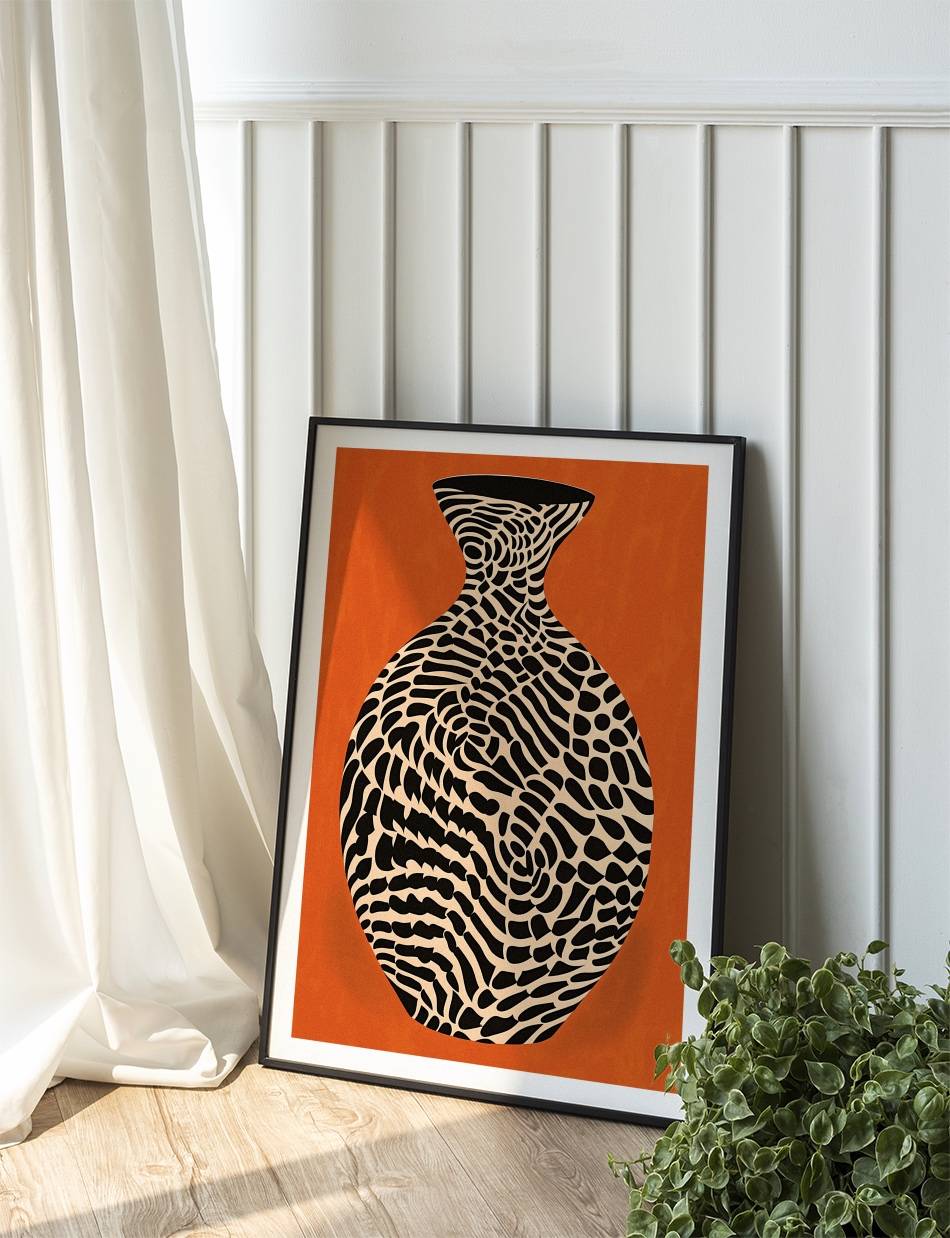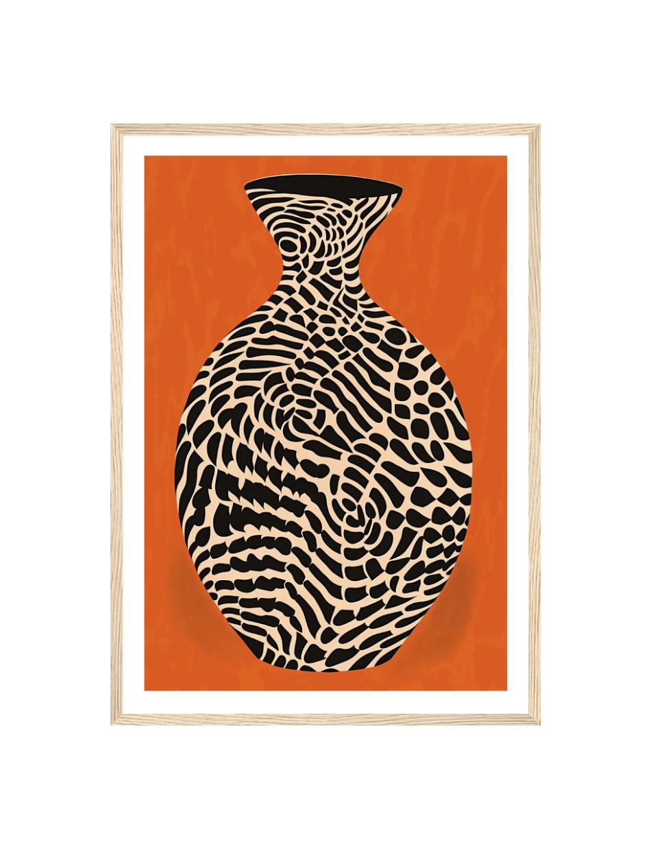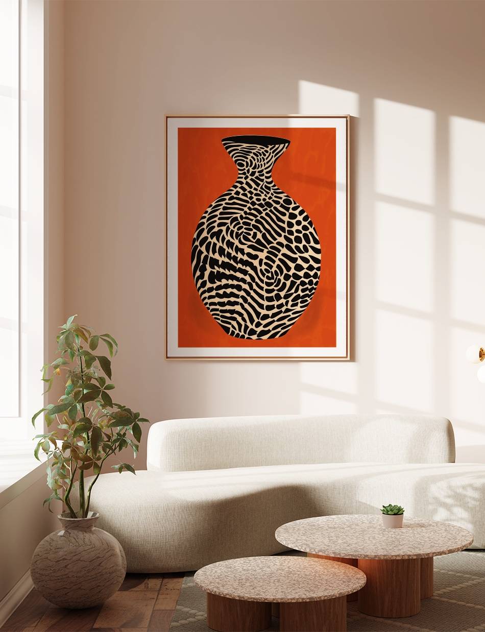 Bring liv til ethvert rum med ‘Rhythmic Contours’. En dristig plakat, der fanger blikket med sit hypnotiske sort-hvide møsnter på en varm, terrakottafarvet baggrund. Denne plakat fremkalder en følelse af bevægelse og energi og er ideel til dem, der sætter pris på kunst, som udfordrer beskueren og indbyder til en nærmere eftertanke.