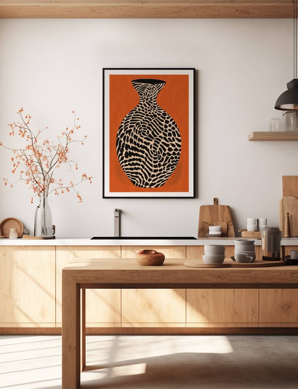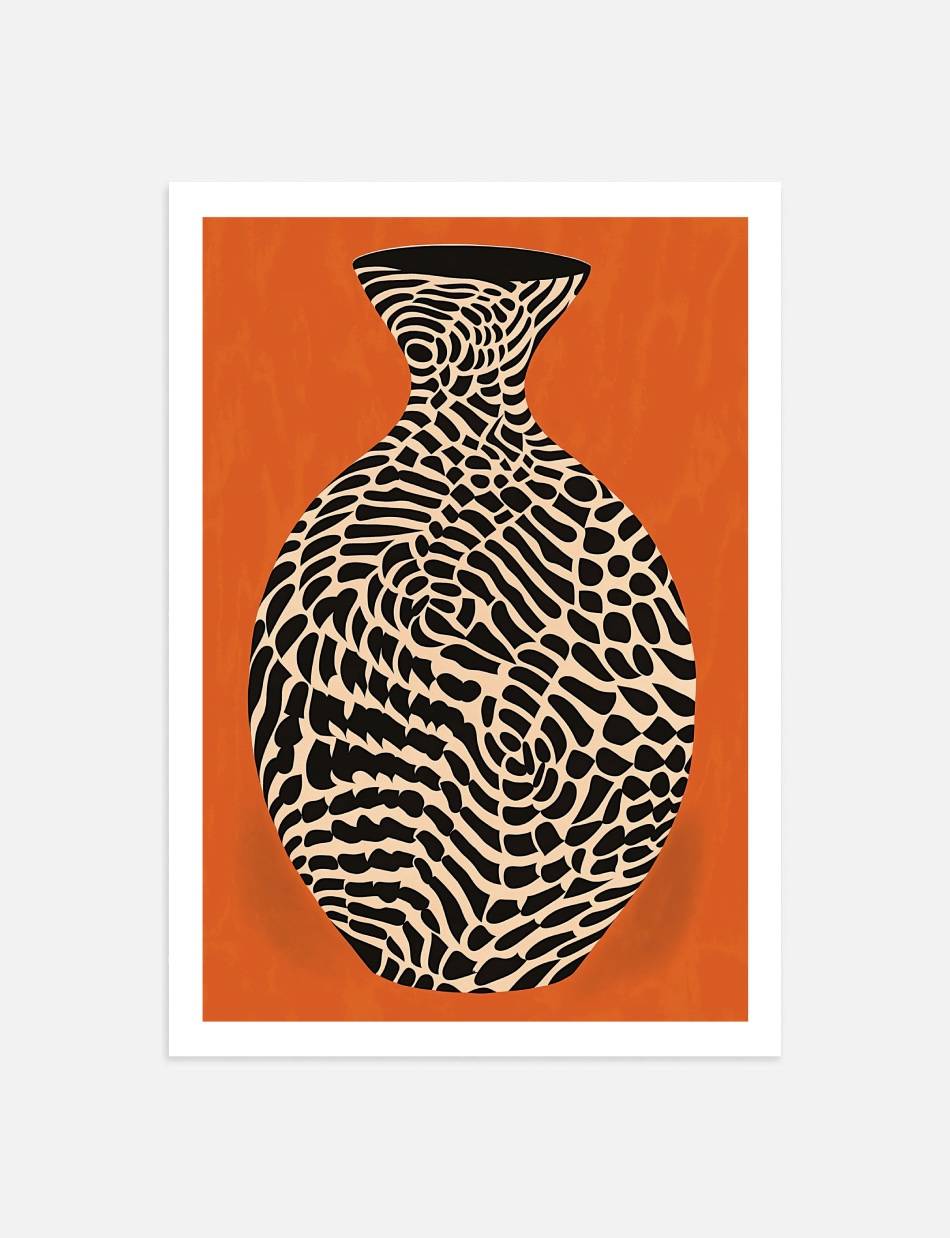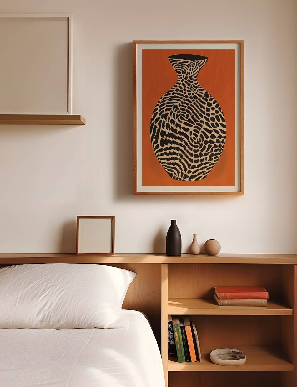 Bring liv til ethvert rum med ‘Rhythmic Contours’. En dristig plakat, der fanger blikket med sit hypnotiske sort-hvide møsnter på en varm, terrakottafarvet baggrund. Denne plakat fremkalder en følelse af bevægelse og energi og er ideel til dem, der sætter pris på kunst, som udfordrer beskueren og indbyder til en nærmere eftertanke.