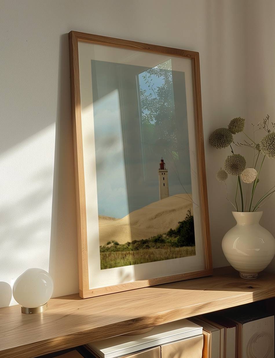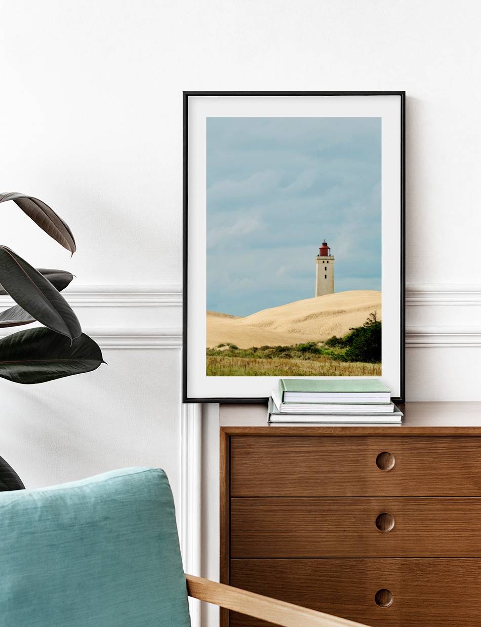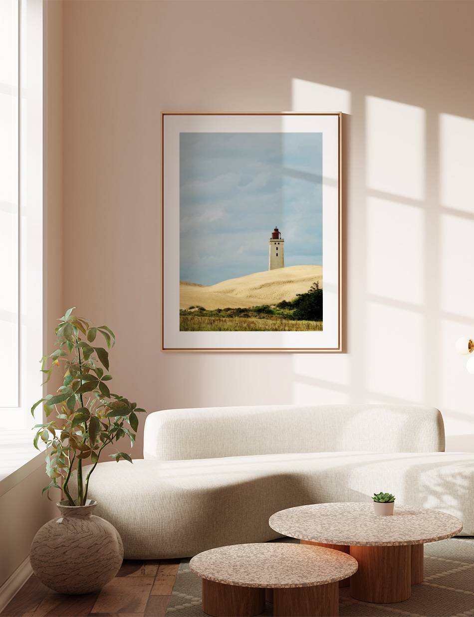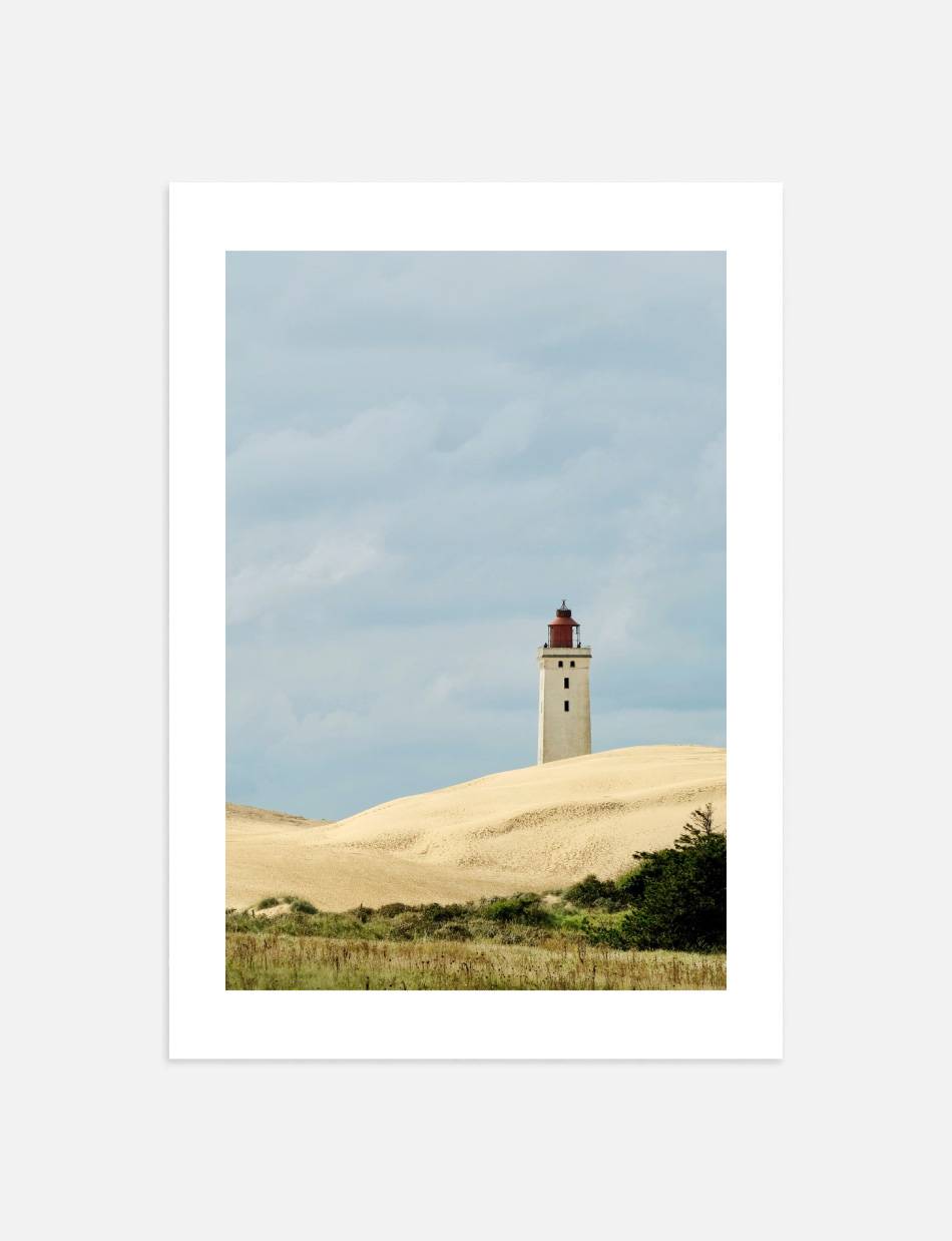 Rubjerg Knude Lighthouse står som en stolt vagtpost mod elementerne, et symbol på håb og vejledning. Denne plakat fanger fyrrets storslåede isolation og skønheden ved den danske kyst.