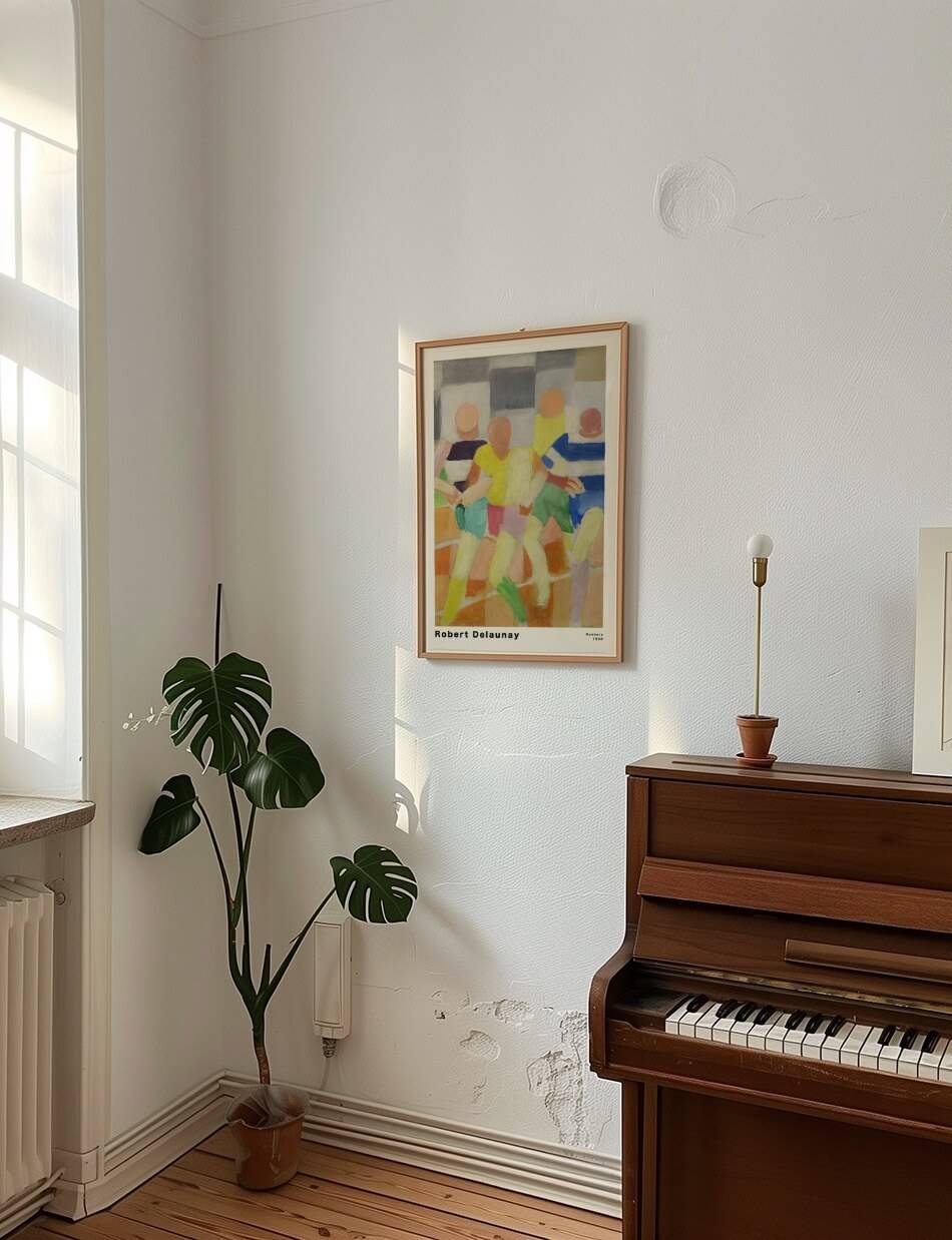 Runners plakaten af Robert Delaunay fanger bevægelsens essens med sit livlige og farverige udtryk. Værket viser en gruppe løbere i aktion, hvor de abstraherede former og klare farver skaber en følelse af hastighed og dynamik. Hver figur er repræsenteret med en unik farvekombination, som understreger både individualitet og fællesskab blandt løberne. Delaunay’s teknik med at bruge farveblokke og enkle former giver værket et moderne, tidløst touch, der fanger intensiteten og glæden ved sportens verden.