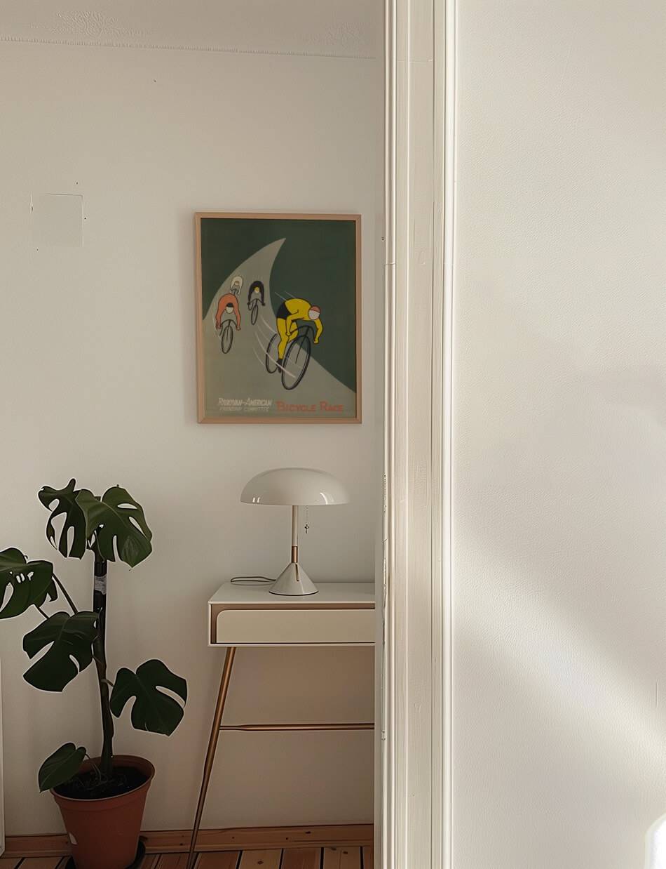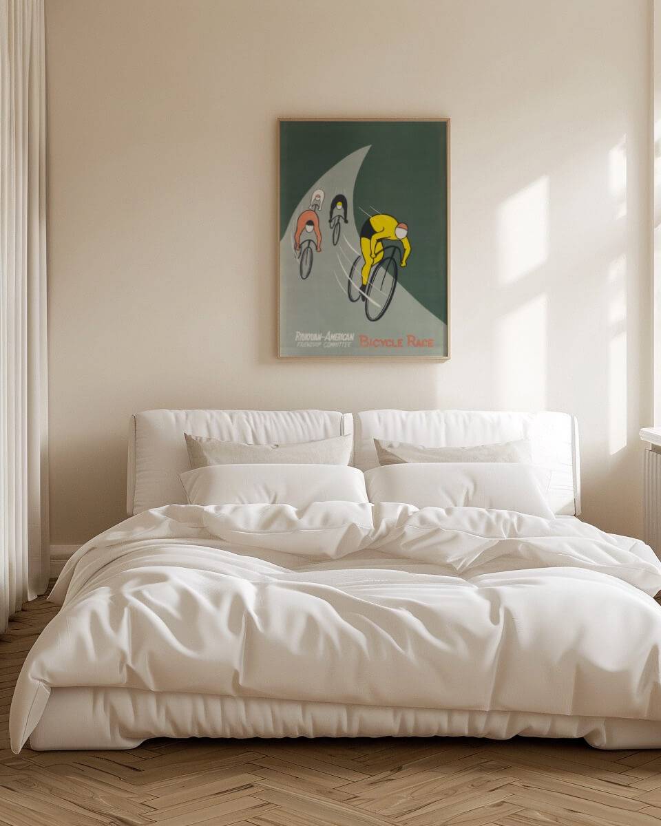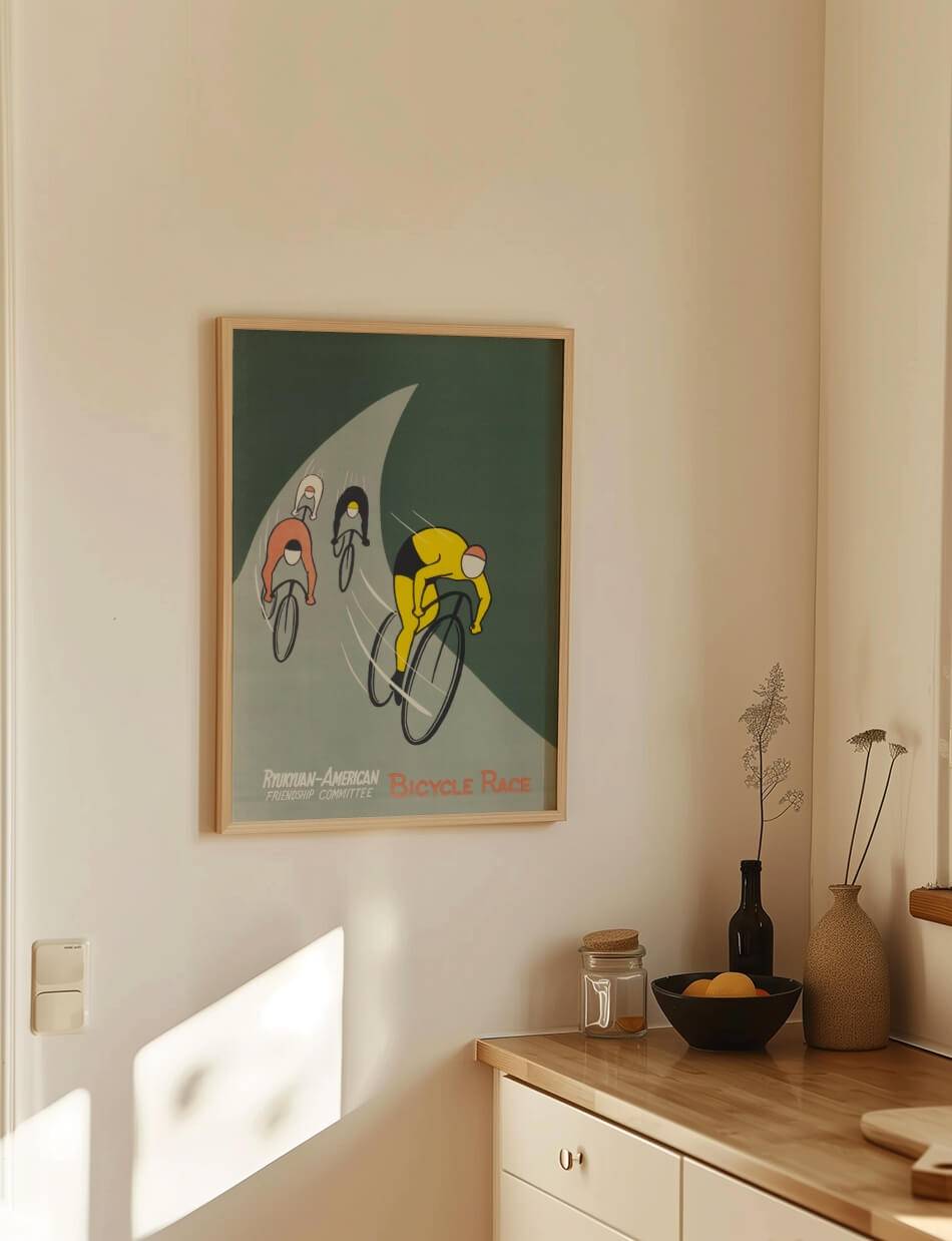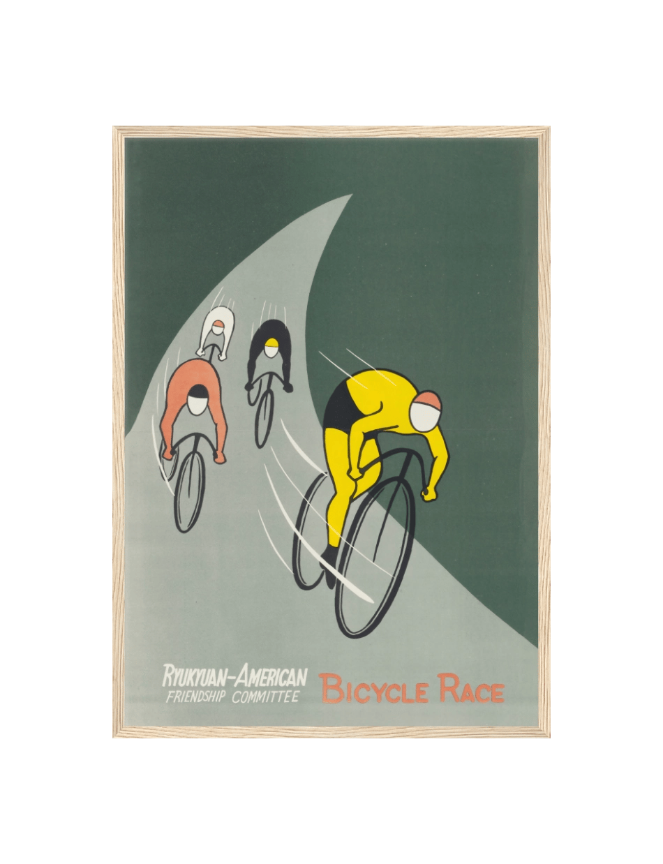 Denne plakat fra 1955, designet af U.S. Information Agency, fanger energien og spændingen ved et cykelløb arrangeret af Ryukyuan-American Friendship Committee. Med enkle, men livlige illustrationer viser plakaten ryttere i skarpe, kontrasterende farver, der racer mod målstregen. De buede linjer og dynamiske figurer fremhæver bevægelse og fart, og indkapsler den sportslige ånd og samarbejde mellem de deltagende nationer.