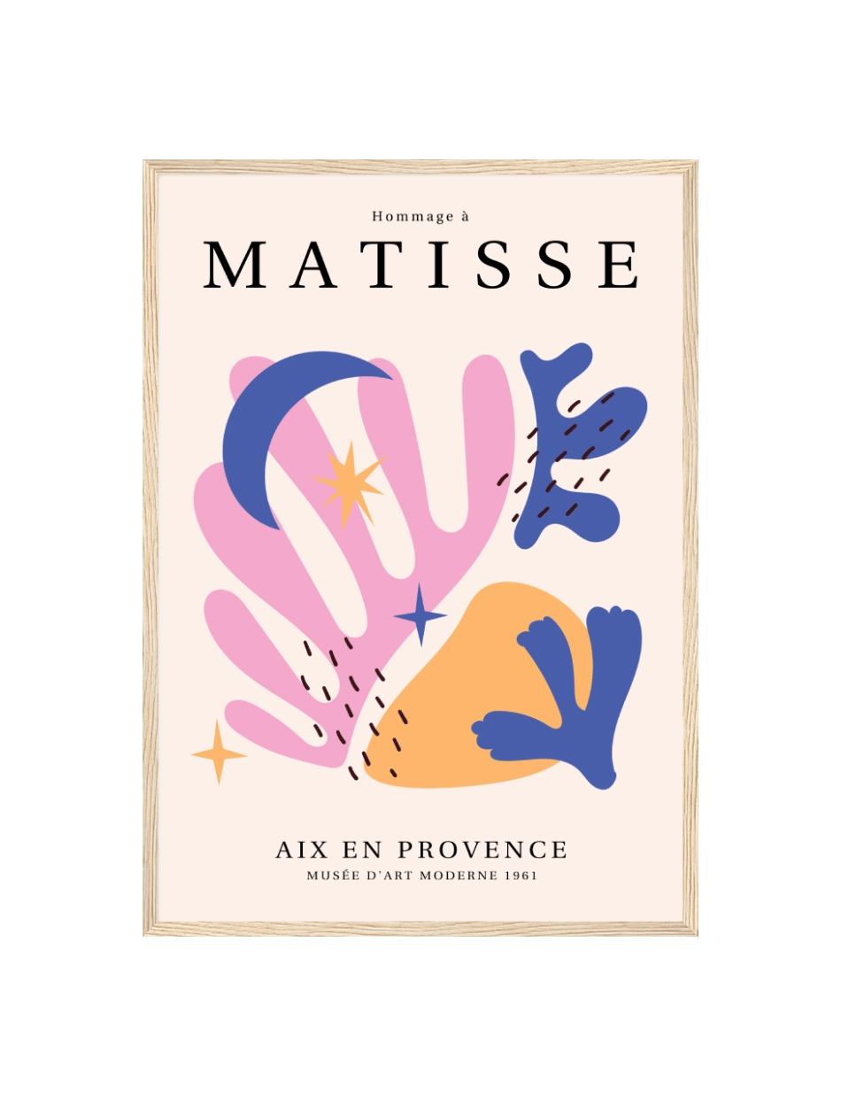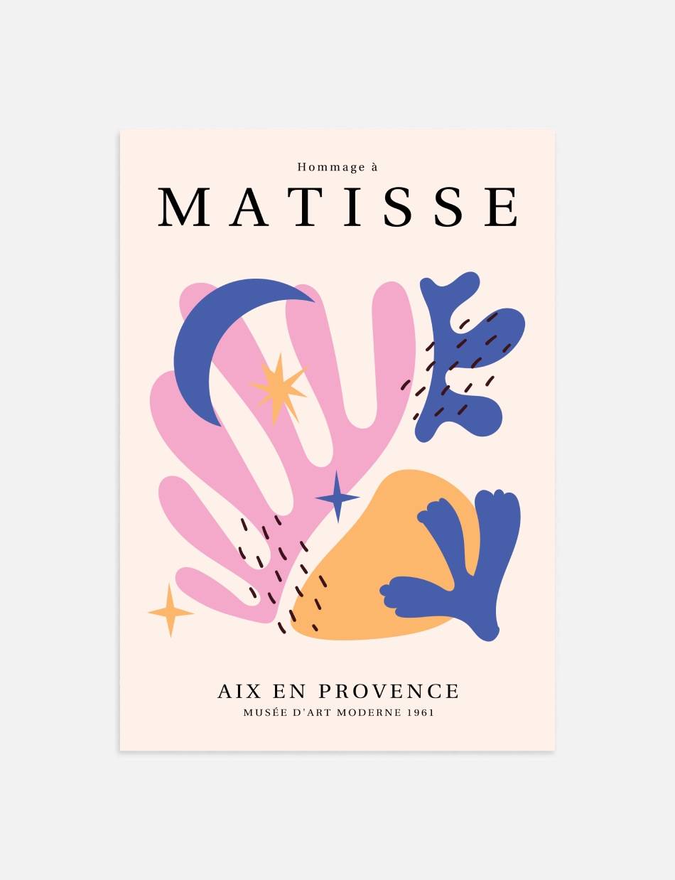 ‘Hommage à Matisse’ er en eksklusiv samling af plakater, skabt til at ære og fejre arven fra Henri Matisse, en af de mest banebrydende kunstnere i det 20. århundrede. Denne samling, som er udarbejdet af Prints Charmings eget design team, formidler Matisse’s enestående brug af farve og form, der revolutionerede den moderne kunst. Hver plakat i samlingen er inspireret af Matisse’s mest ikoniske værker.
