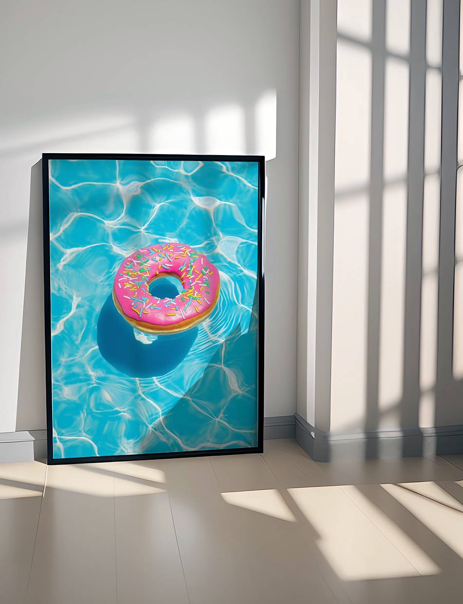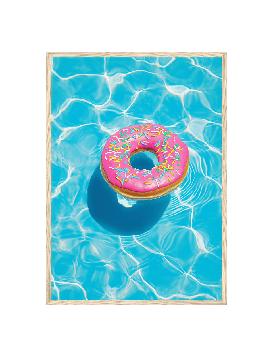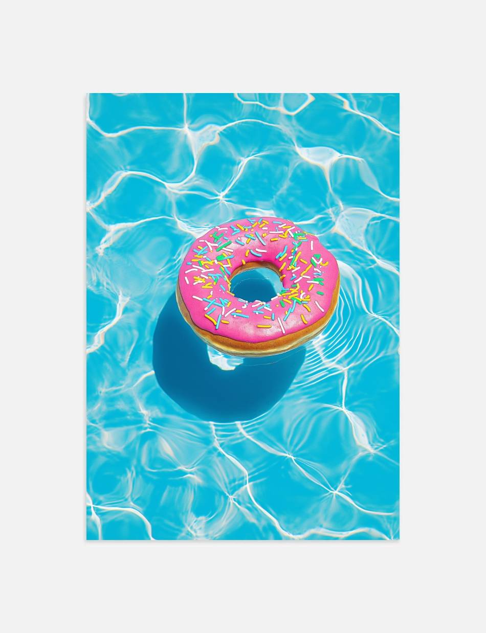 Summer Float er en plakat der indfanger essensen af sommerglæde. Denne levende og farverige fremstilling af en flydende donut i en pool er et symbol på ubekymrede dage og solrige stunder. Med sit iøjnefaldende design og friske farver, er denne foto plakat perfekt til at bringe et strejf af sommerens magi ind i ethvert rum.