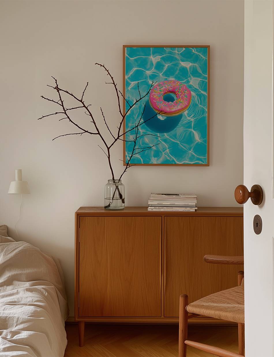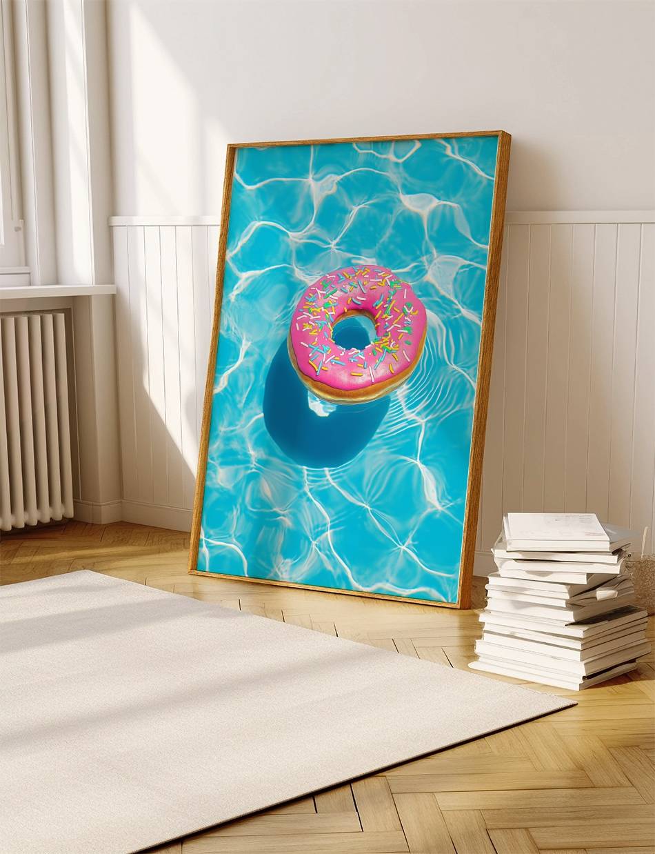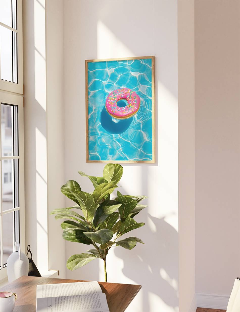 Summer Float er en plakat der indfanger essensen af sommerglæde. Denne levende og farverige fremstilling af en flydende donut i en pool er et symbol på ubekymrede dage og solrige stunder. Med sit iøjnefaldende design og friske farver, er denne foto plakat perfekt til at bringe et strejf af sommerens magi ind i ethvert rum.