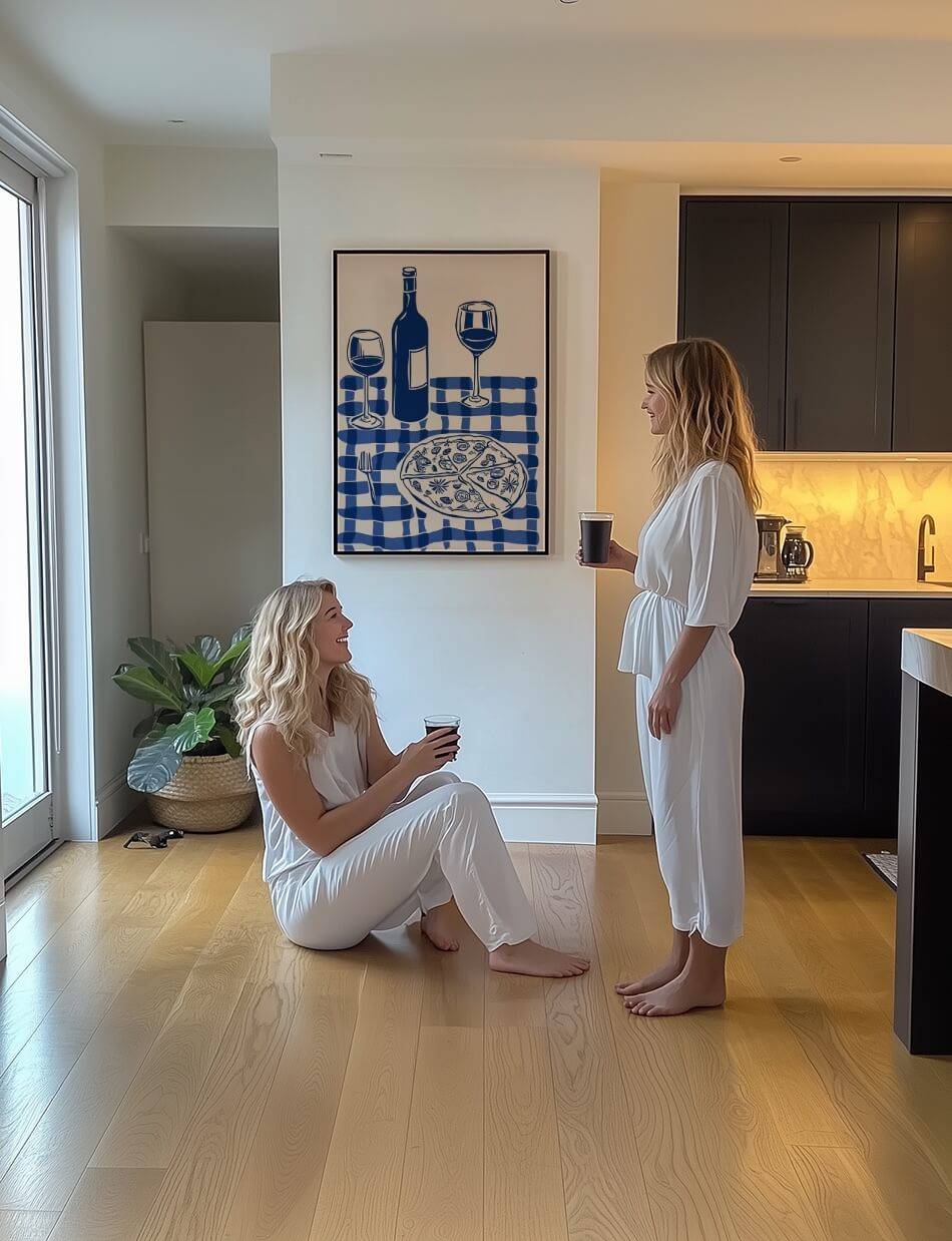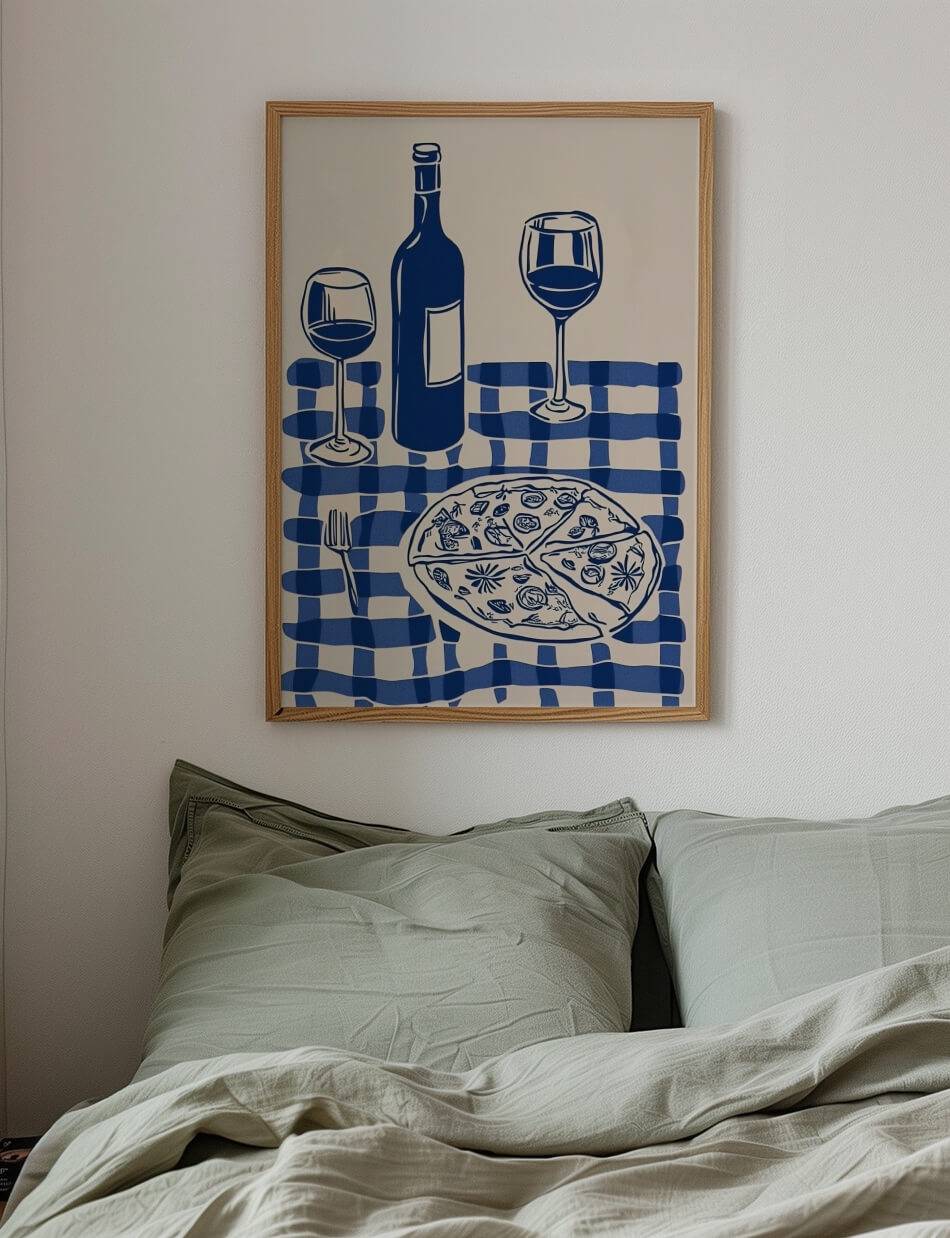 Table for Two Blue er en charmerende illustration, der fremhæver glæden ved et godt måltid og nærværende selskab. Med en monokrom blå farvepalet og et enkelt design viser værket en borddækning med en flaske vin, to glas og en delikat pizza på en ternet dug. Den minimalistiske stil og detaljerne skaber en følelse af varme og afslappethed, som indbyder til at dele øjeblikke med en, der står dig nær. Denne komposition balancerer det kunstneriske og det hverdagslige, hvilket gør værket både elegant og genkendeligt. Table for Two Blue minder os om at nyde livets enkle fornøjelser, hvad enten det er en middag med en ven eller en romantisk aften. Med sin varme og tilgængelige stil taler værket til enhver, der værdsætter hyggelige stunder og godt selskab.