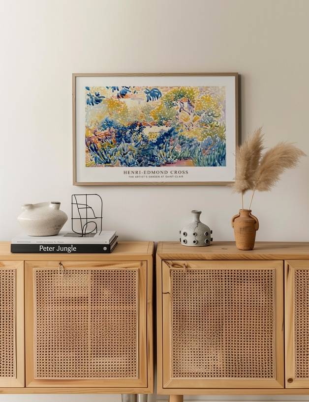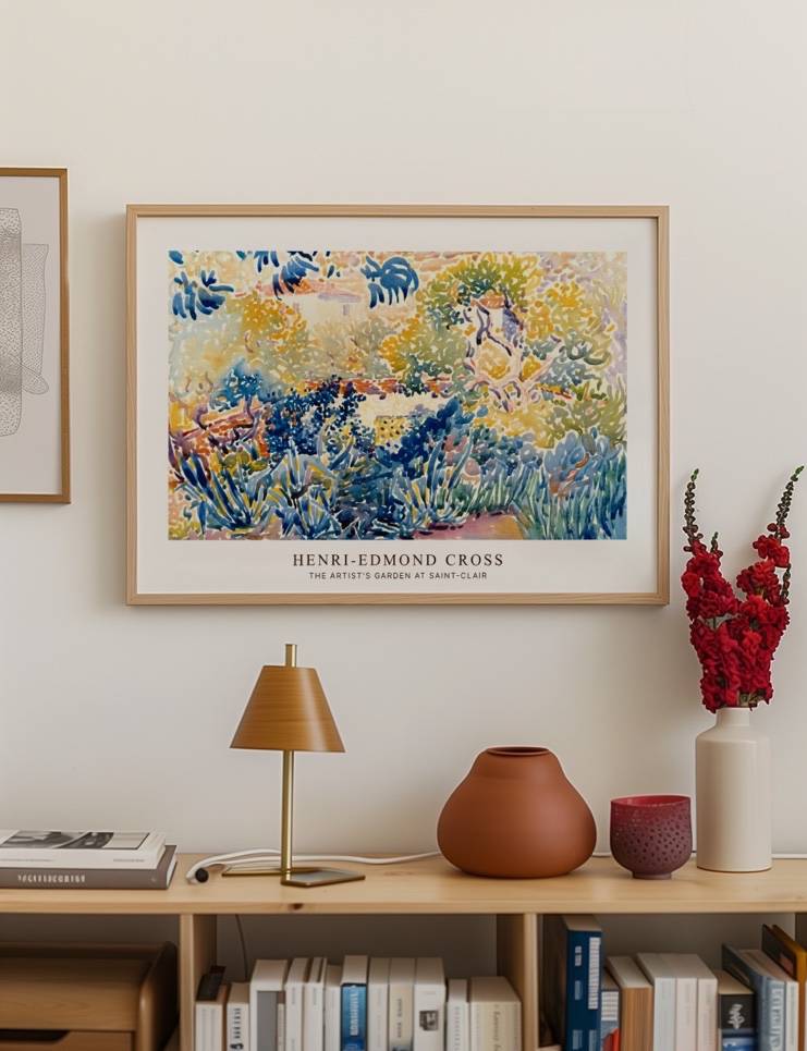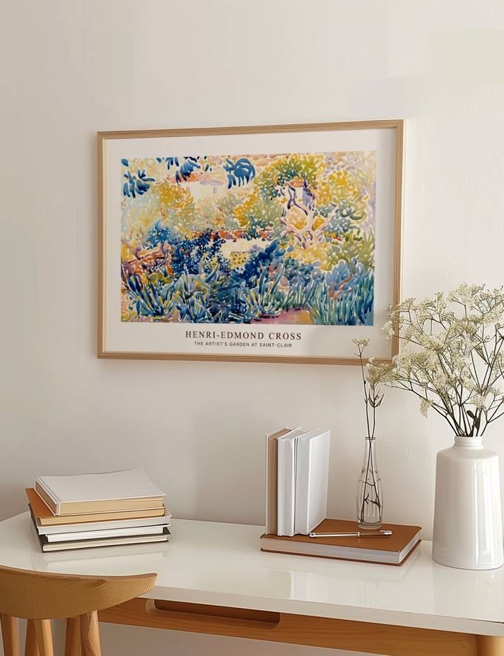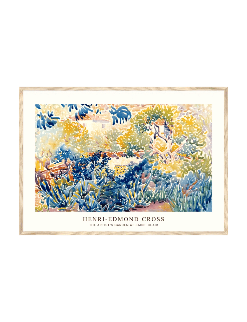 Oplev den livlige og farverige skønhed i Henri-Edmond Cross’ The Artist’s Garden at Saint-Clair. Dette impressionistiske maleri fanger et øjeblik fra en frodig have, hvor solens stråler danser gennem løv og planter i en symfoni af blå, gule og grønne nuancer. Cross’ brug af punktteknik skaber en dynamisk og vibrerende atmosfære, der indbyder dig til at gå på opdagelse i haven og nyde naturens mangfoldighed. Perfekt til kunstelskere, der vil bringe naturens farver og ro ind i deres hjem.