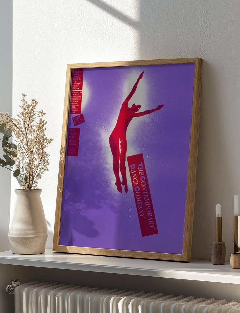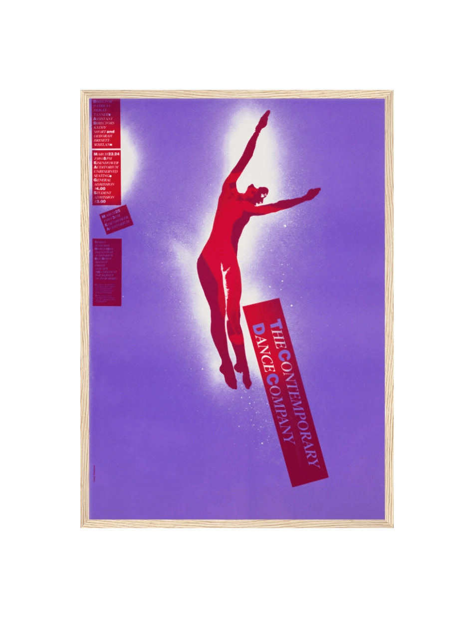 Denne dynamiske plakat af kunstneren Lanny Sommese indfanger essensen af moderne dans. En rød silhuet af en danser svæver graciøst mod en lilla baggrund, omgivet af en aura af hvidt lys. Plakatens stærke farvekontrast og den slanke figurs bevægelse formidler energi og lidenskab.